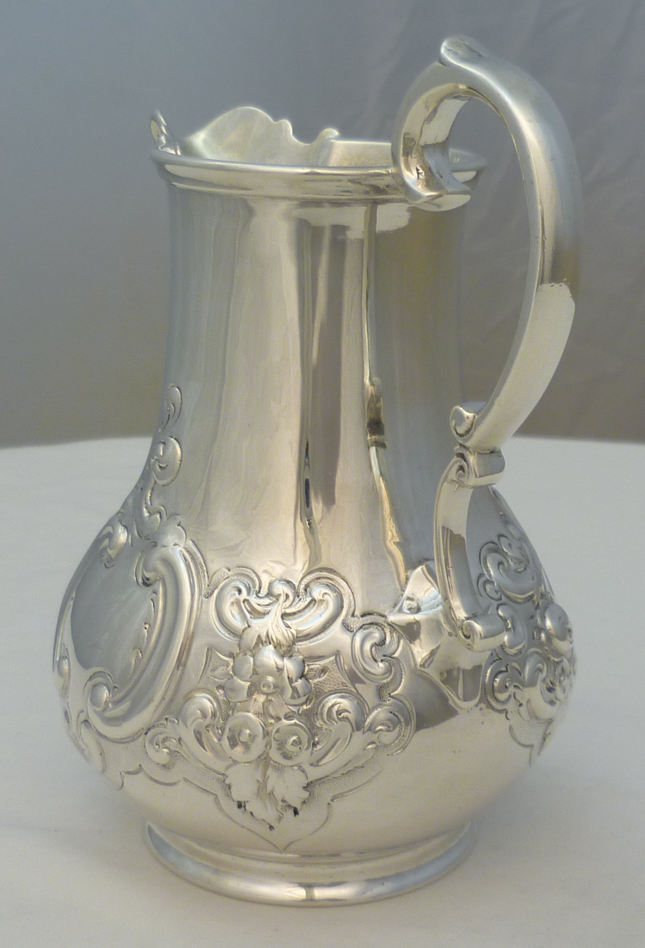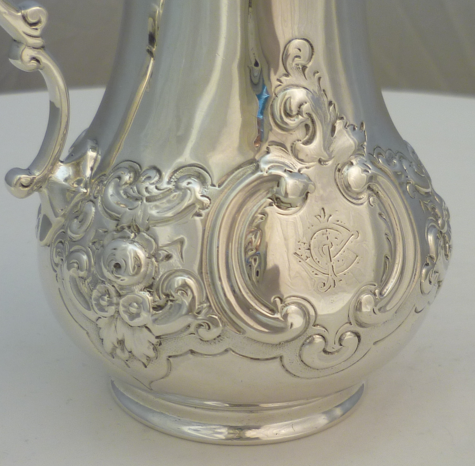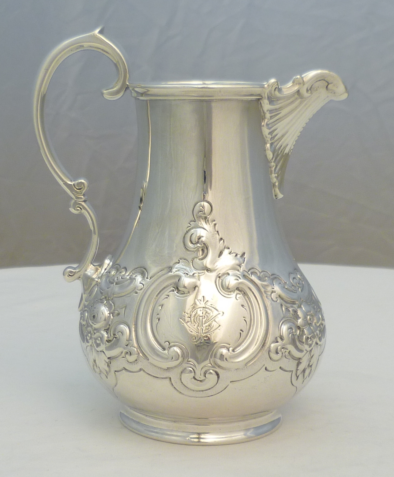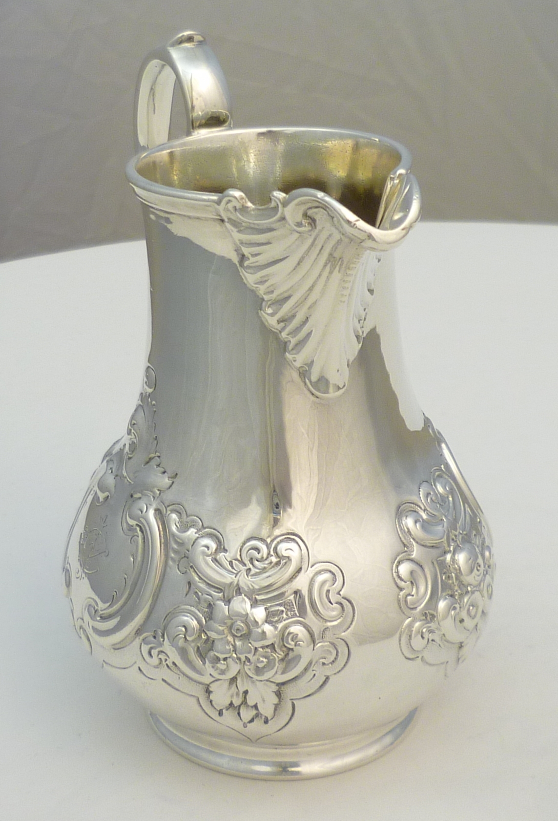 DESCRIPTION | Very good Victorian rococo solid sterling silver milk jug with embossed, cast and engraved decoration, blank cartouche to one side and a monogram engraved cartouche to the other. Thick, heavy silver throughout, a very solid piece. |