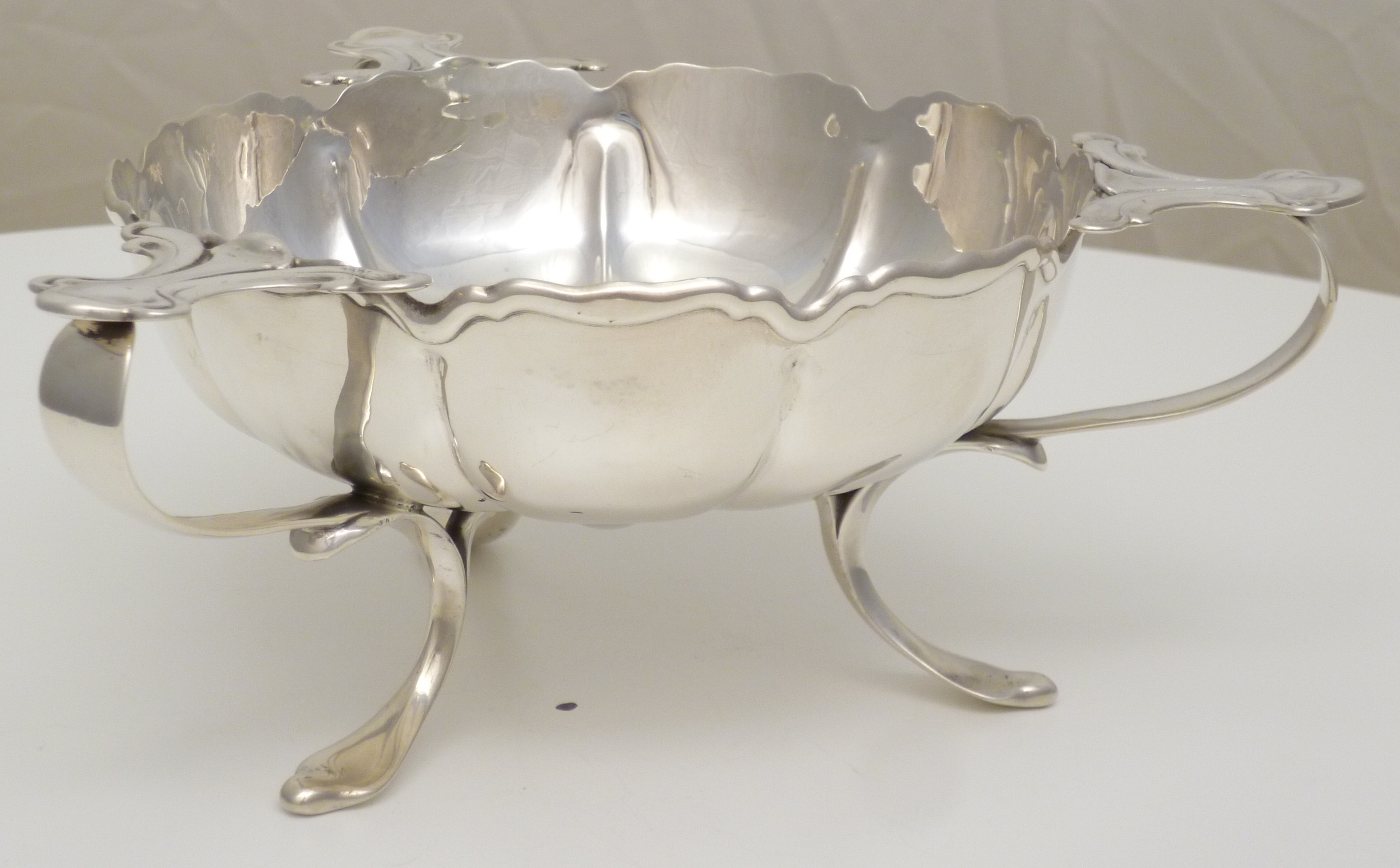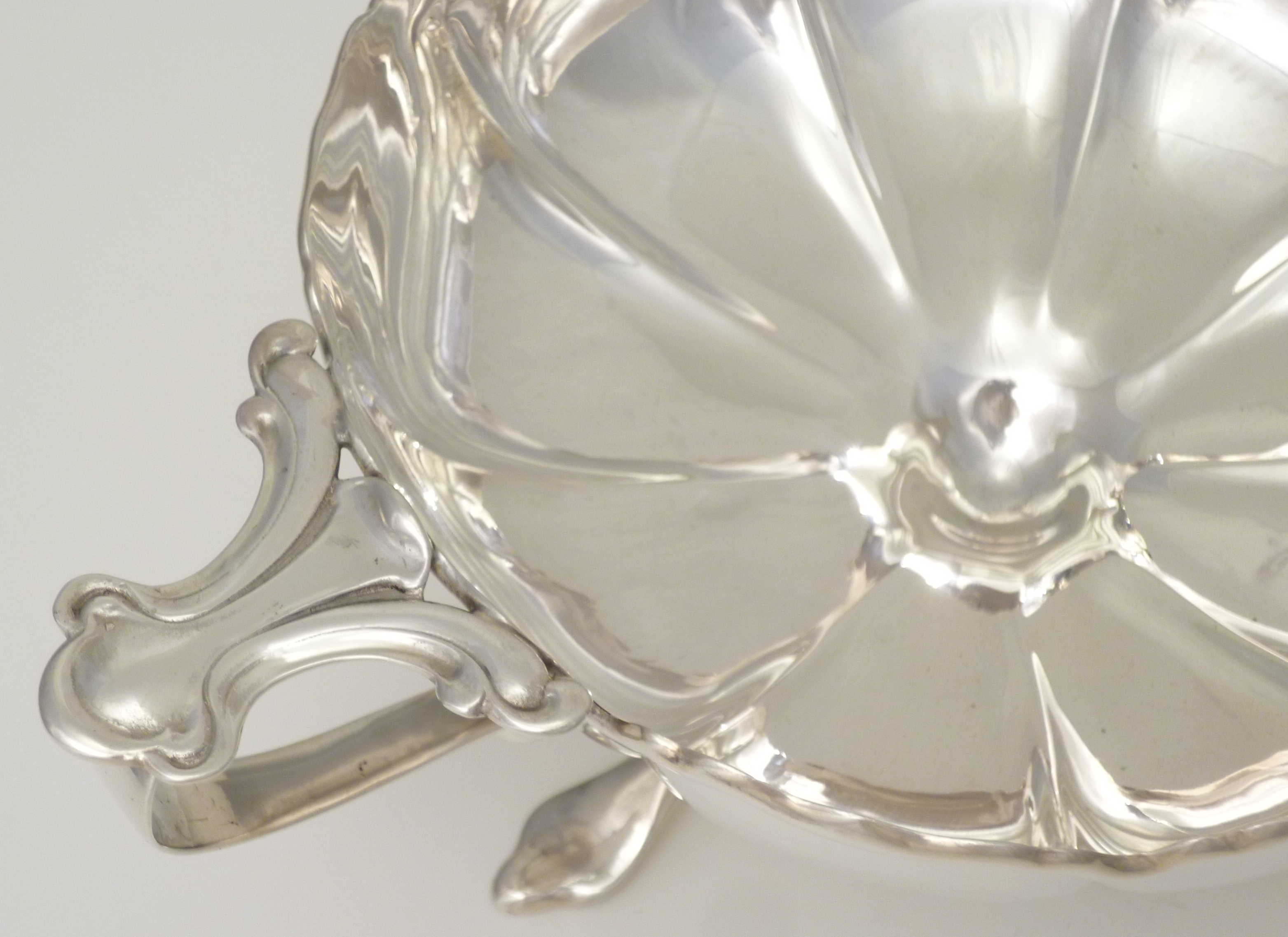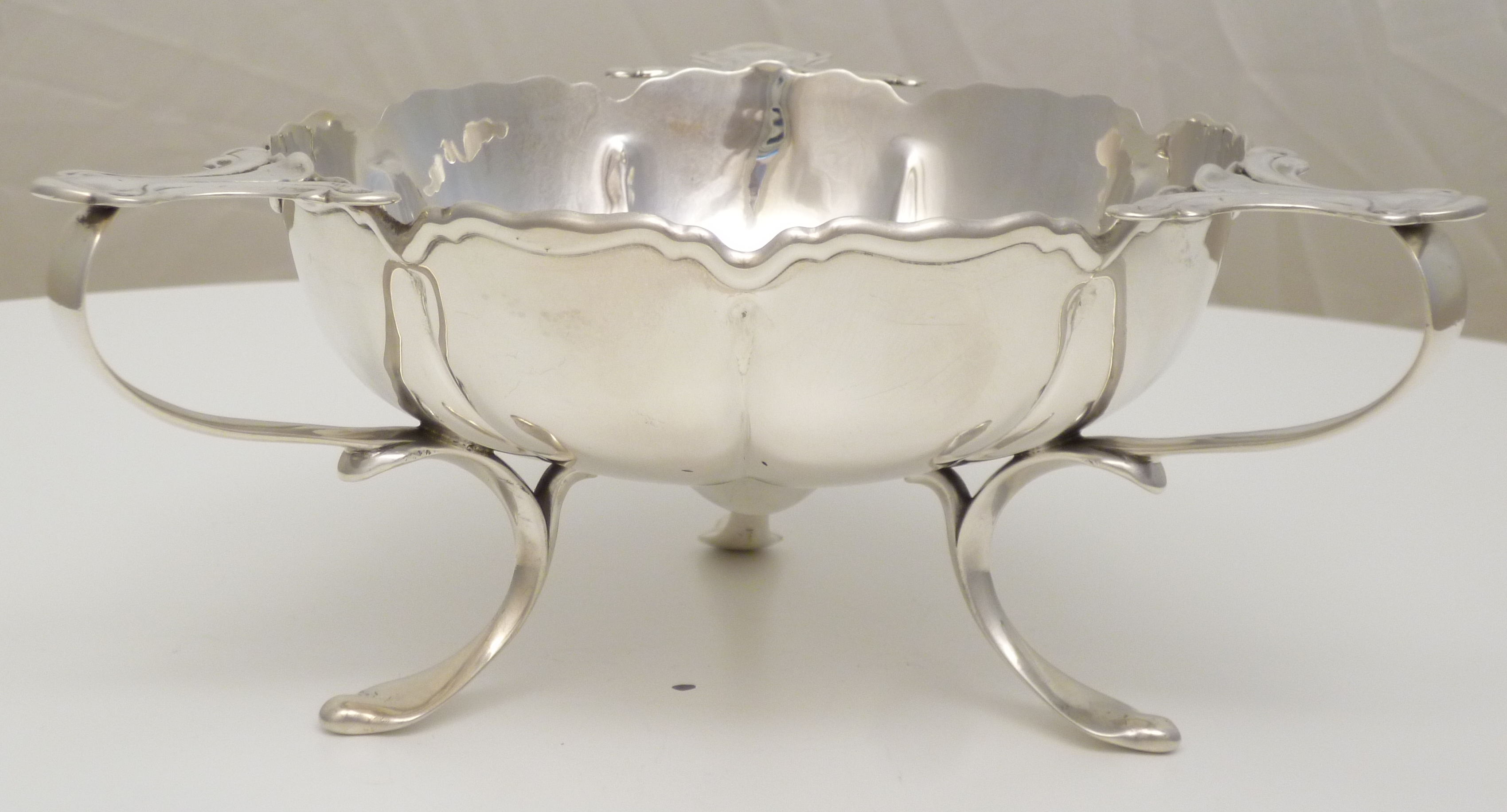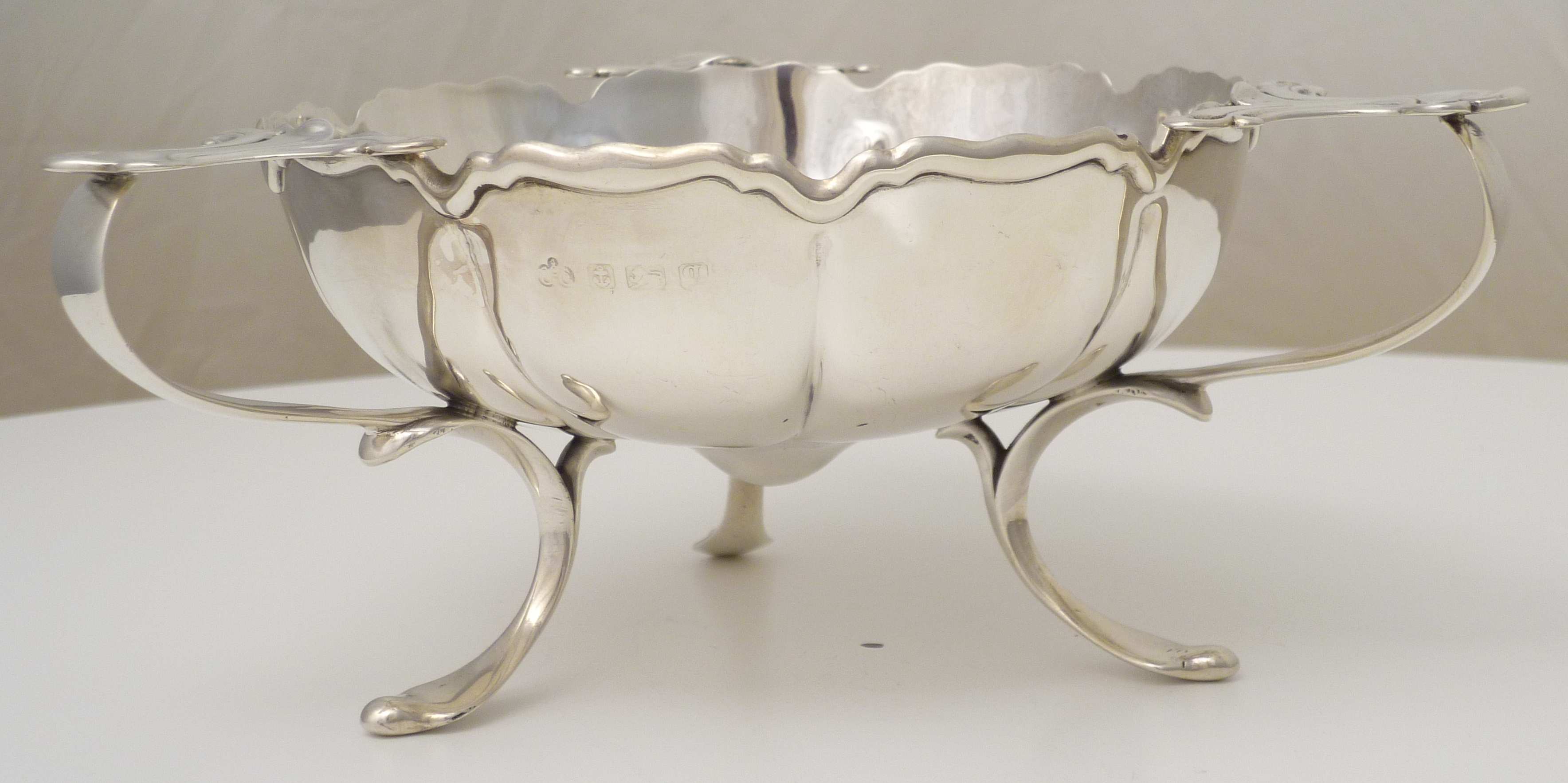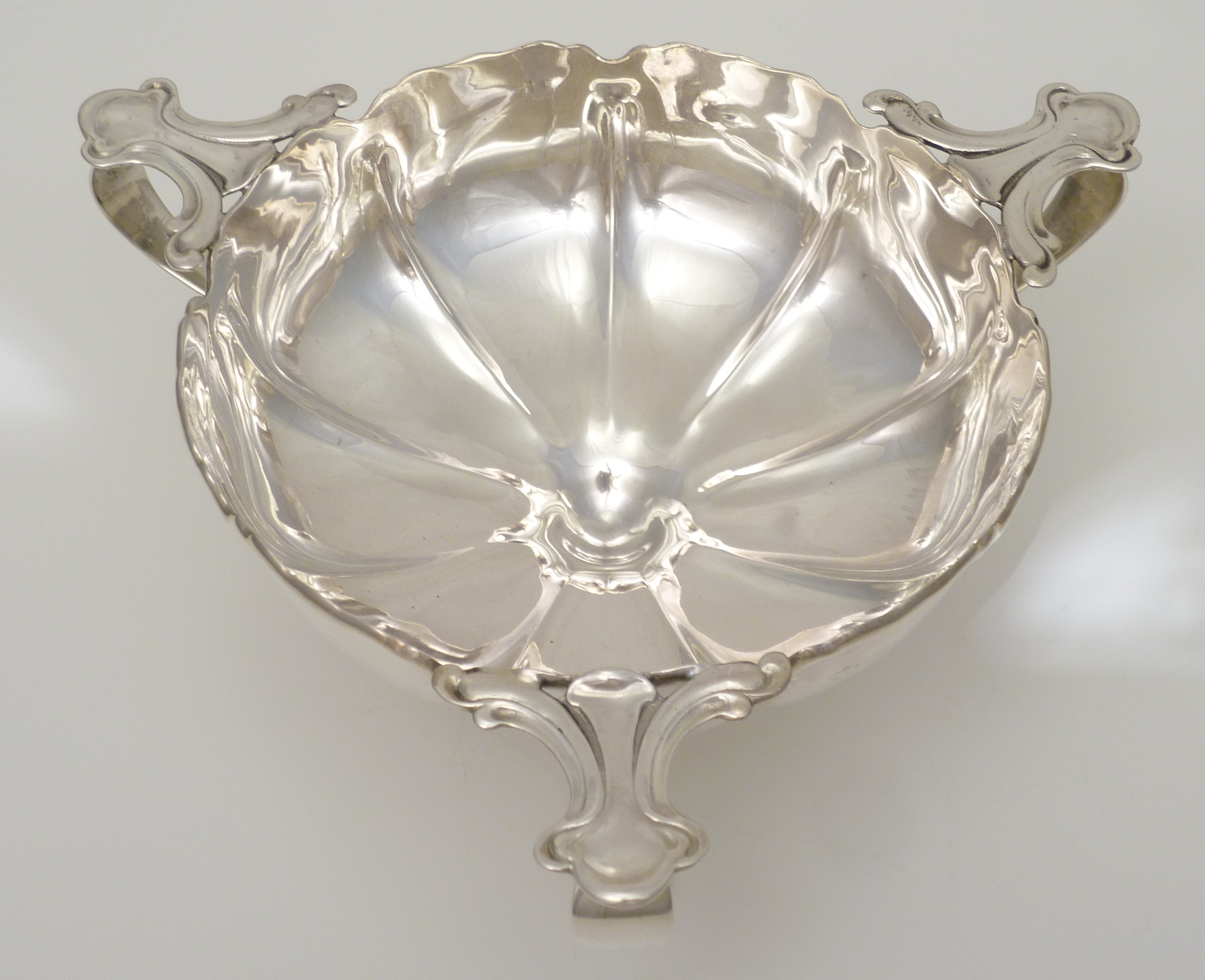 DESCRIPTION | Beautiful and stylish English solid sterling silver antique Art Nouveau bowl with three handles and feet. |