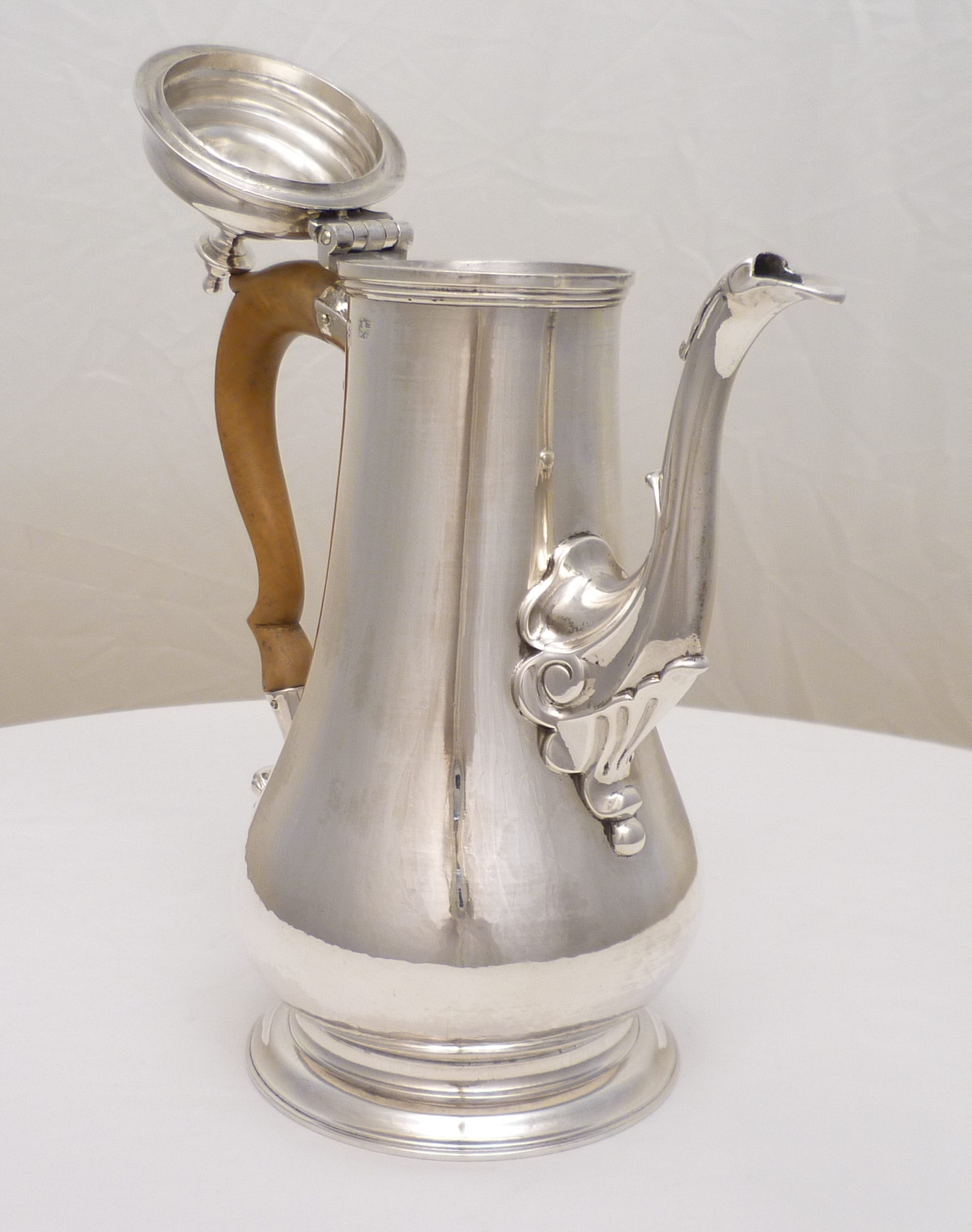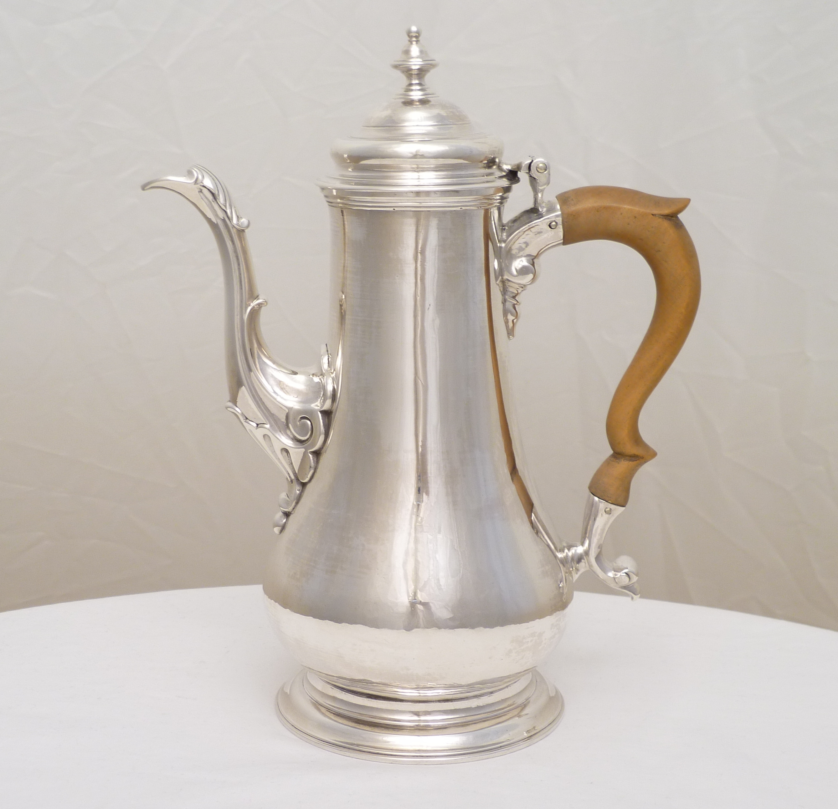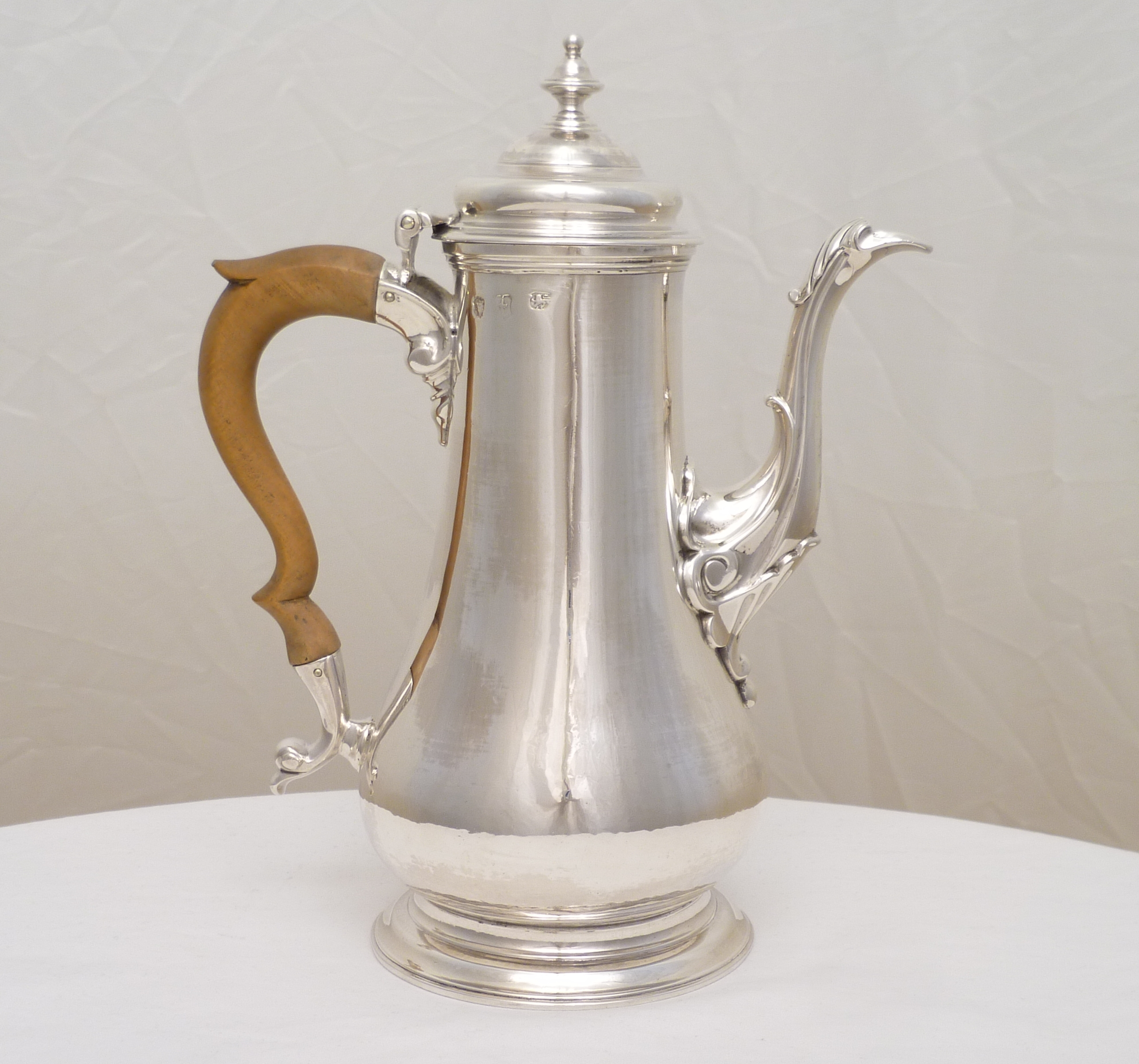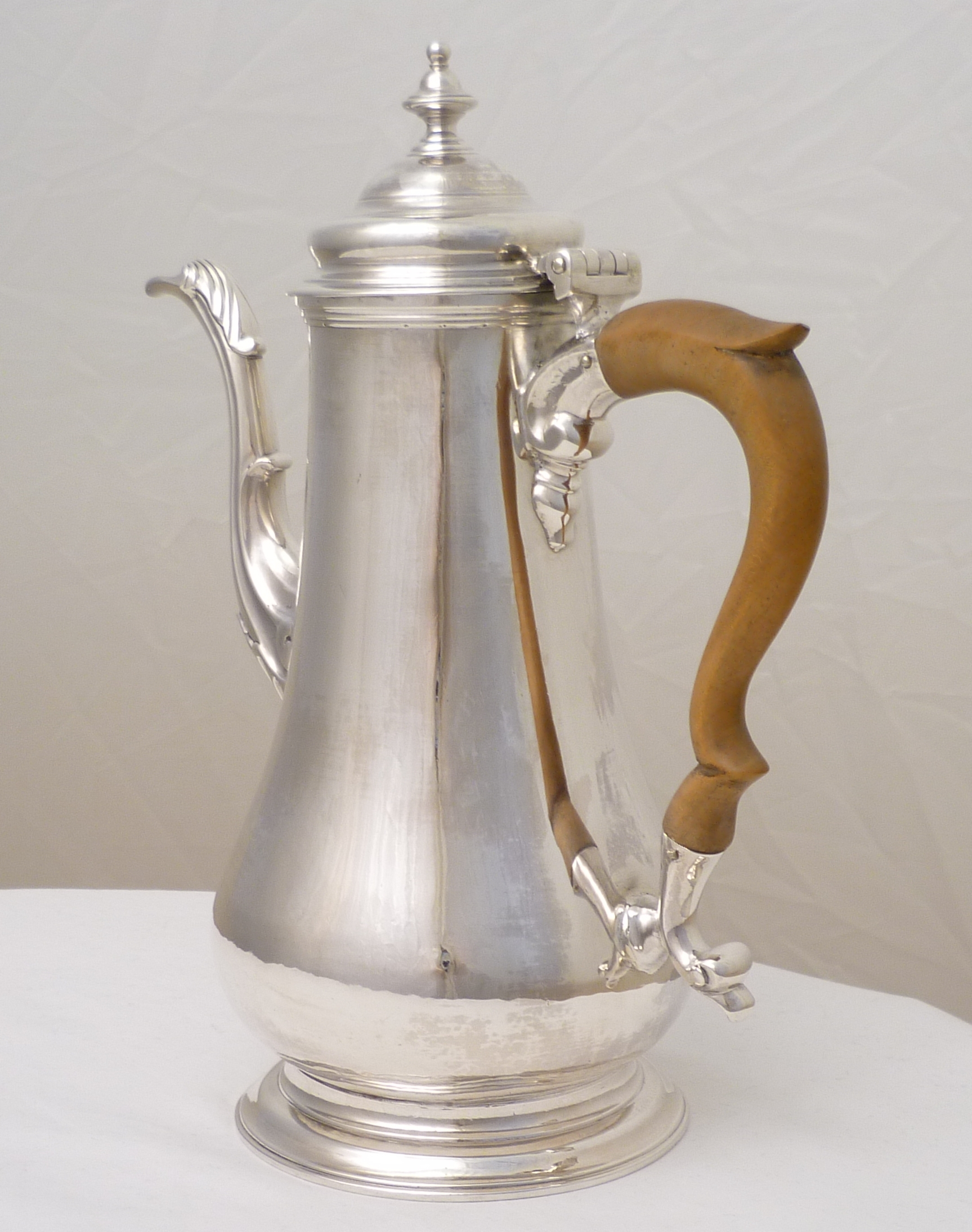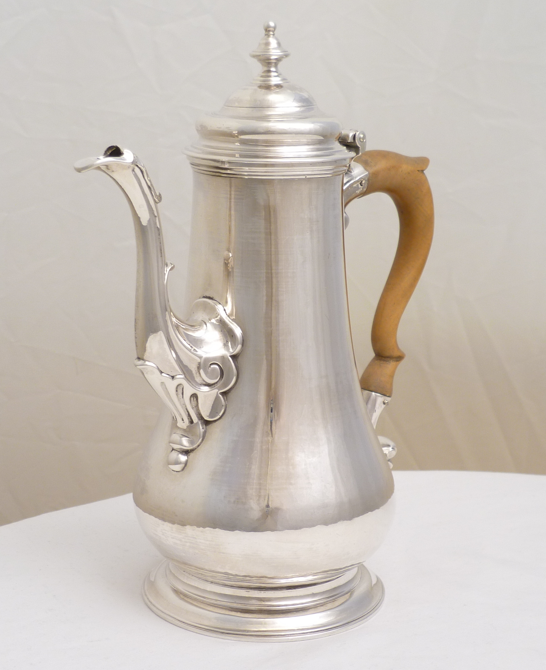 DESCRIPTION | Georgian solid sterling silver baluster form coffee pot with a carved wood, probably box, handle. Clear hallmarks just below top rim with maker's and discreet initial engraving under the base. Holds 27 fl. ozs. or 800ml. |