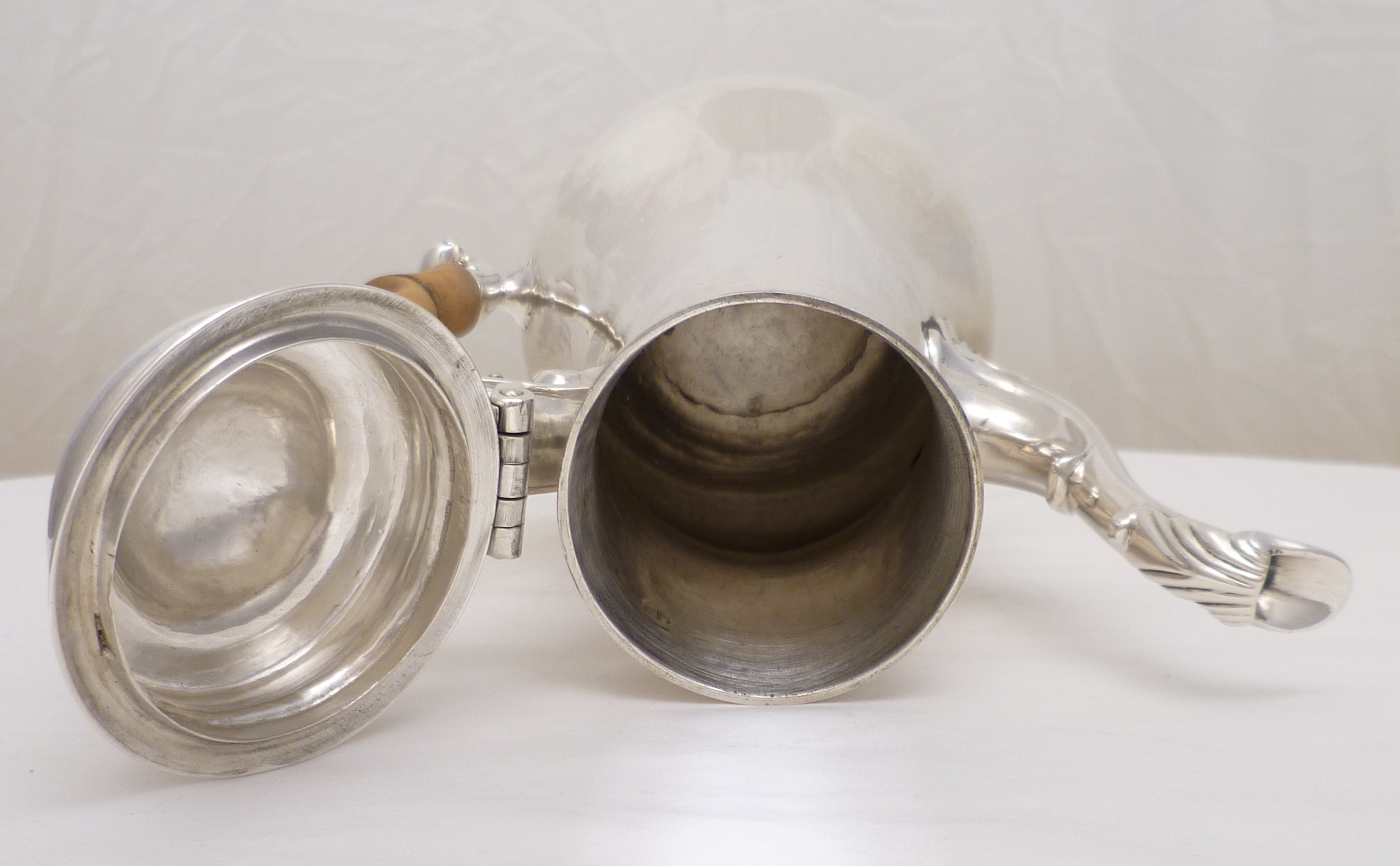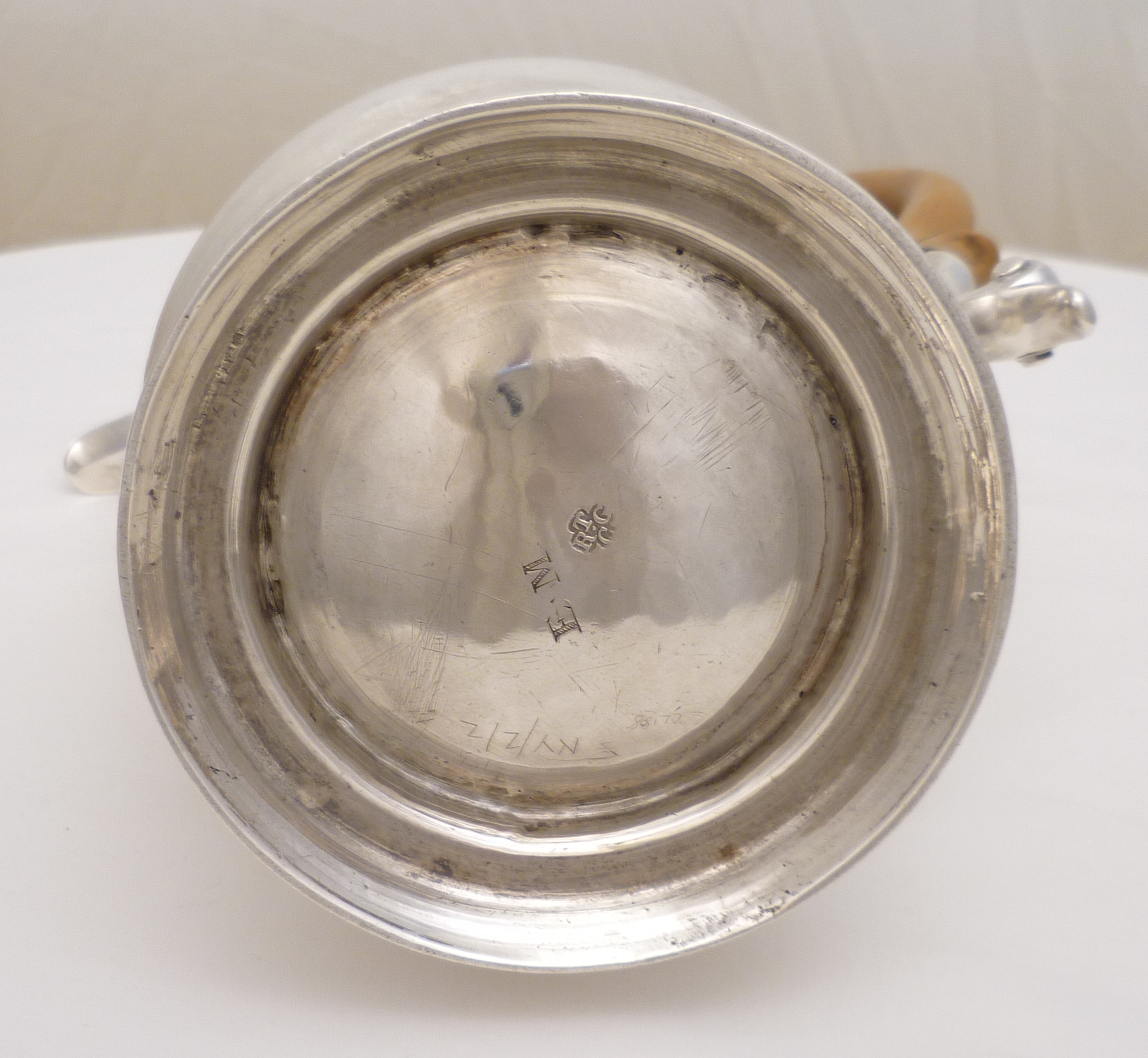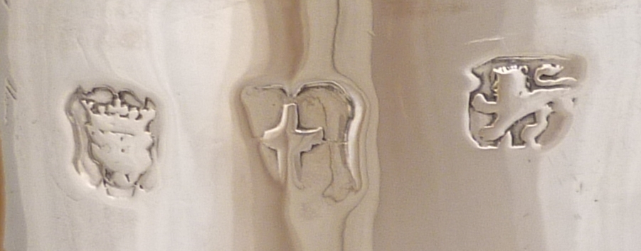 CONDITION | excellent. When I found this pot it was black and difficult to see what the true condition was so I have had it professionally cleaned and polished throughout. It is now fit for food (drink) use and is rather bright and shiny but this will settle down with time and use. There are no engravings or erasures and so none of the associated thin spots which is rare on objects of this type and age. A feature of the manufacture is a thin greyish layer over the surface of the metal that has been given the unpleasant names of fire skin or fire stain. The colour is actually copper atoms and if you would like to know more about the chemistry just ask me. When new the grey would cover the entire surface so would not be noticed. Rubbing and polishing over the years removes the grey layer in places but this is all hidden by the milky surface of used silver. You might be able to see the grey patches in my images, my photographic set up tends to accentuate them after a recent professional polish. They will settle back down as the surface becomes milky again with time and normal use. Also, under more ordinary domestic lighting they are less noticeable. |