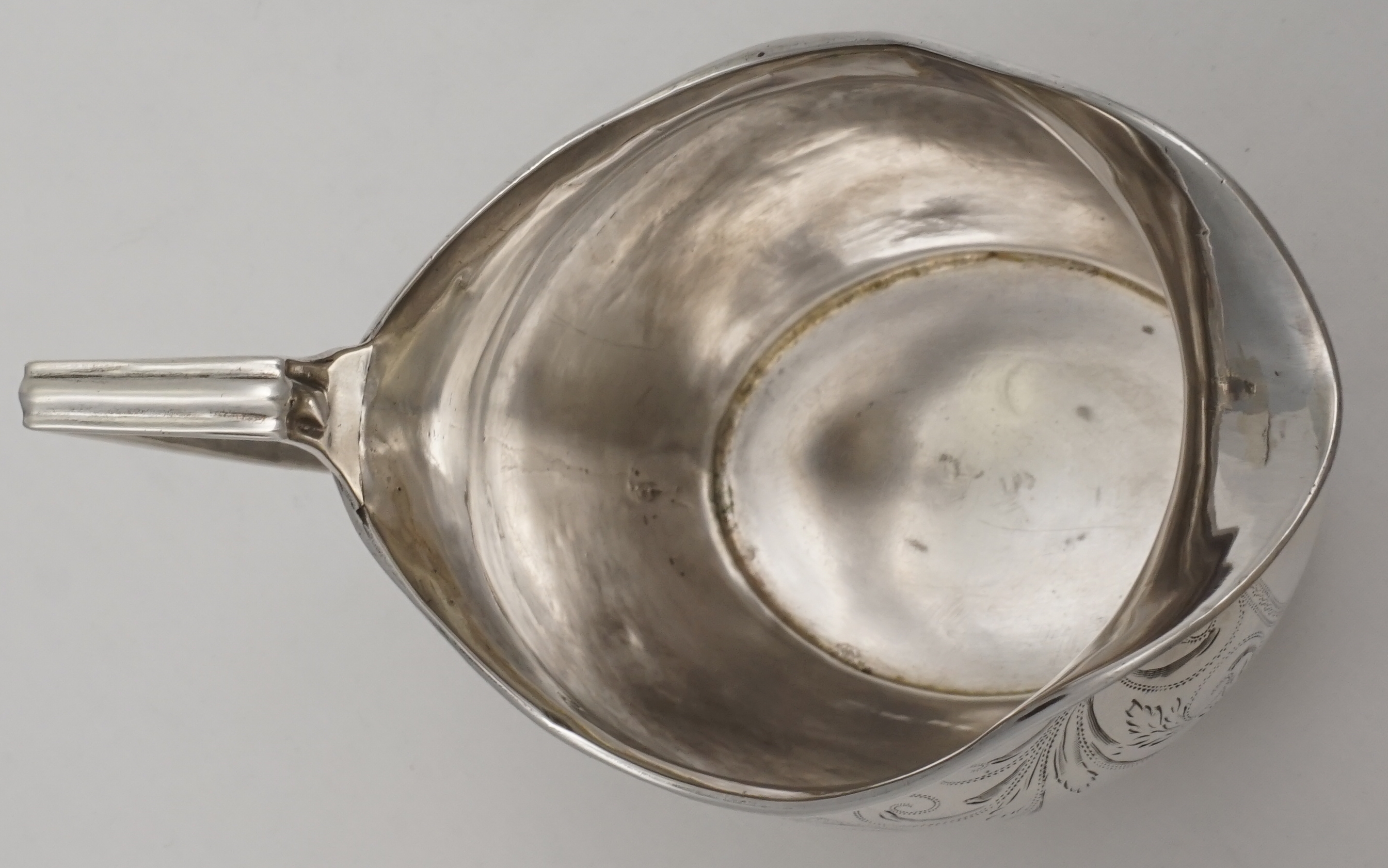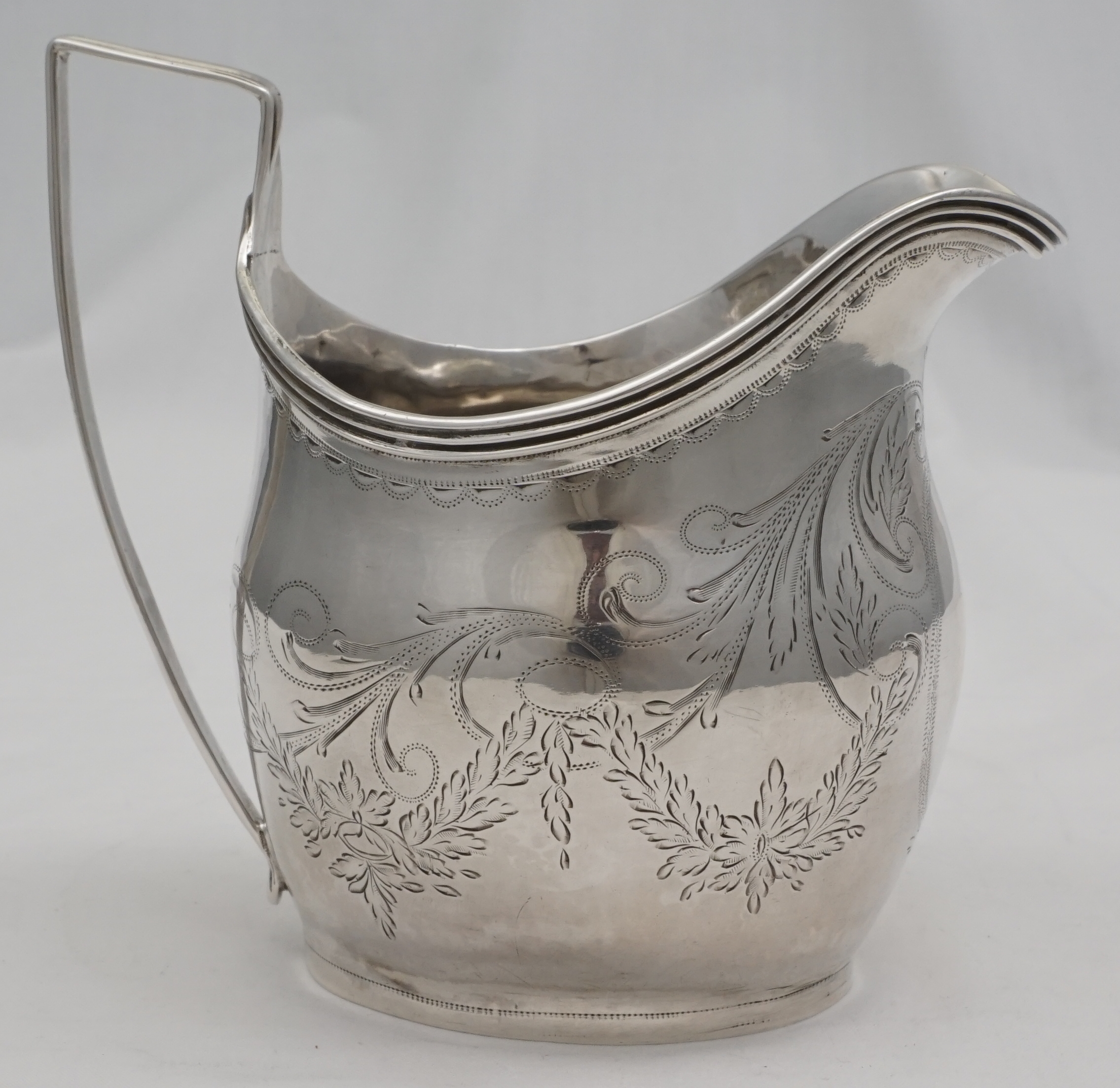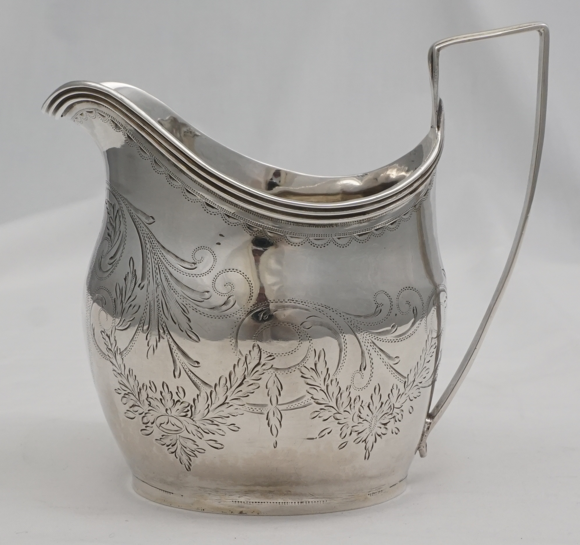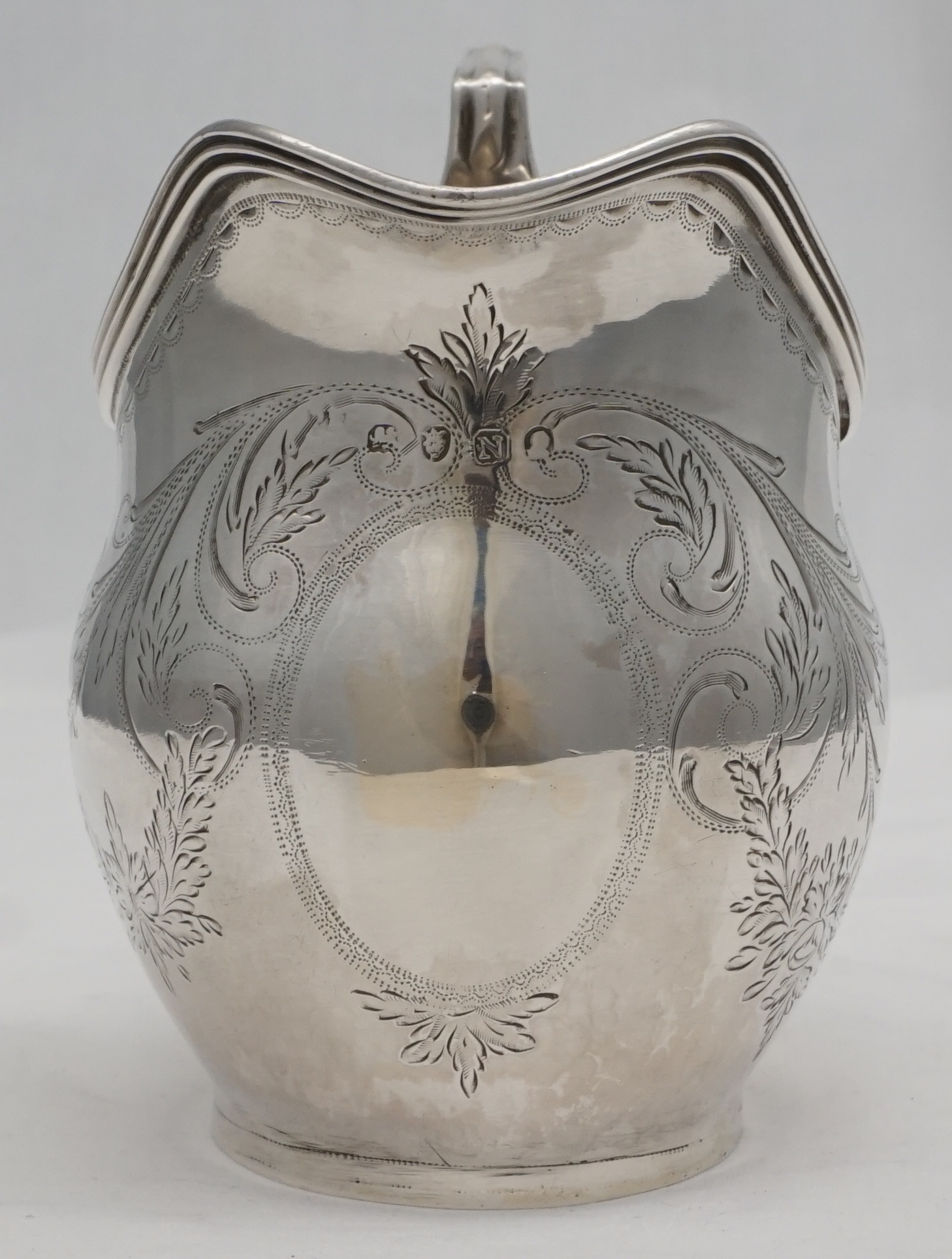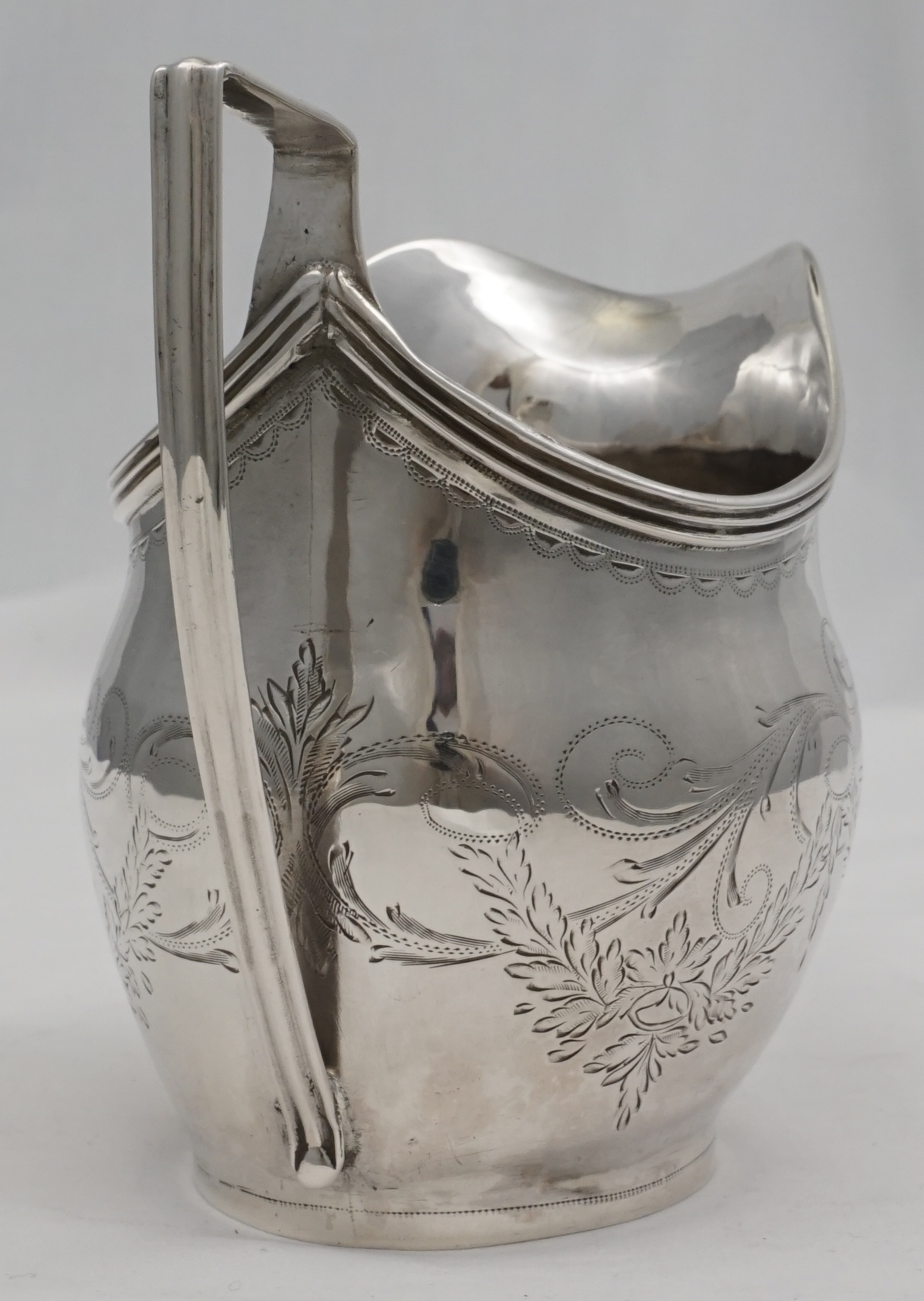 DESCRIPTION | Antique English Georgian solid sterling silver cream jug decorated with bright-cut engraved foliate festoons and a