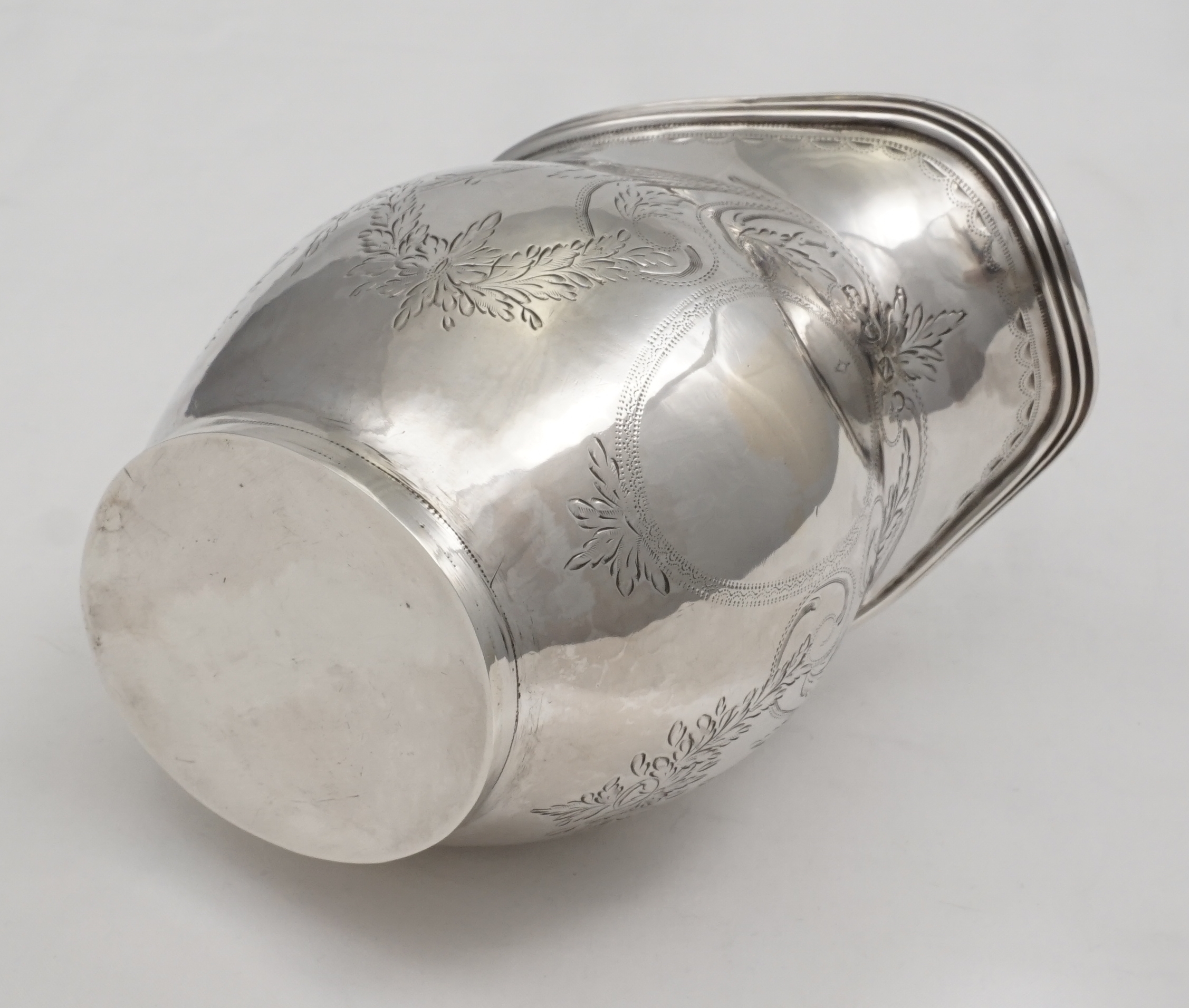 blank oval cartouche. These jugs often suffer with the lower handle joint pushing into the body. This has happened and been adequately correctly. When the silversmith attended to the bottom joint, the seam running up the back would