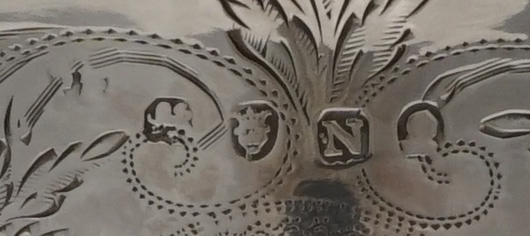 You can remove engravings by erasure (cheap) or flooding (expensive). The original monogram engraving has been removed by flooding. I expect that some of the bright cut serifs ran too deep for a successful erasure. I usually dispatch my silver wrapped in acid free tissue paper. Take a single thickness and hold it closely over the flooded area and you will be able to see the lost engraving. Alternatively submerge the jug in some very soapy water and gentle bring to the surface. Just as the cartouche breaks the surface the engraving will fleetingly reappear. My special photographic lights have highlighted the copper atoms within the silver flood and they appear pinkish in my second image. They are far less obvious under normal light conditions. Also highlighted by my lighting are the copper rich areas created during the original manufacture and they now appear grey as the red copper atoms have oxidised to black copper oxide. The pink area will soon 'recover' from my recent polishing and also turn grey. This feature of the sterling silver silver/copper alloy is almost always present after the metal has been heated but is not always seen because it fades away as the surface takes on the milky appearance of old silver due to the millions of micro scratches from normal use and handling. It is given the rather ugly names of 'fire-stain' and 'fire-skin'. |