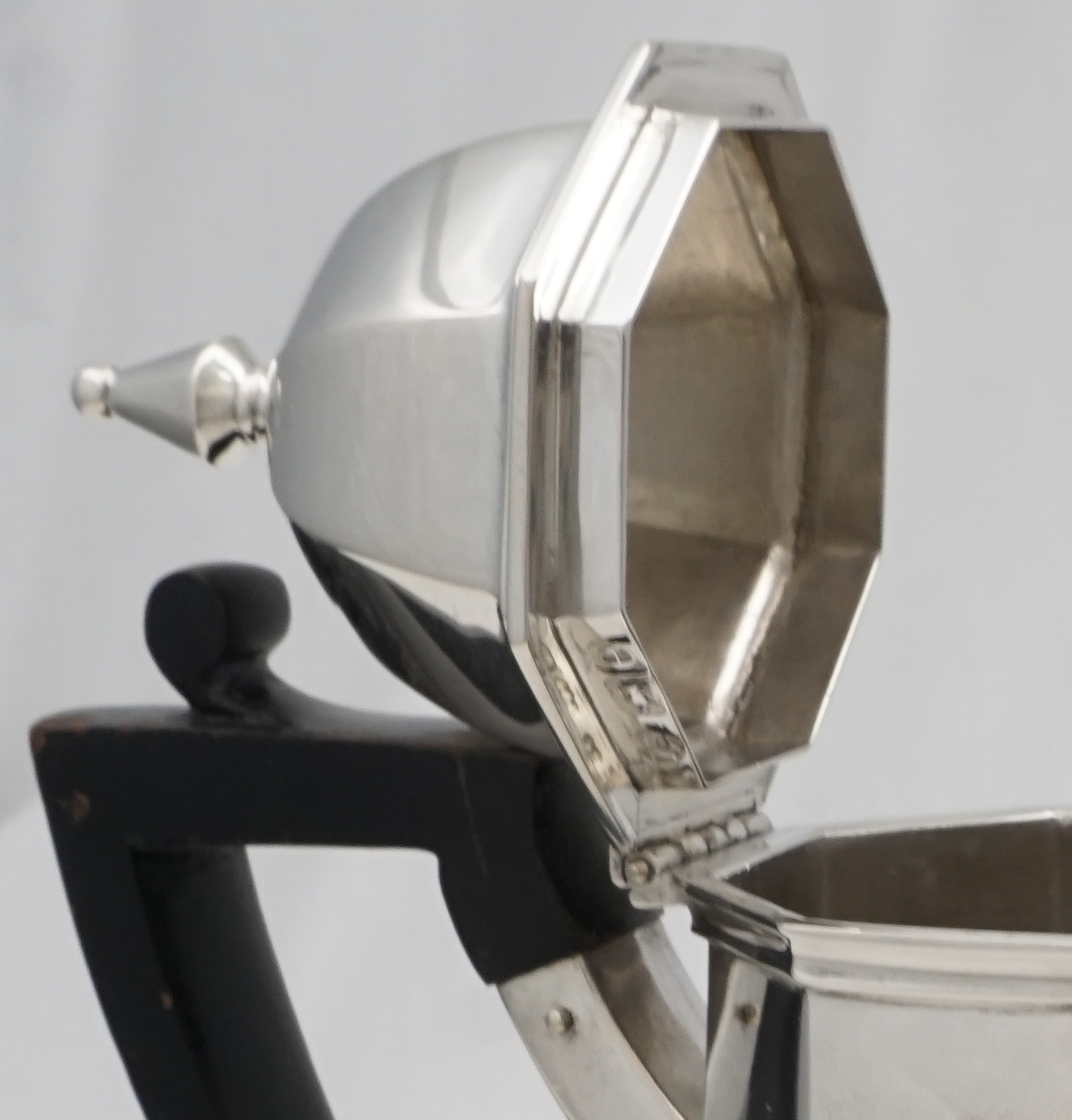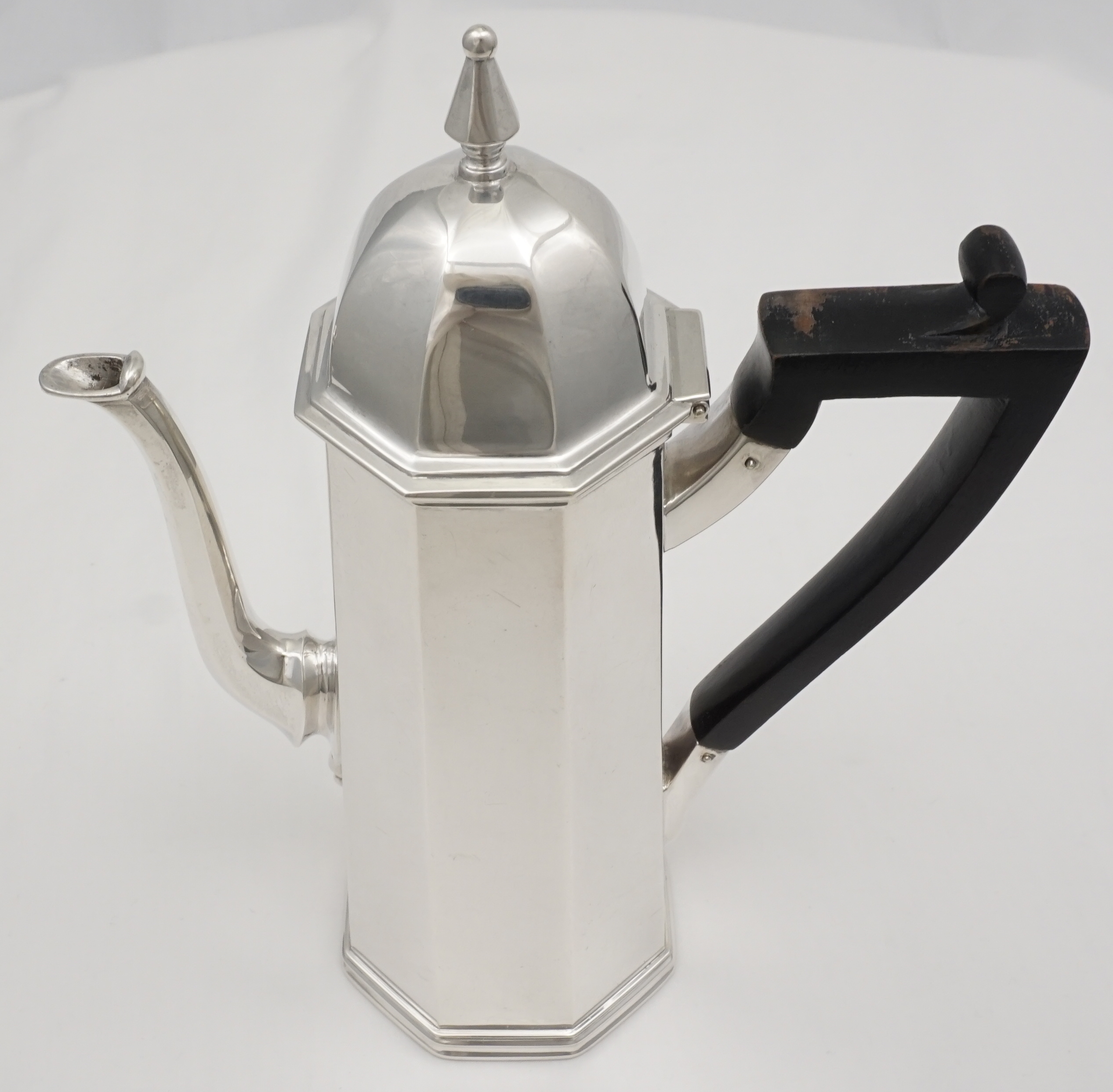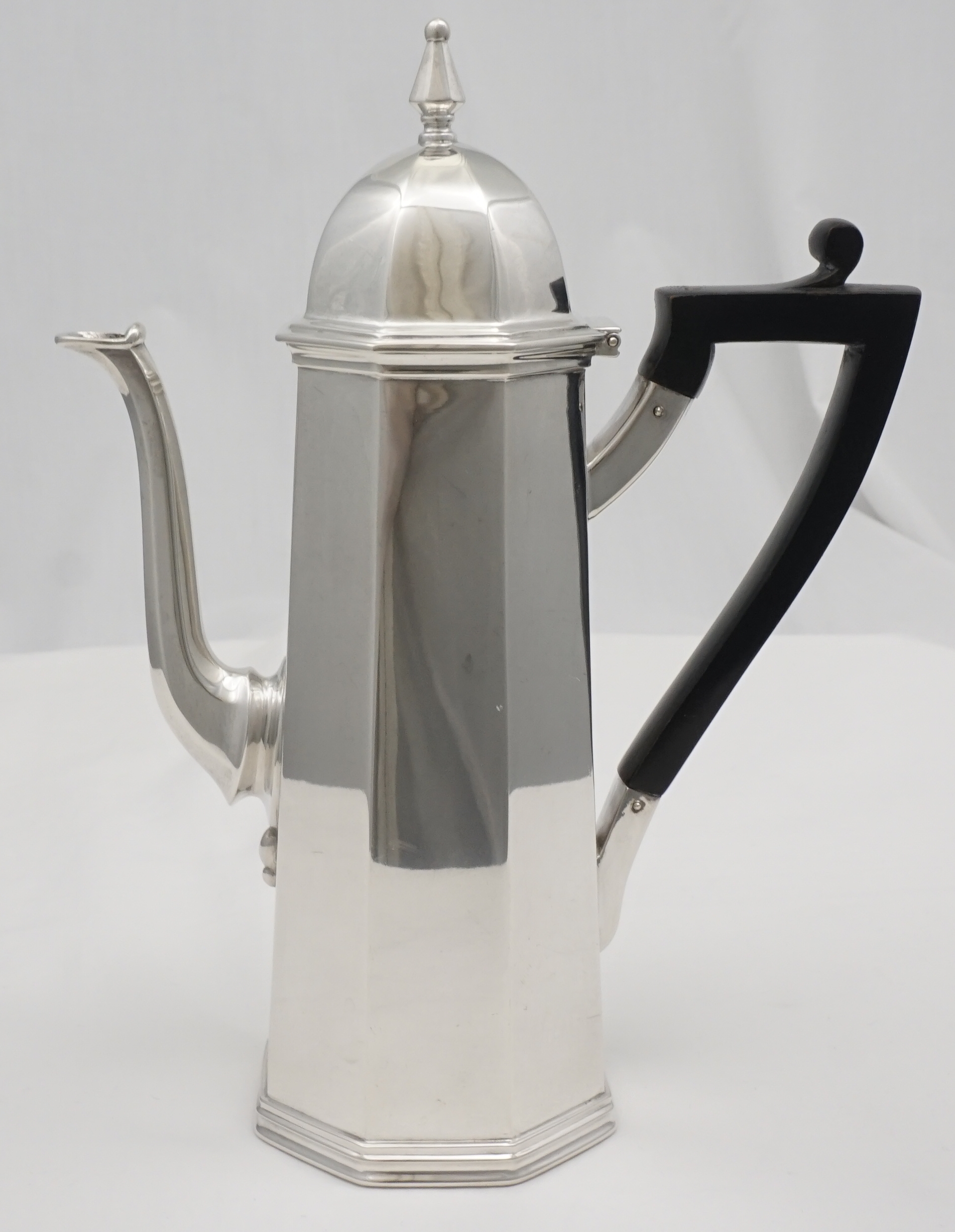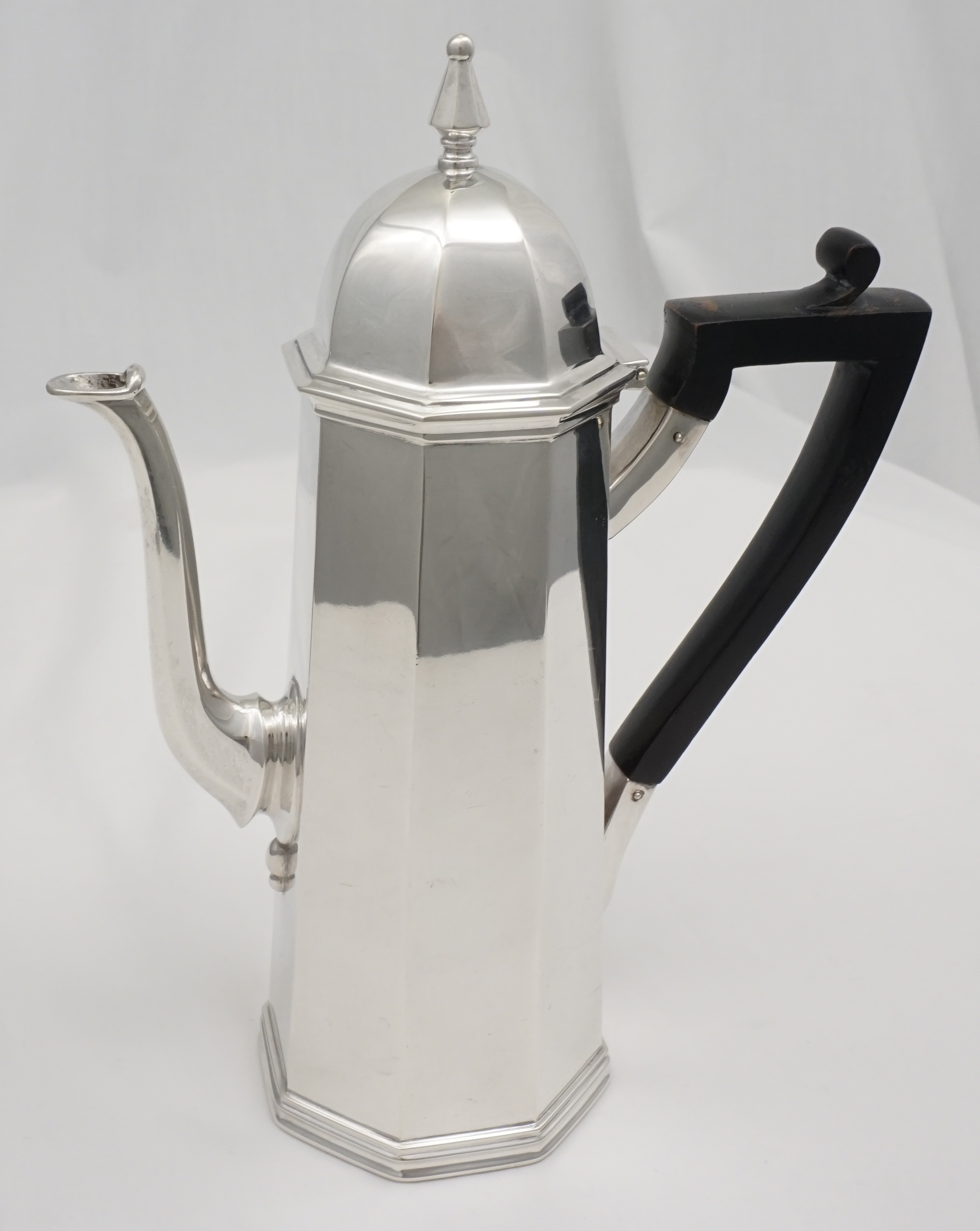 DESCRIPTION | Superb quality antique English Victorian solid sterling silver 'tete a tete' coffee pot in early Queen Anne style with octagonal sides and domed lid. Holds 12 fluid ounces or 350ml. Correctly hallmarked to upper body and again to lid flange. |