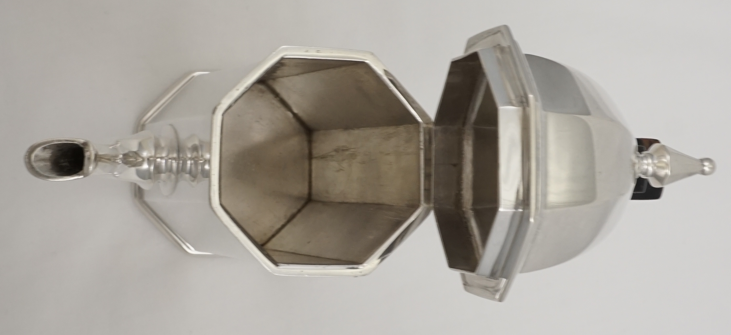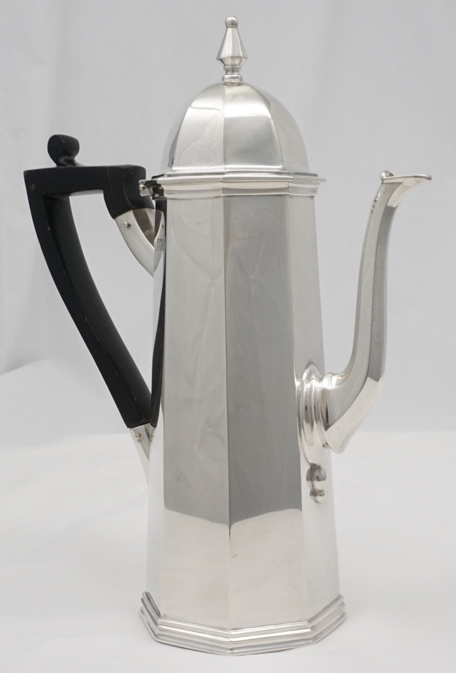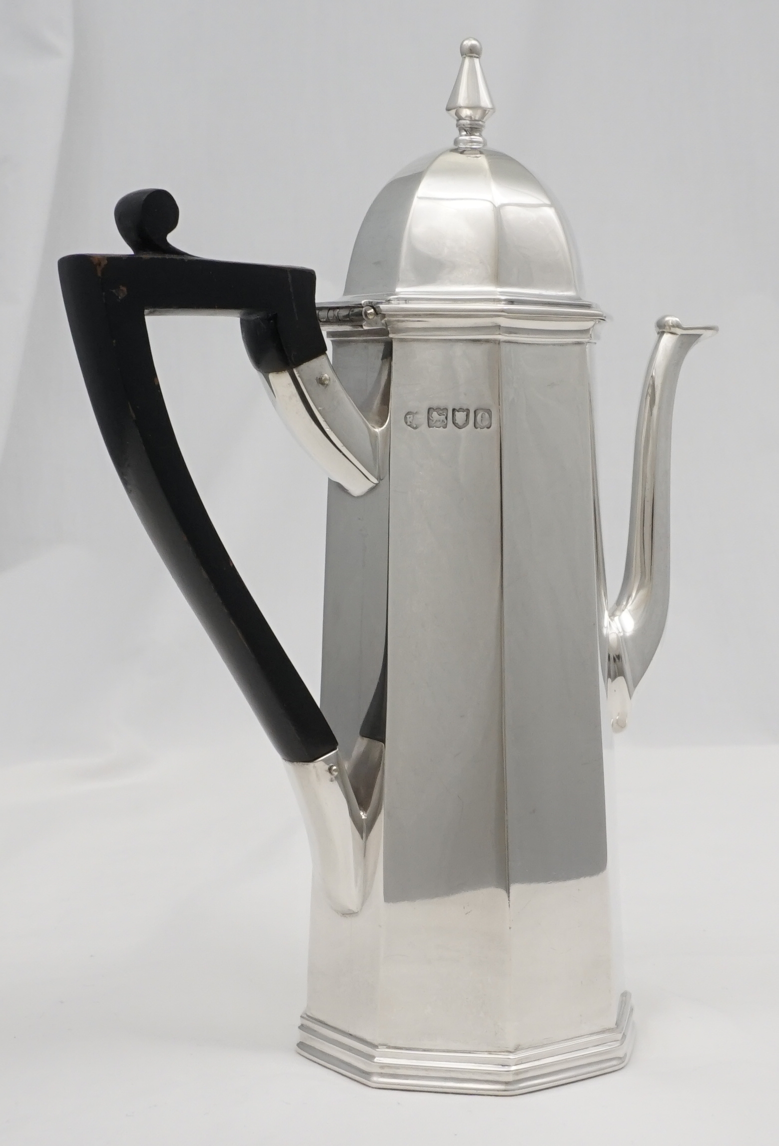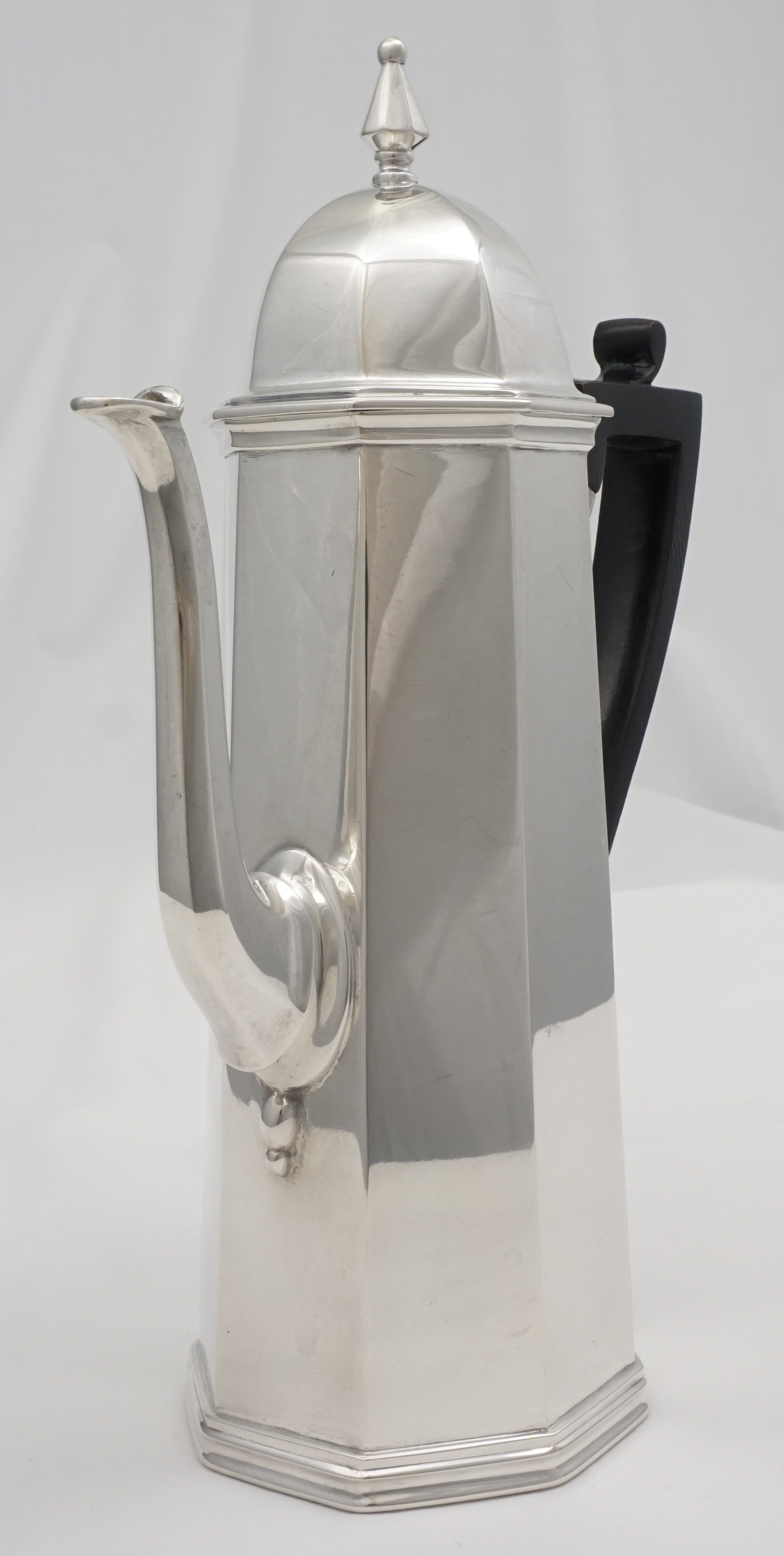DESCRIPTION | Superb quality antique English Victorian solid sterling silver 'tete a tete' coffee pot in early Queen Anne style with octagonal sides and domed lid. Holds 12 fluid ounces or 350ml. Correctly hallmarked to upper body and again to lid flange. |