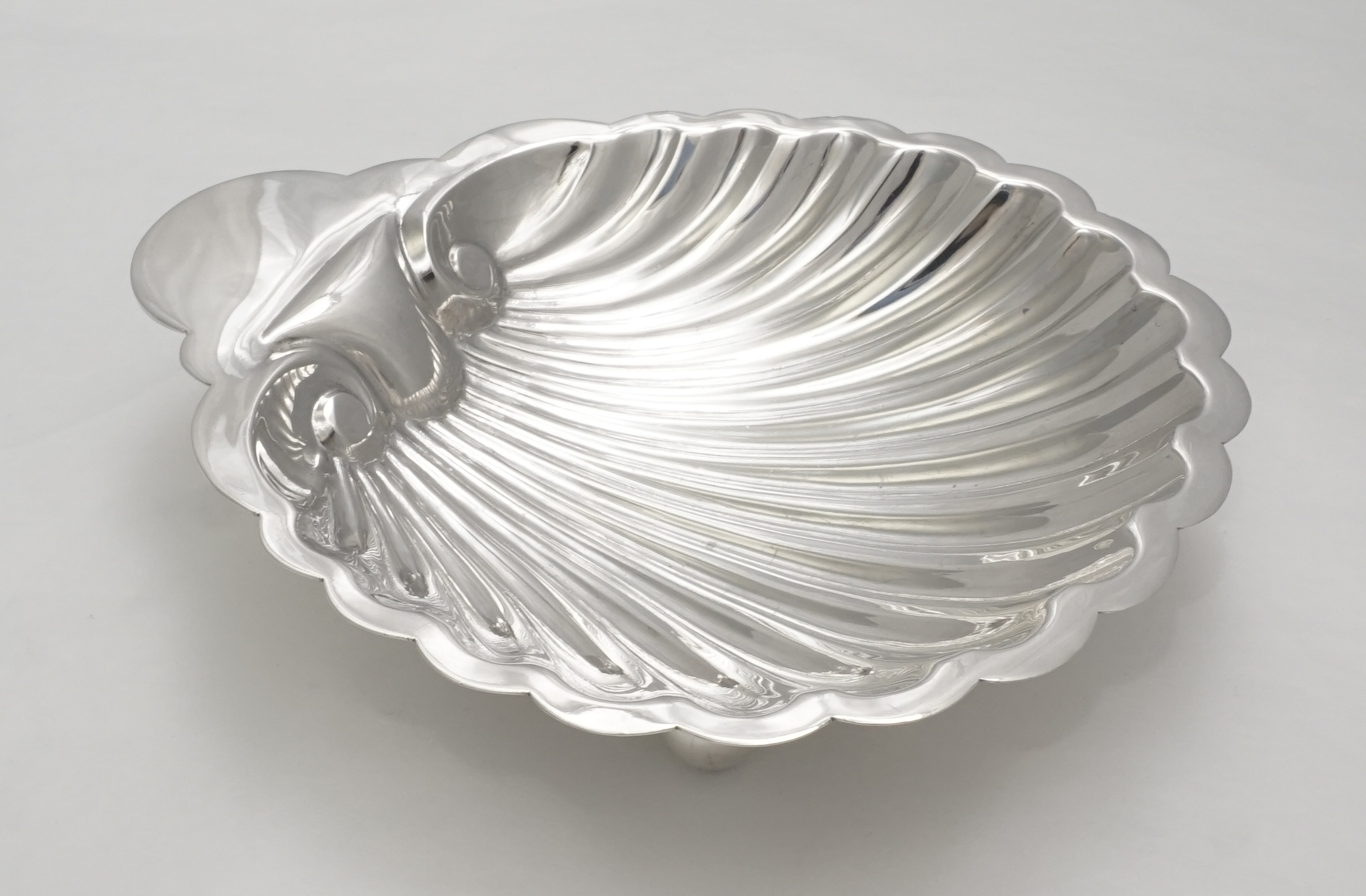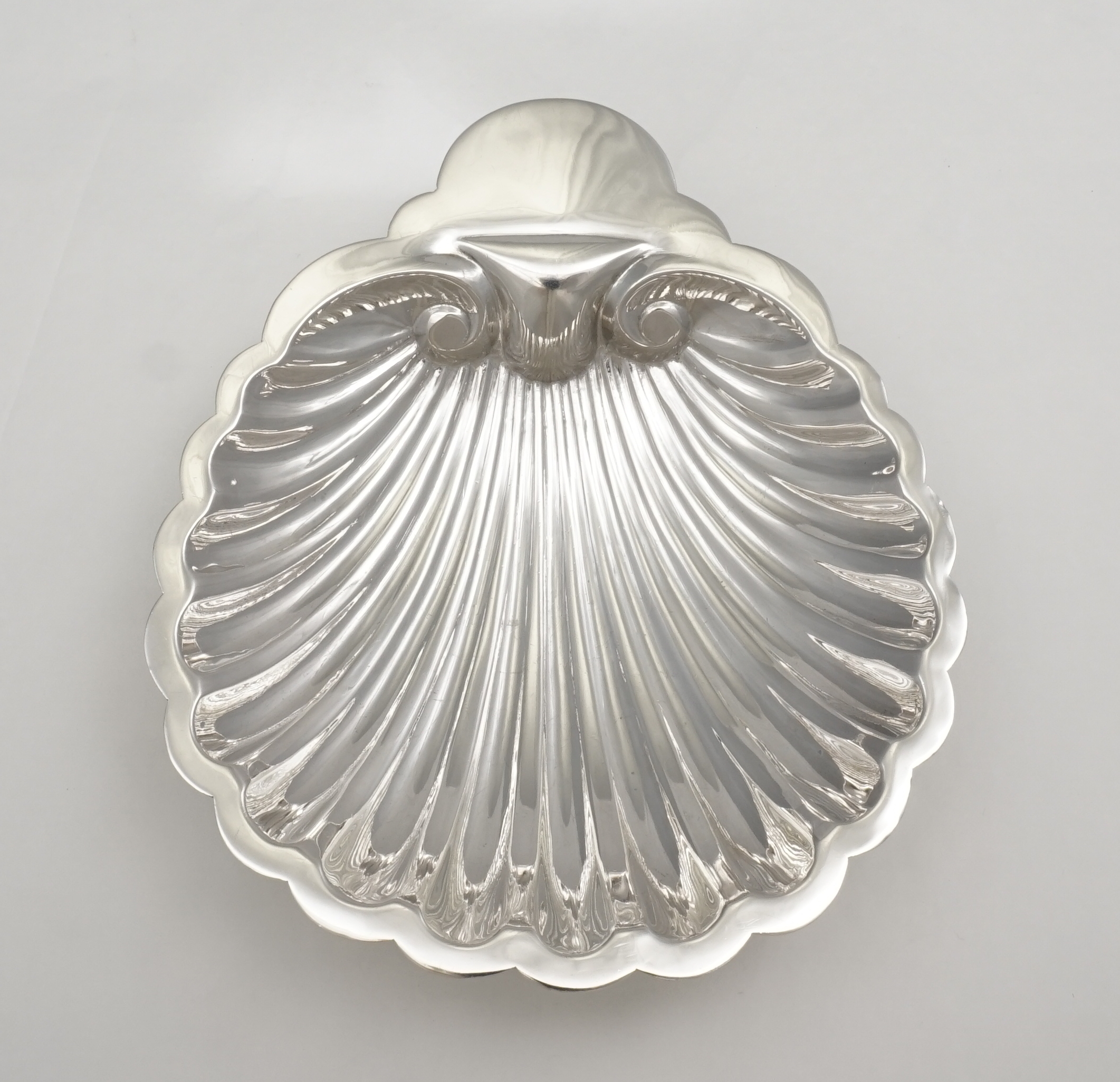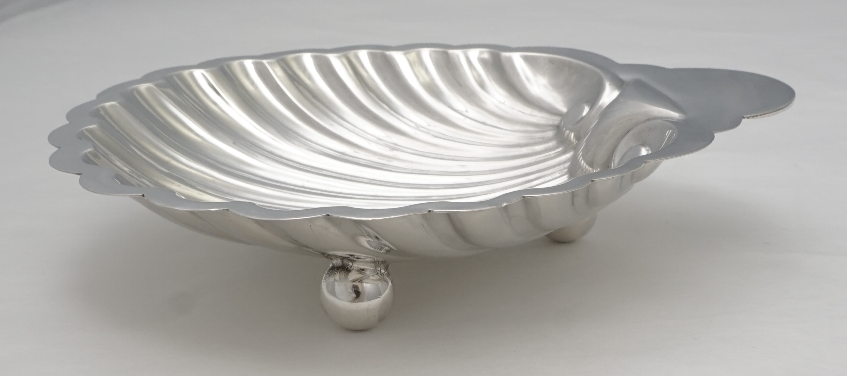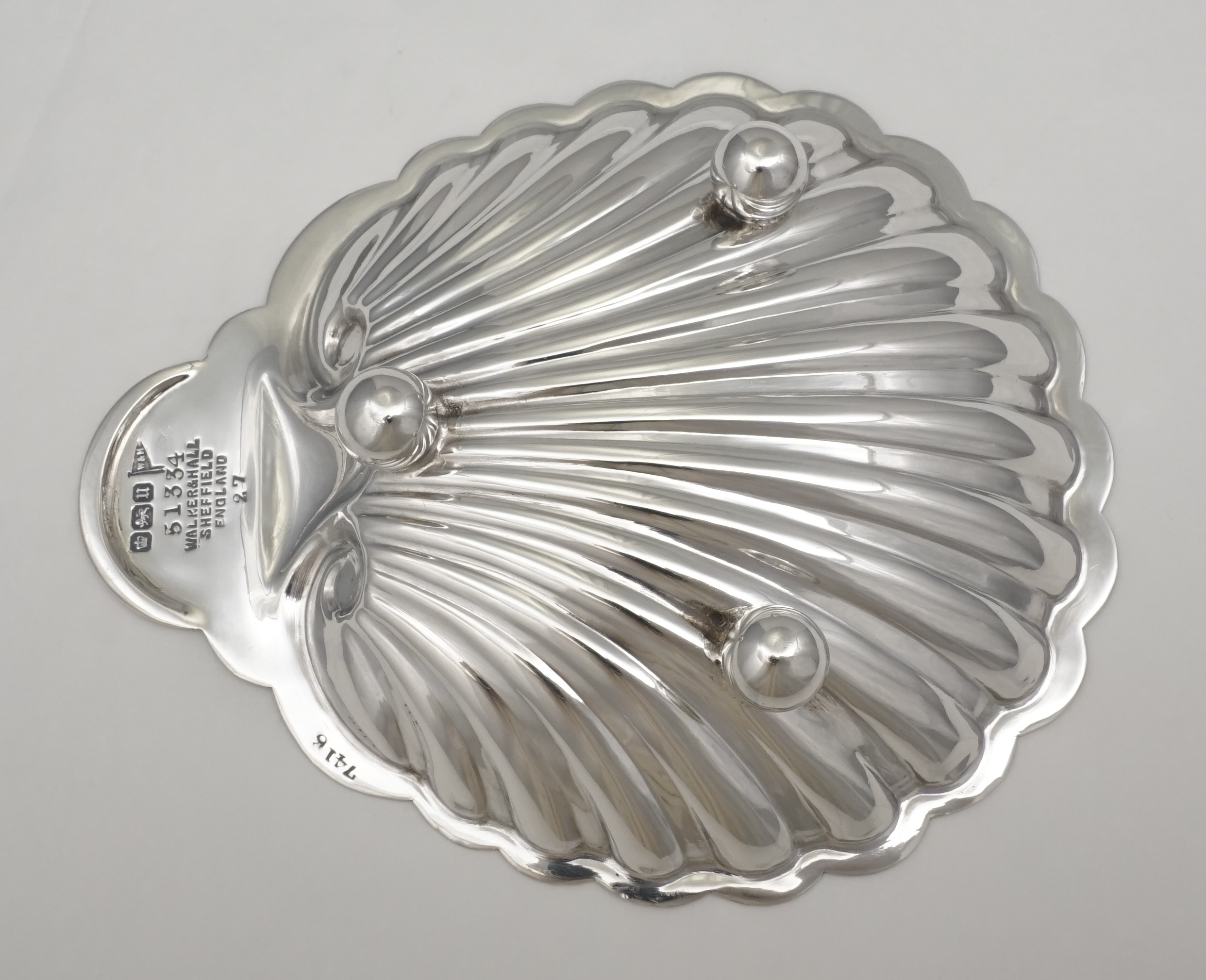 DESCRIPTION | Good quality antique English solid sterling silver butter shell on three ball feet. |