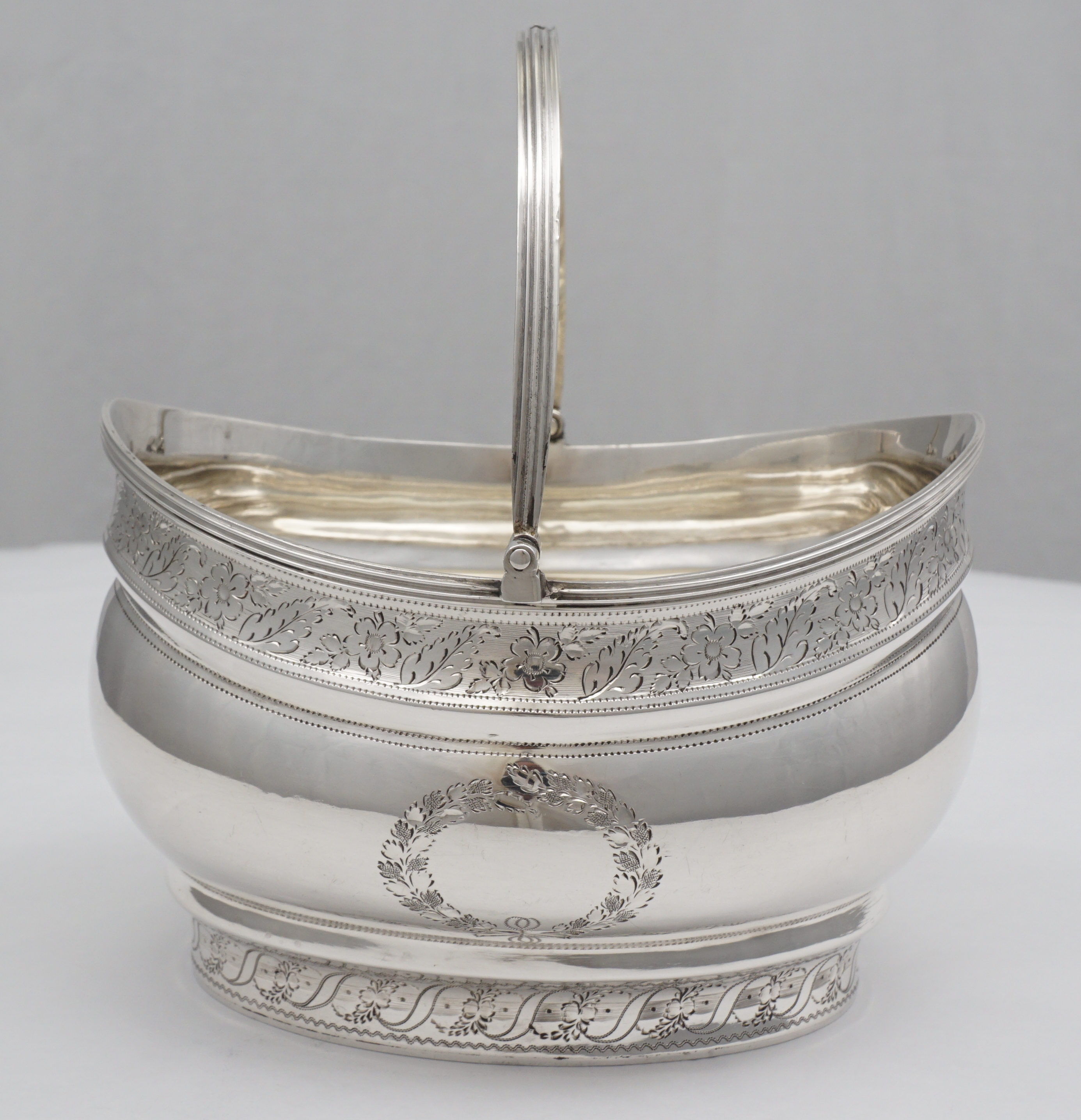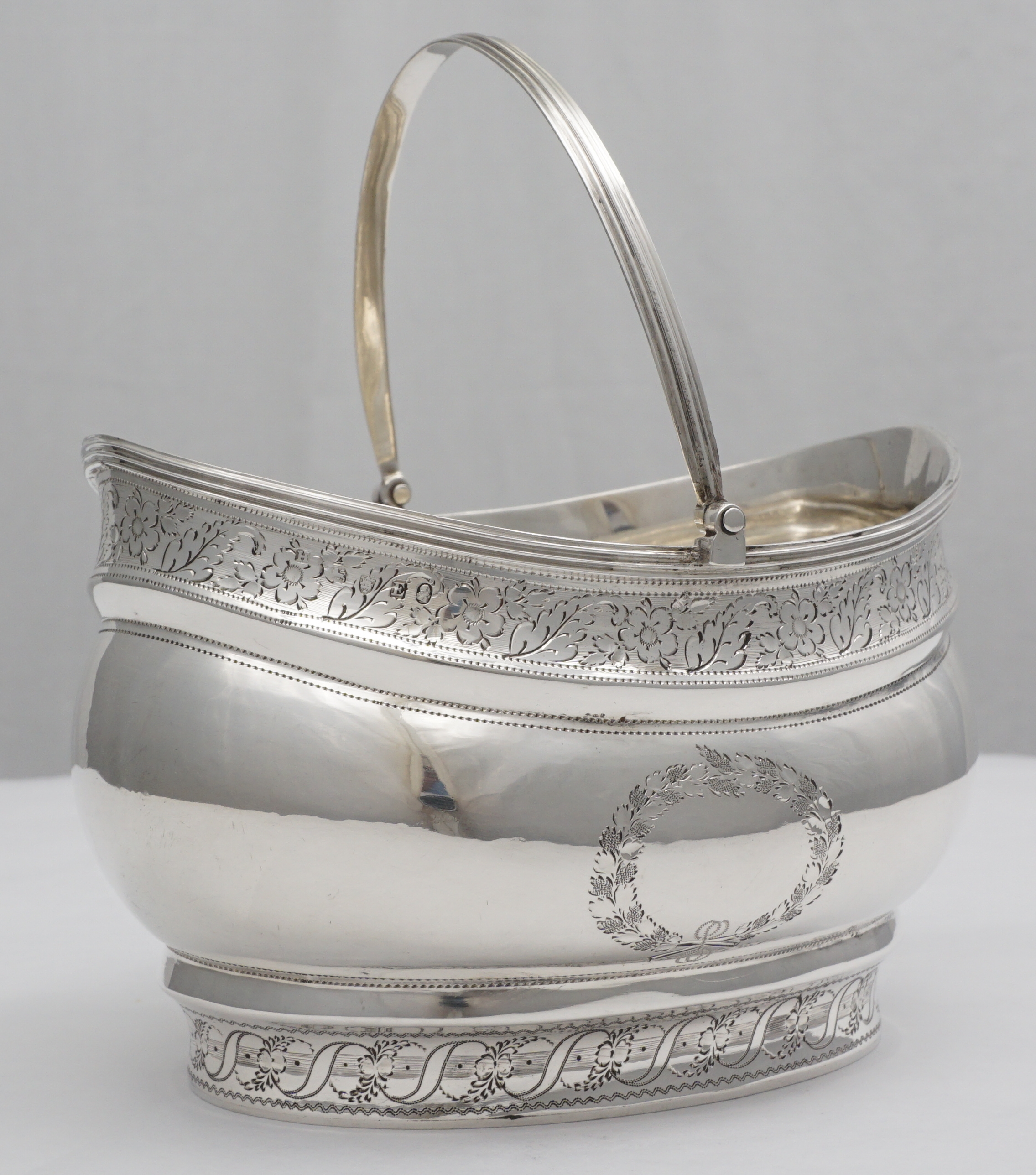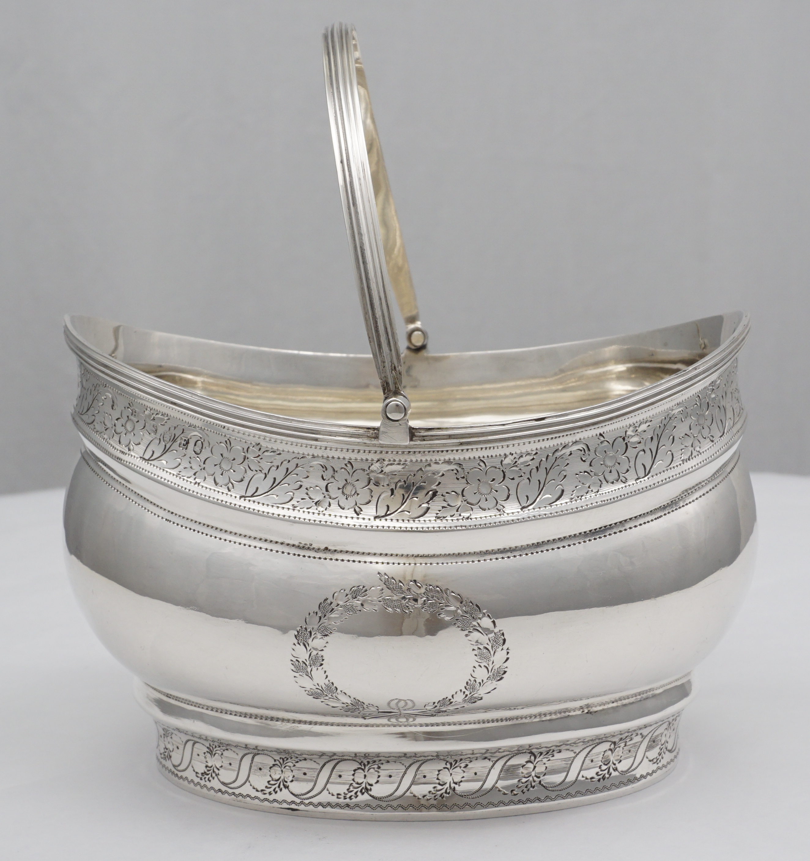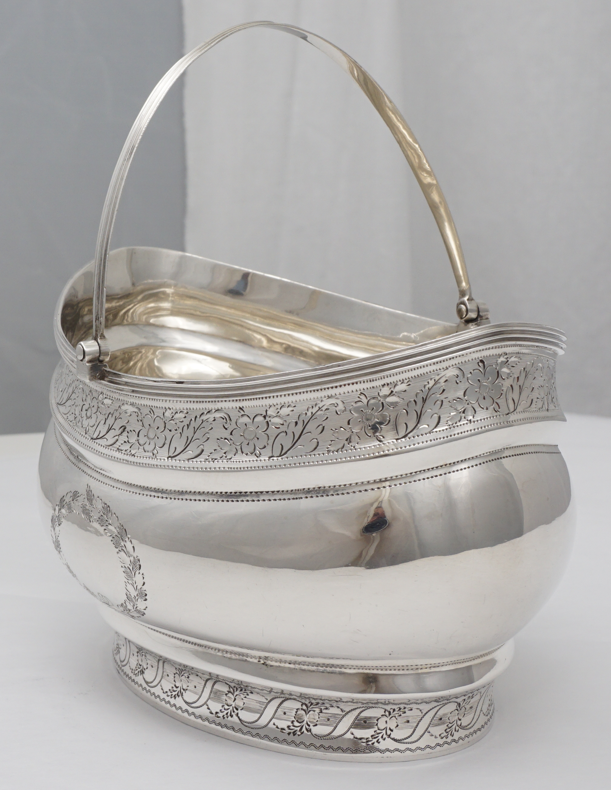 DESCRIPTION | Large Antique English Georgian solid sterling silver swing handled sugar basket with bright-cut and engraved decoration, thread decorated borders and blank laurel leaf cartouches. Nice to see the lighter coloured line across the base. This was made by the assayer in 1800 taking his sample of metal. |