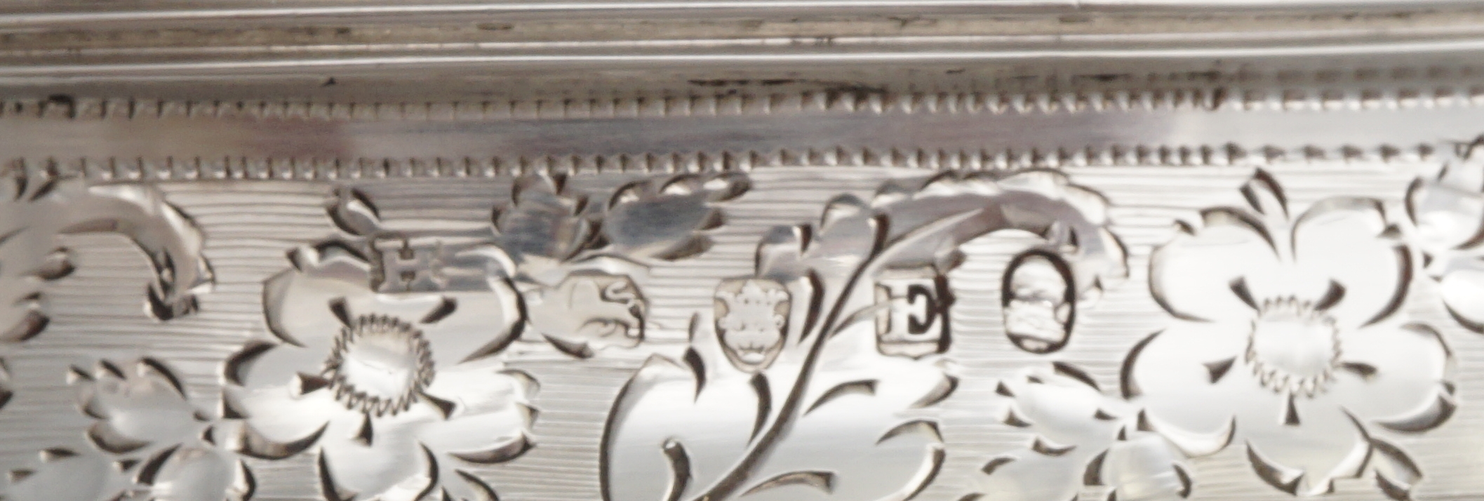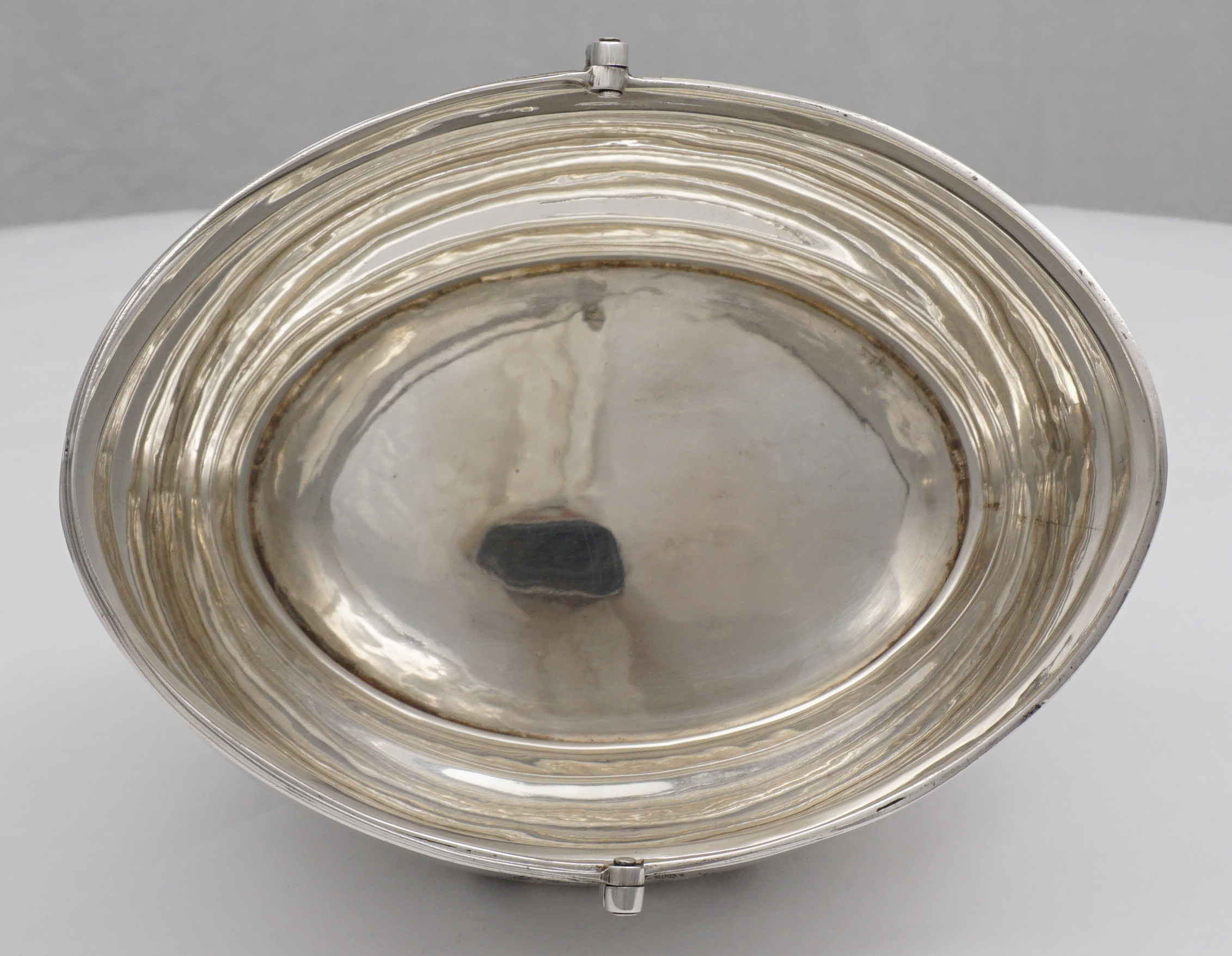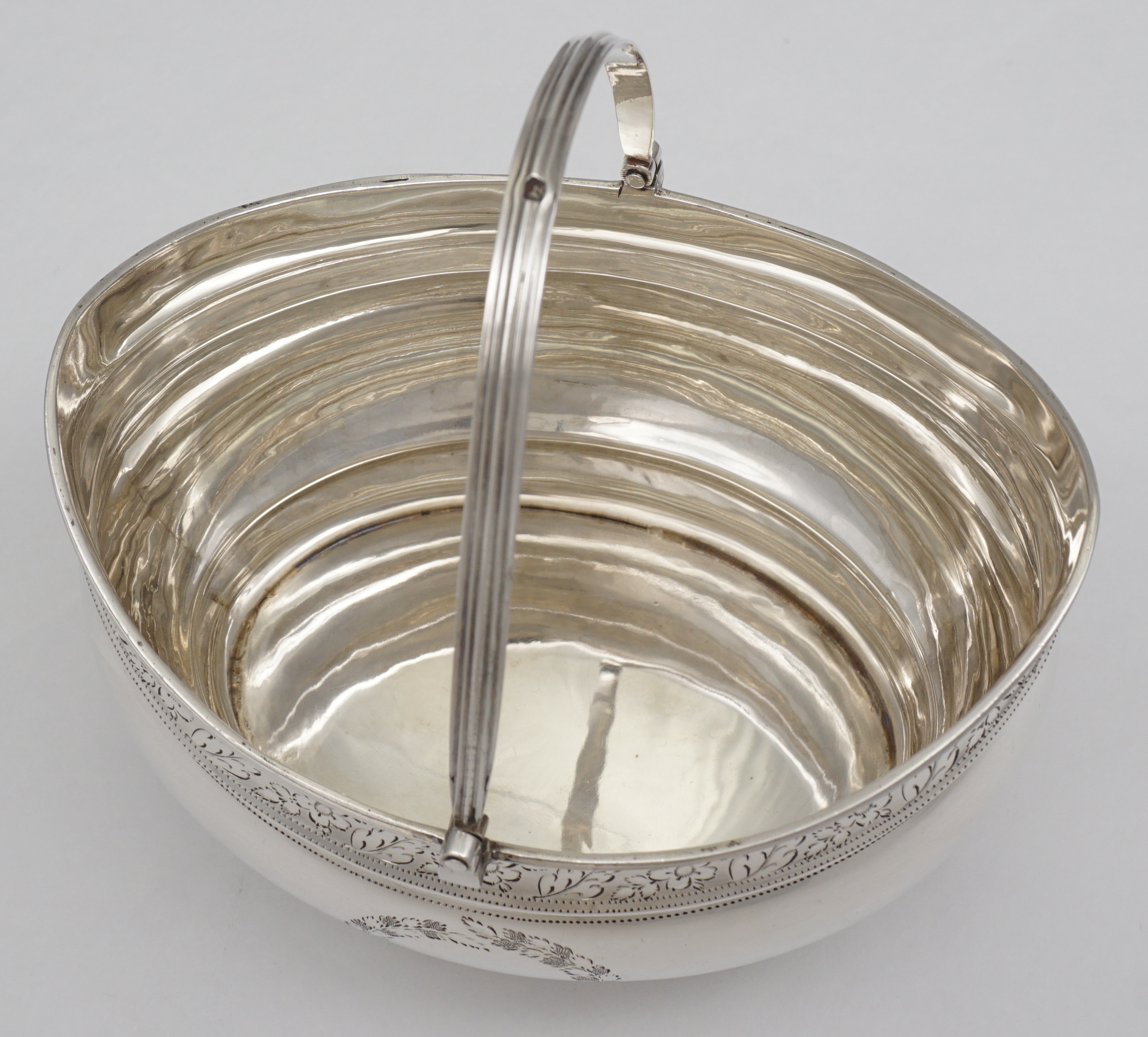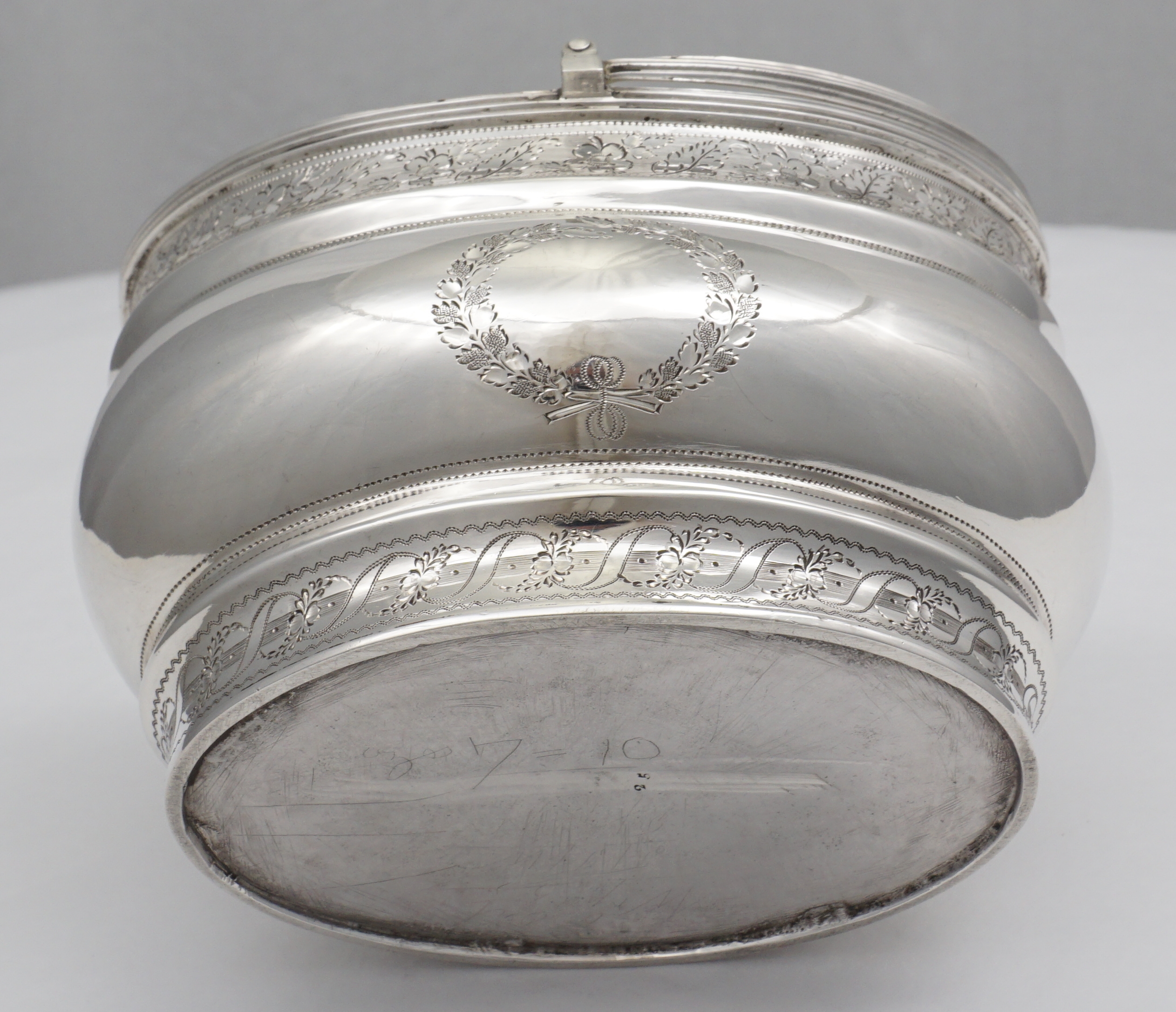 DESCRIPTION | Large Antique English Georgian solid sterling silver swing handled sugar basket with bright-cut and engraved decoration, thread decorated borders and blank laurel leaf cartouches. Nice to see the lighter coloured line across the base. This was made by the assayer in 1800 taking his sample of metal. |