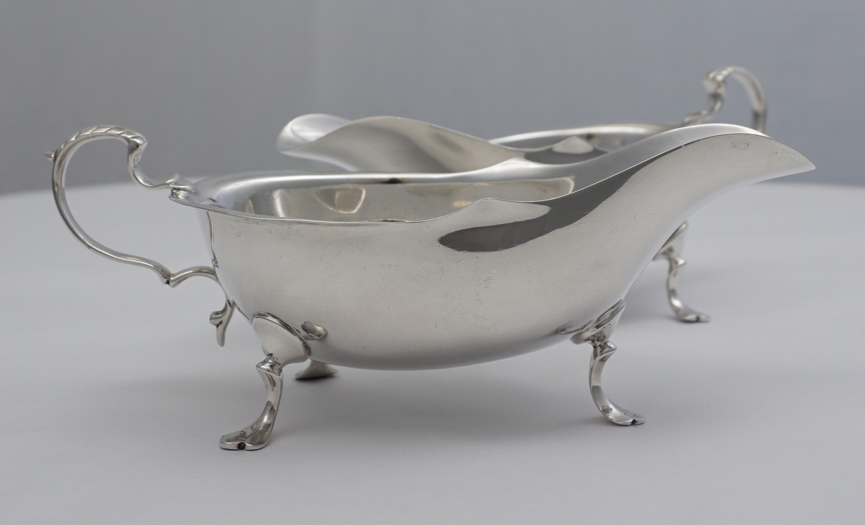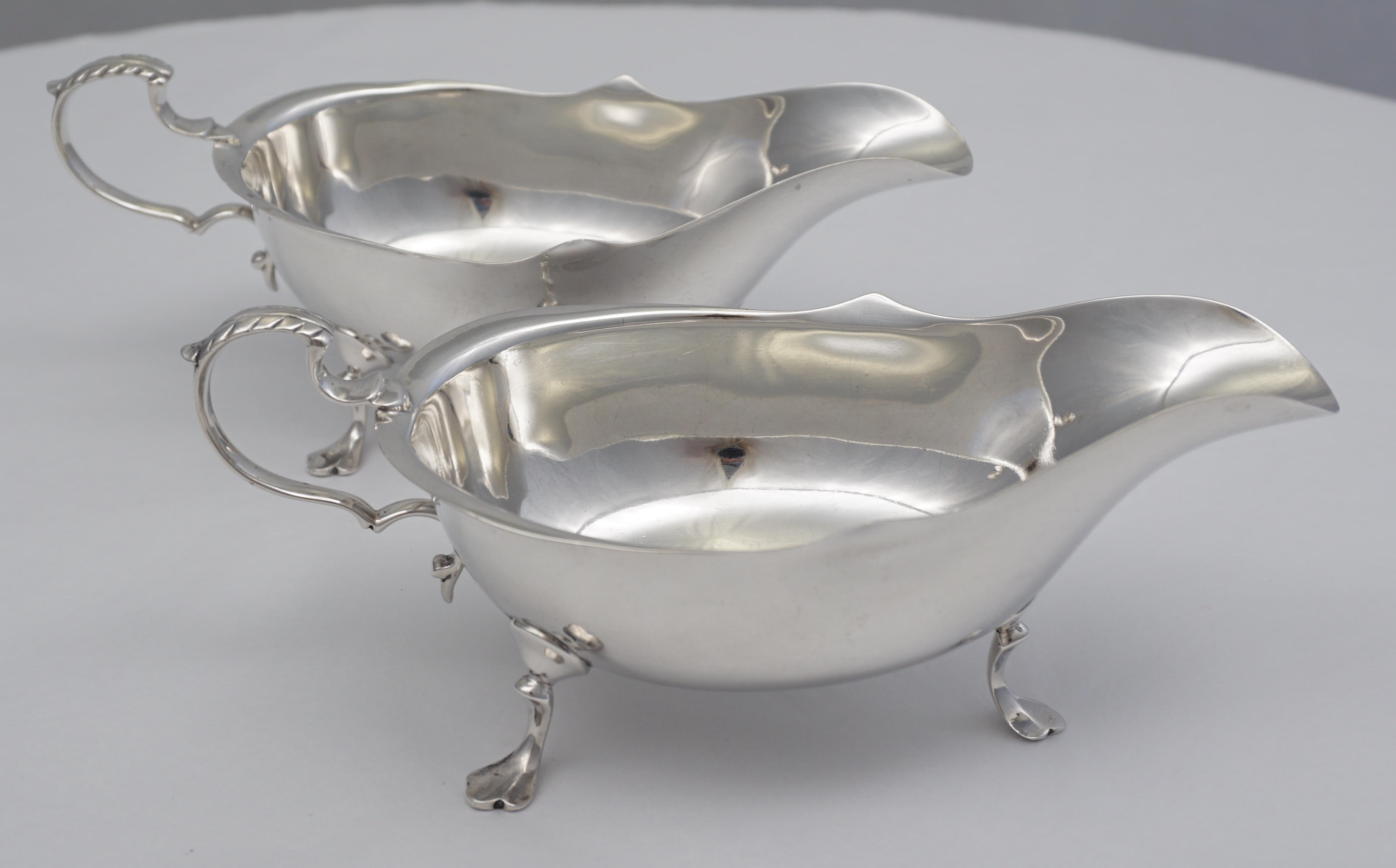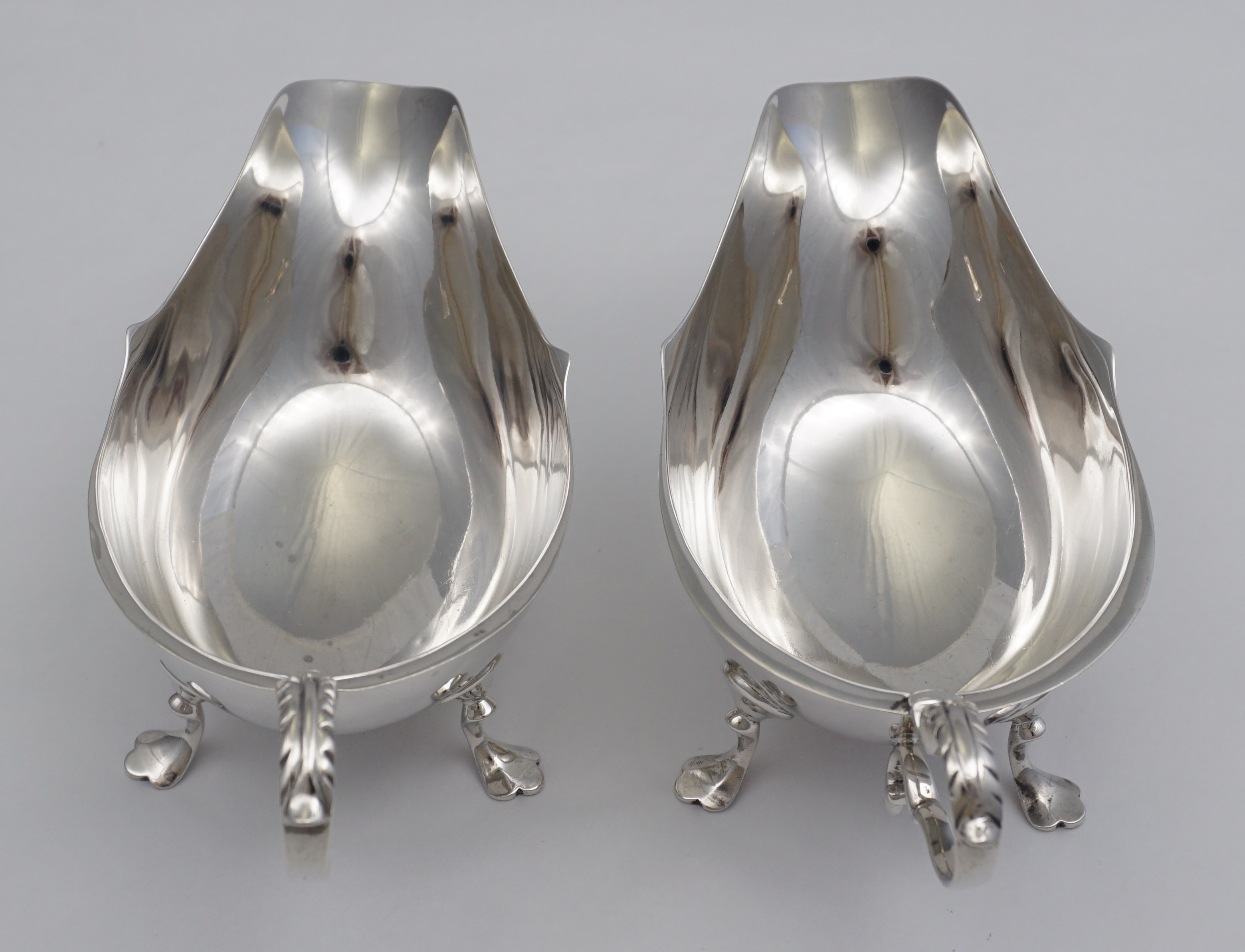 DESCRIPTION | Pair of antique English solid sterling silver sauce boats. |