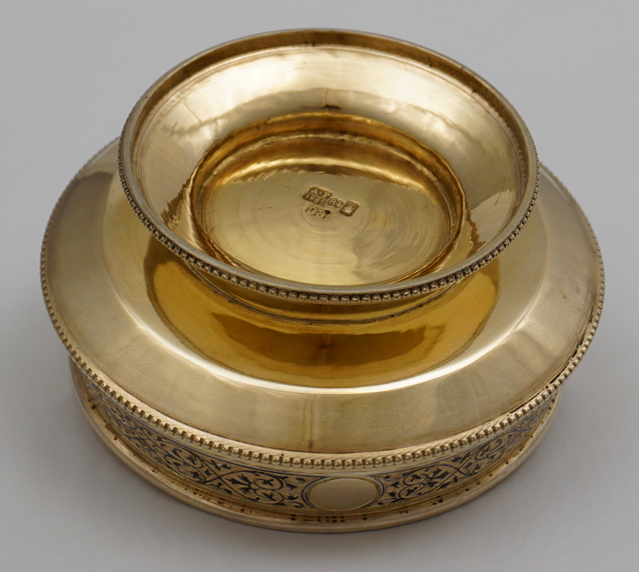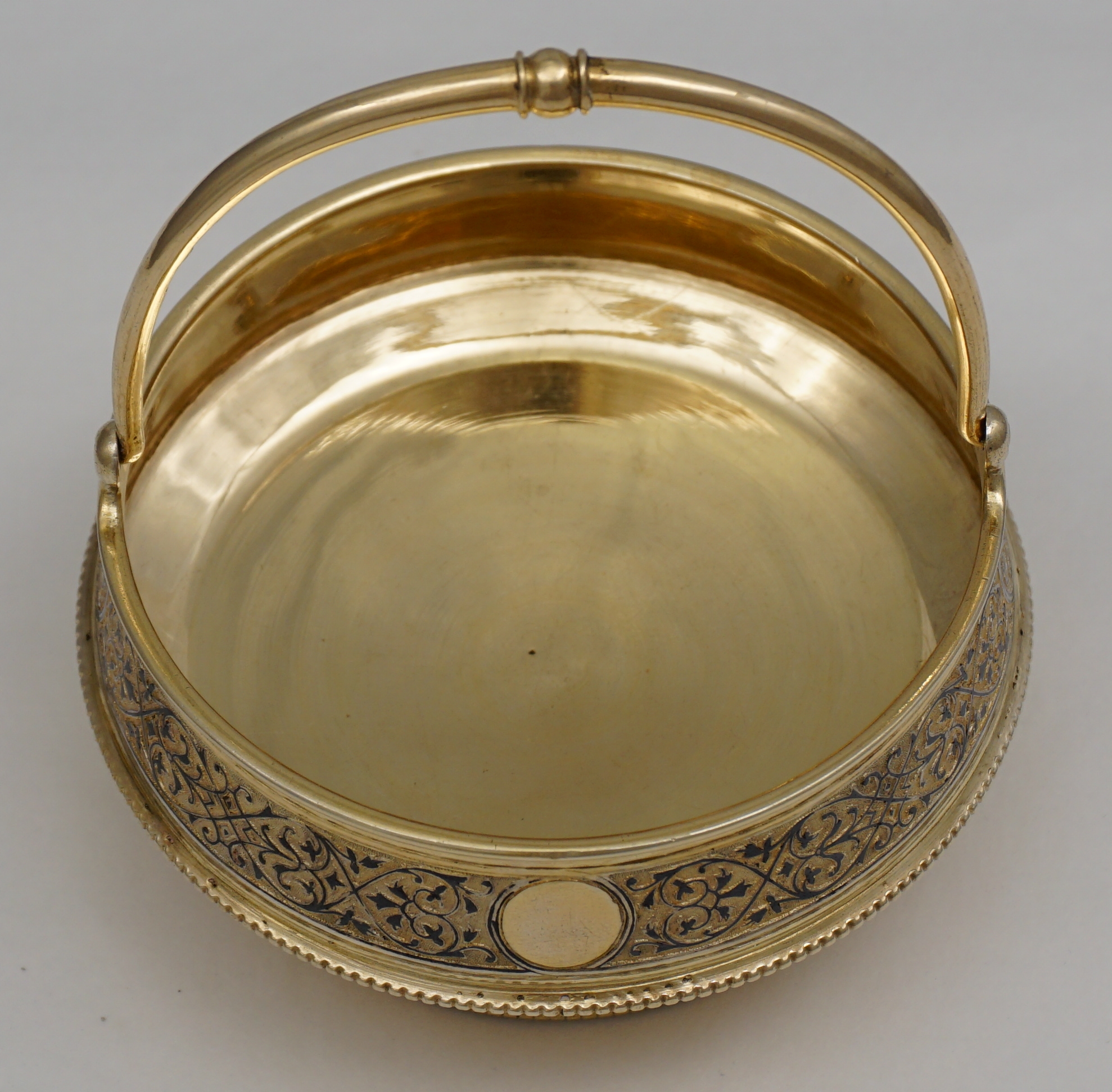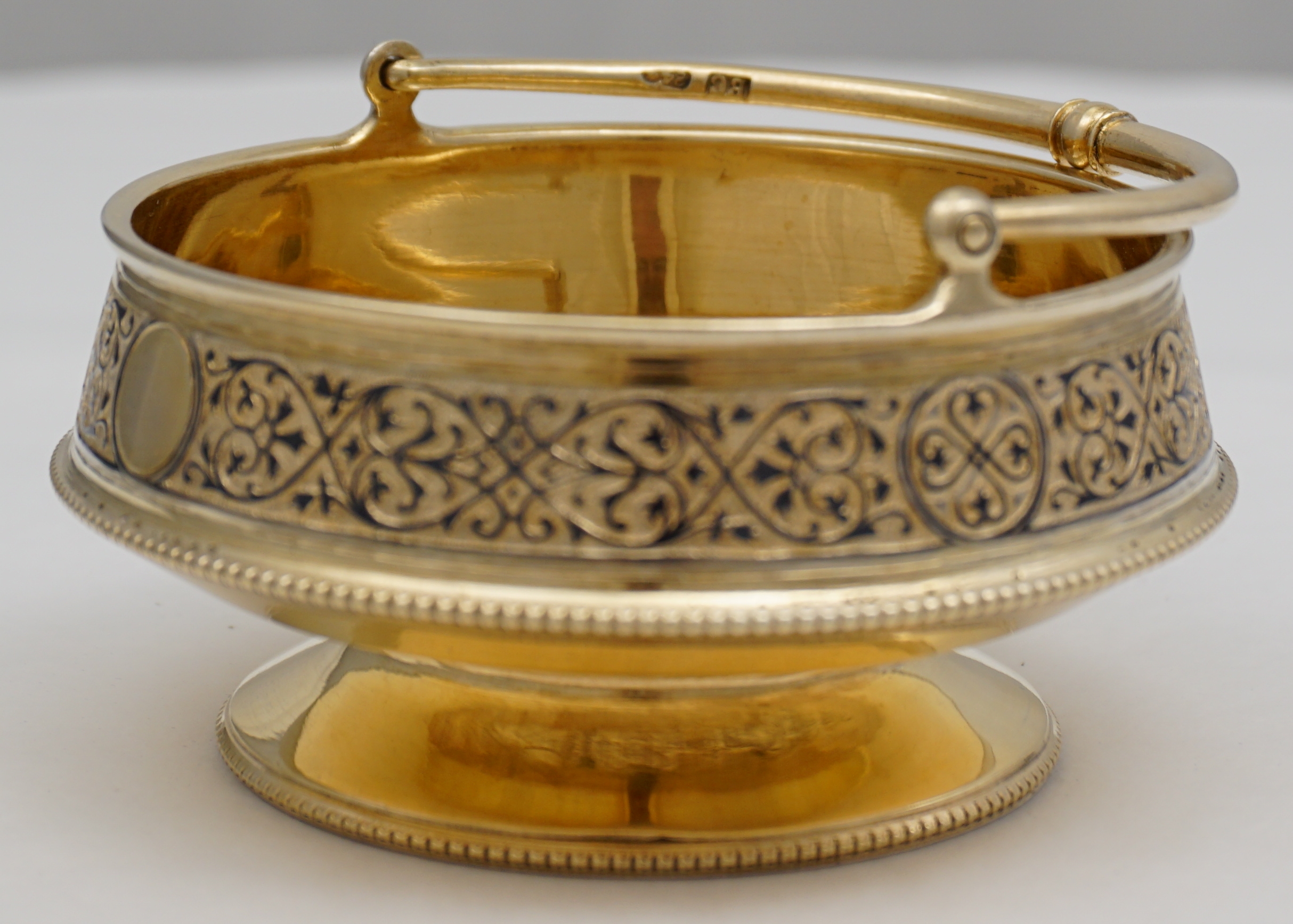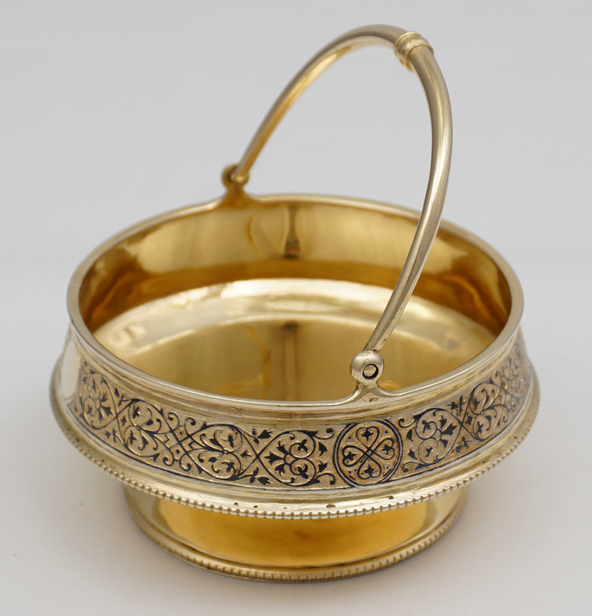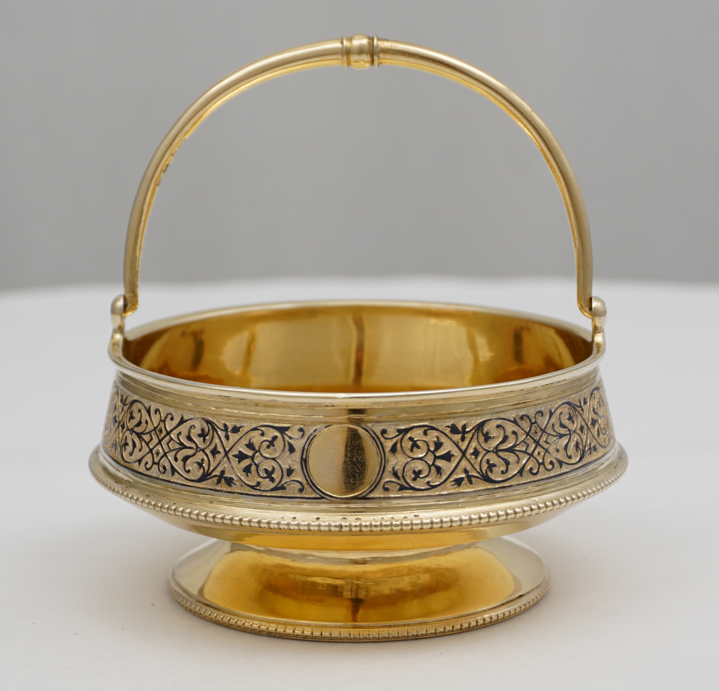 DESCRIPTION | Beautiful antique Russian solid silver gilt swing handled vase for sweets with two blank circular cartouches, bead rims and a band of engraved and niello decoration. |