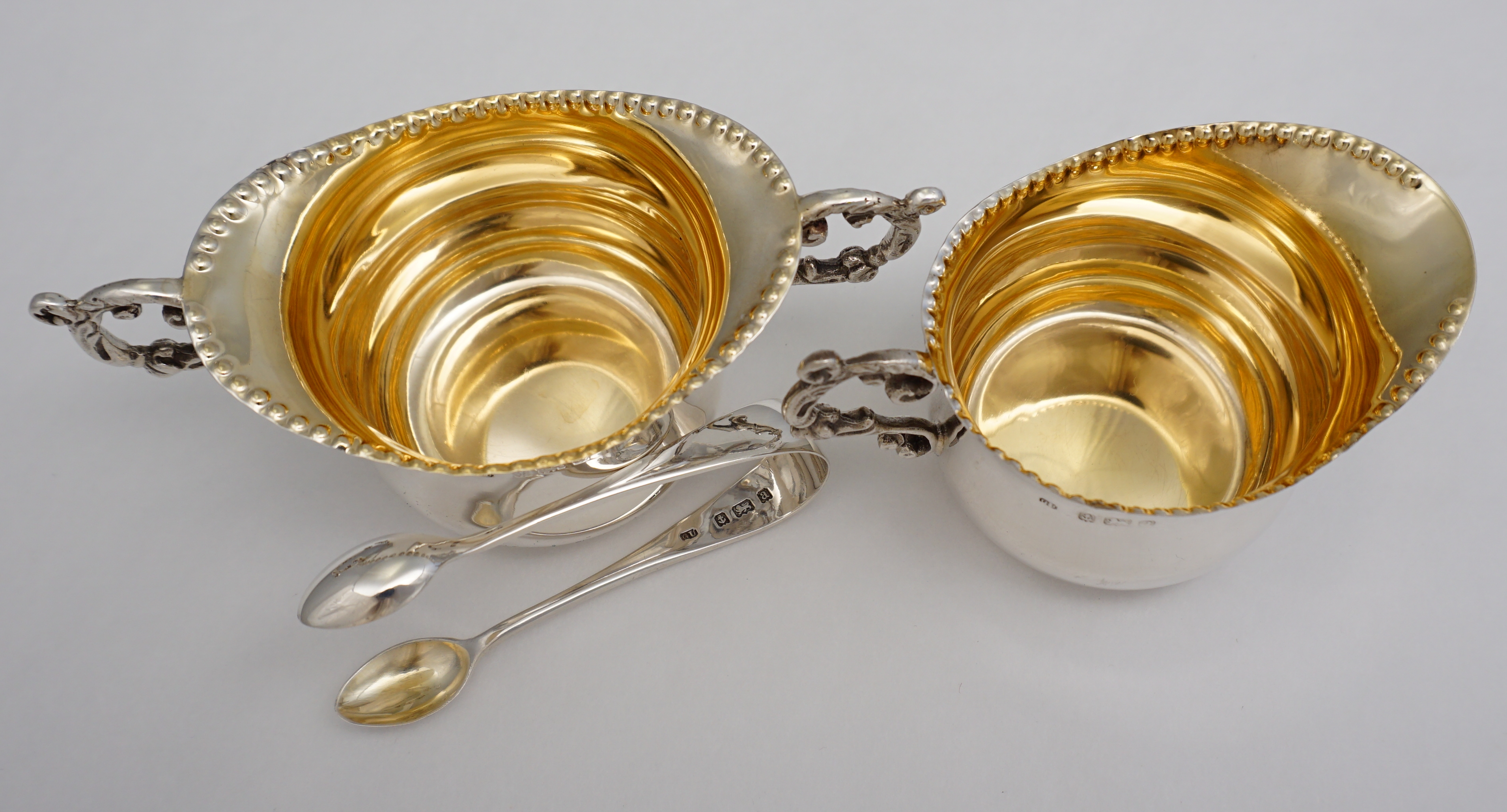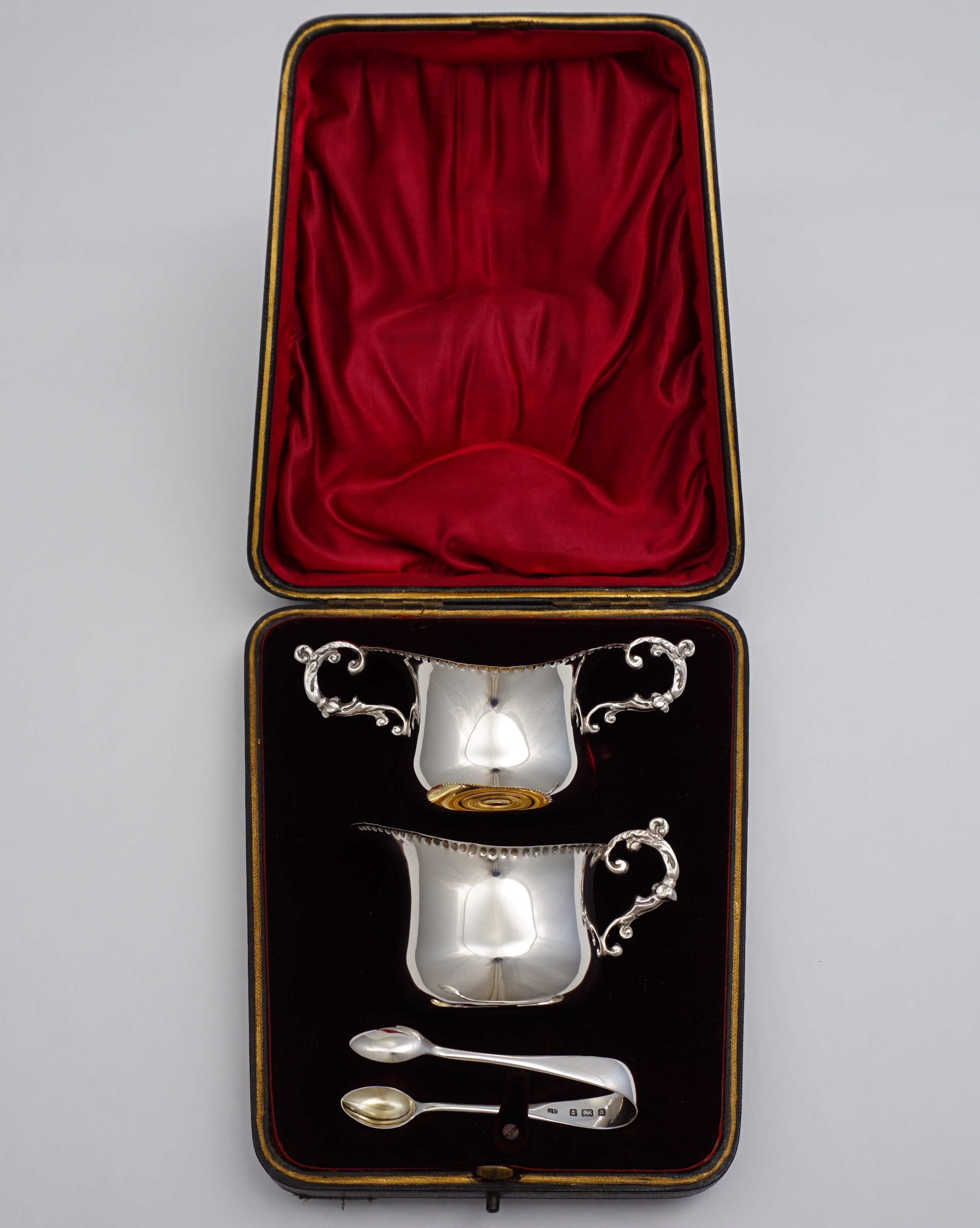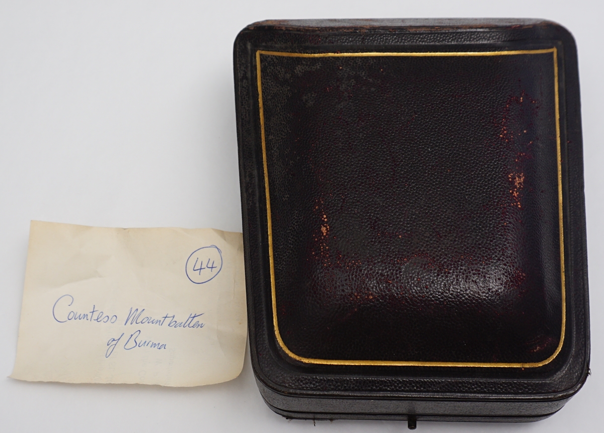 DESCRIPTION | Pretty little Victorian solid sterling silver gilt strawberry set consisting of sugar bowl, cream jug and sugar tongs, all with fully gilded interiors and contained within the original gilt lined leather, silk and velvet case. Once the property of Patricia Knatchbull, 2nd Countess Mountbatten of Burma and third cousin to Queen Elizabeth II. In March 2021 Sotheby's in London sold the sexier items of Patricia's inherited estate for £5.6 million. In April 2021 my local auction house sold of some of the more personal and domestic items. I bought a few of them. There is much about this family already on the internet so I will not add more here. Inside the case is a handwritten slip of paper that is most likely from an old inventory. |