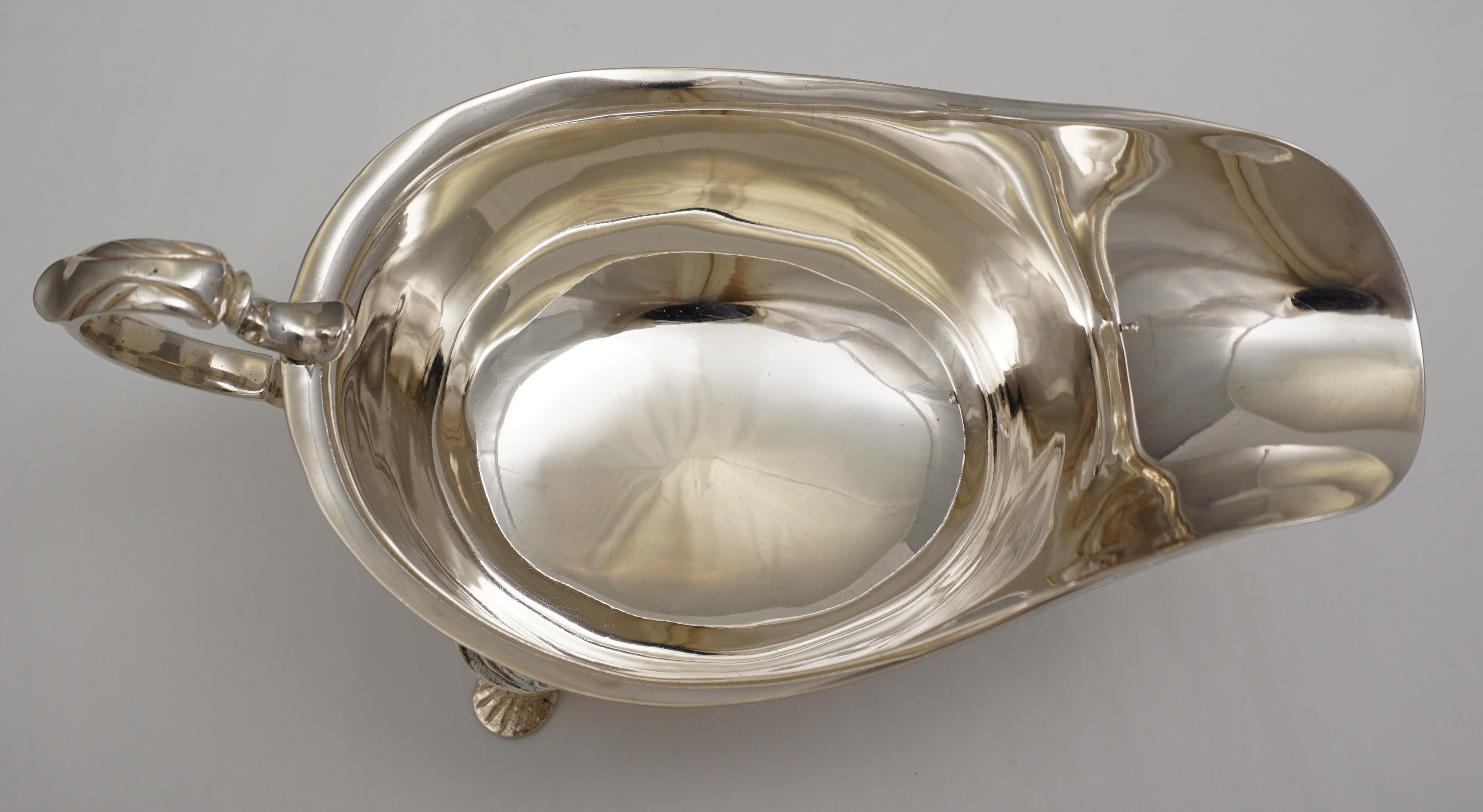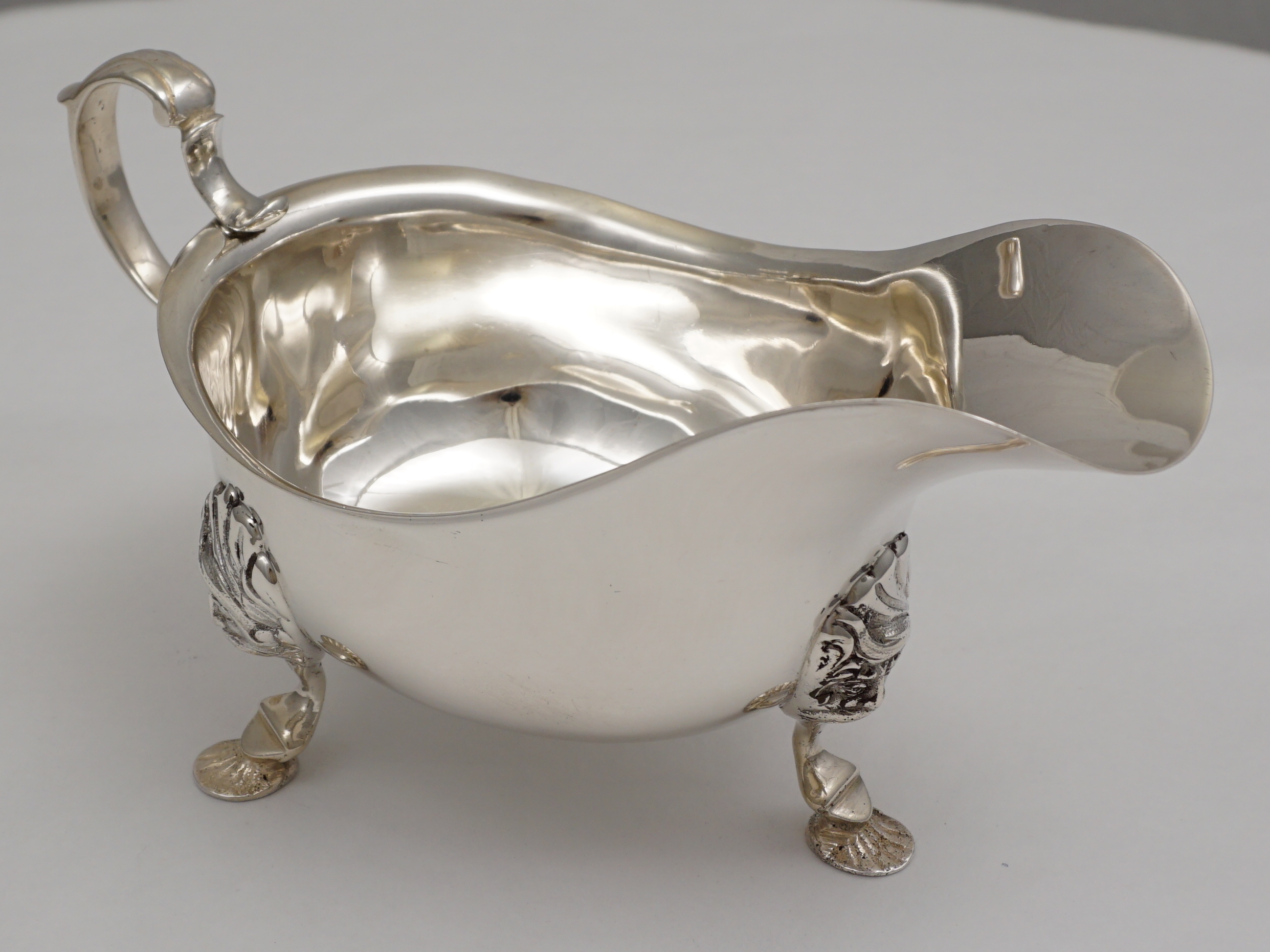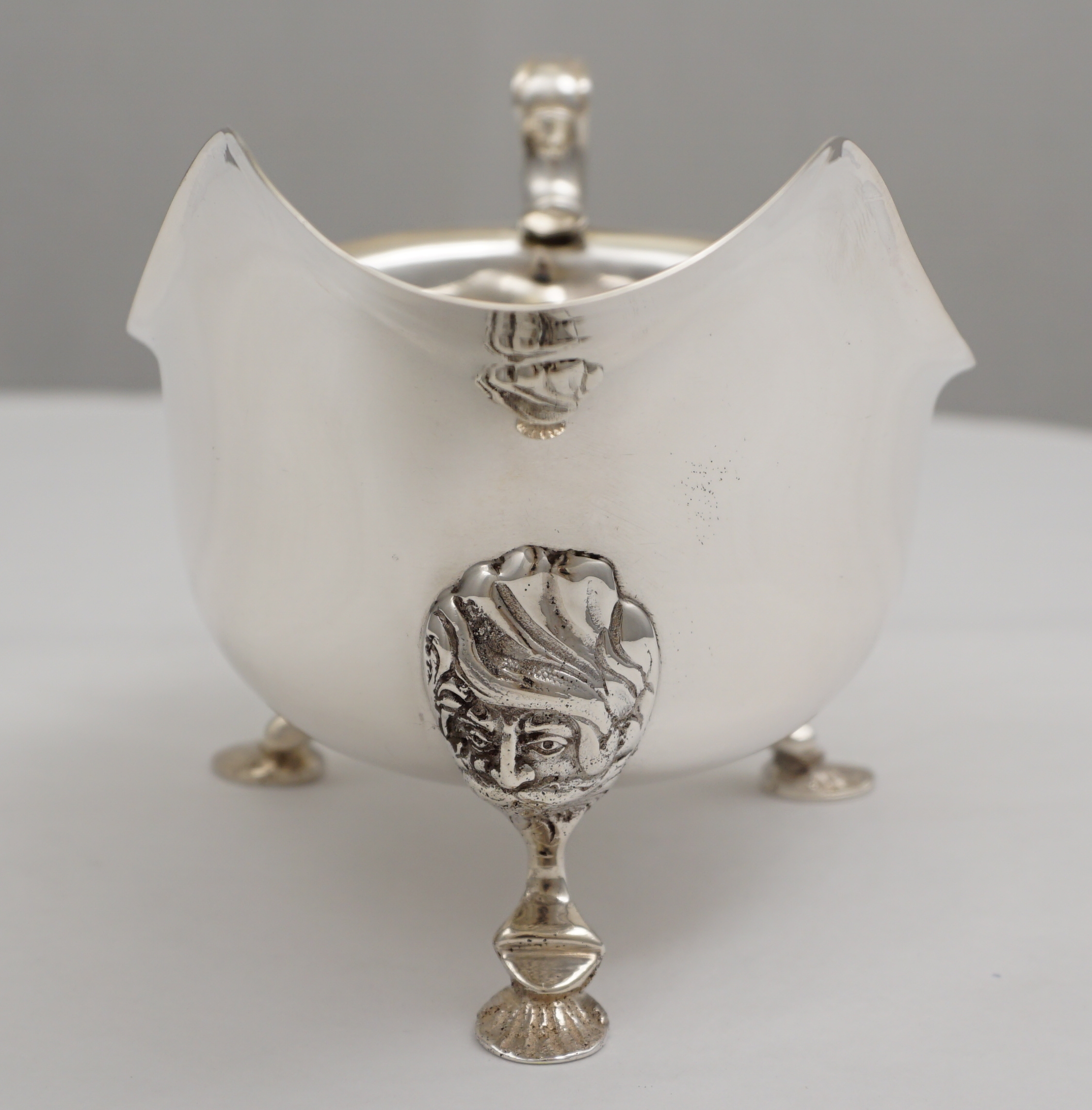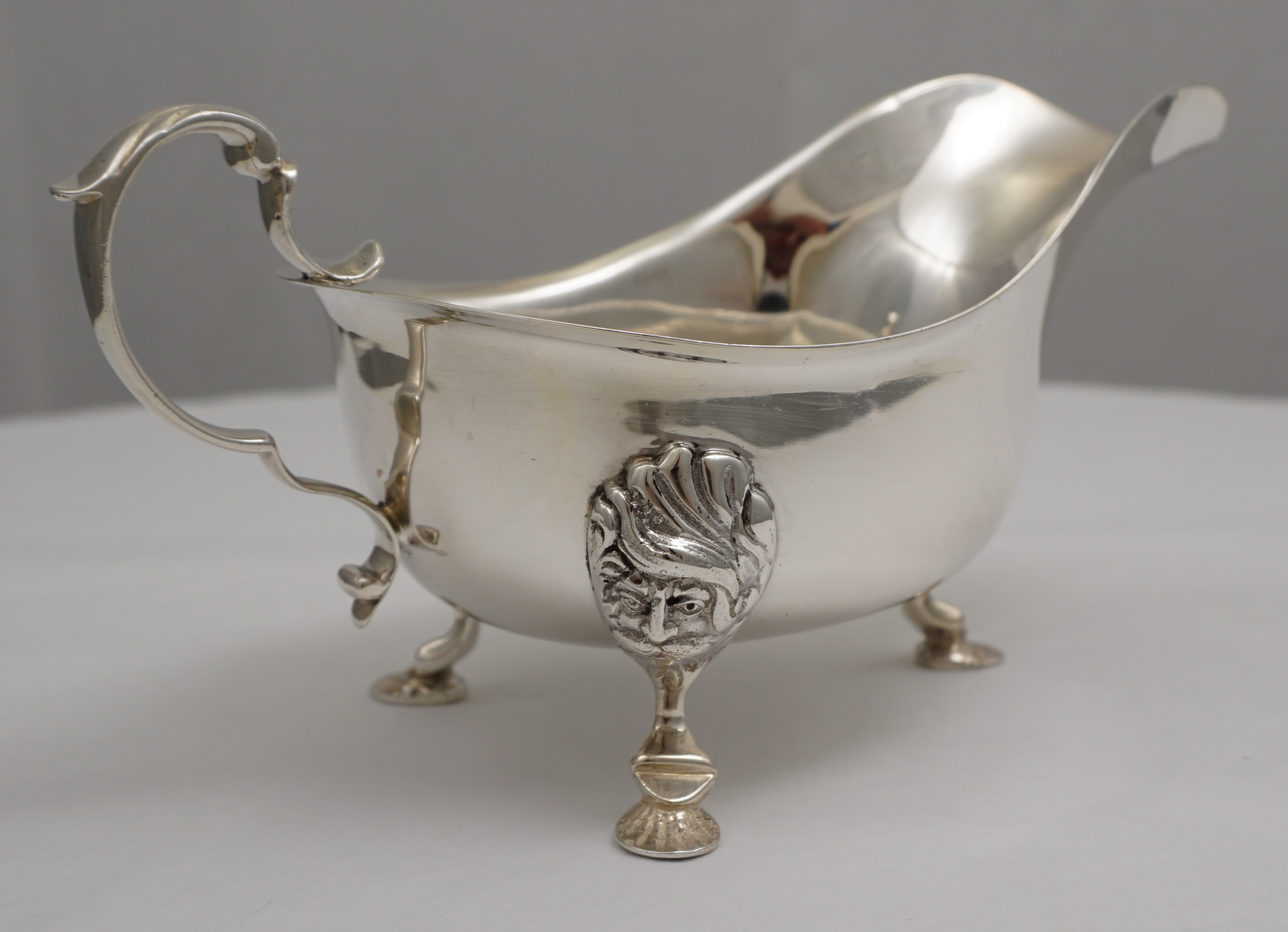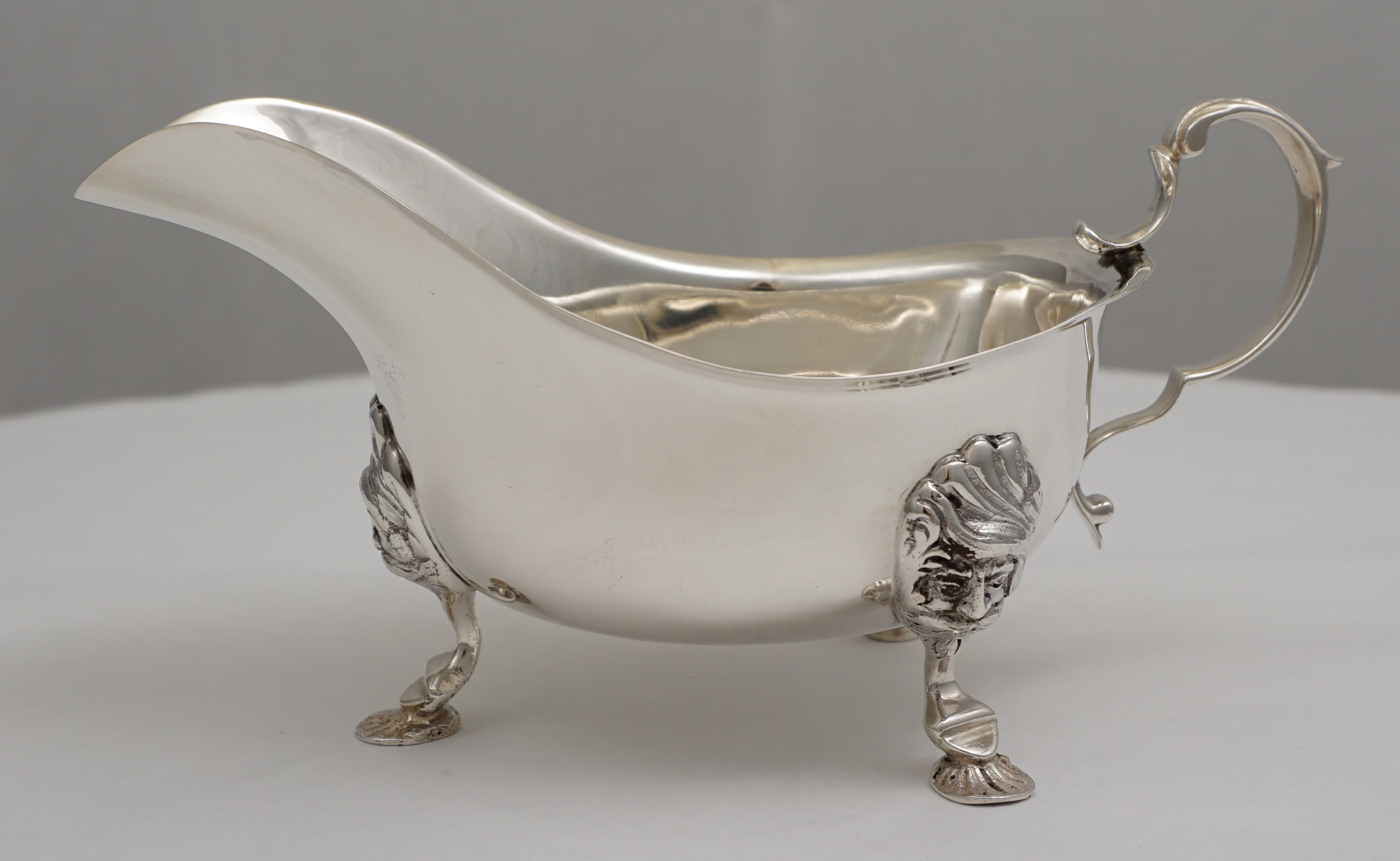 DESCRIPTION | Very good vintage Irish solid sterling silver sauce boat with three lion mask capped legs and shell feet. |