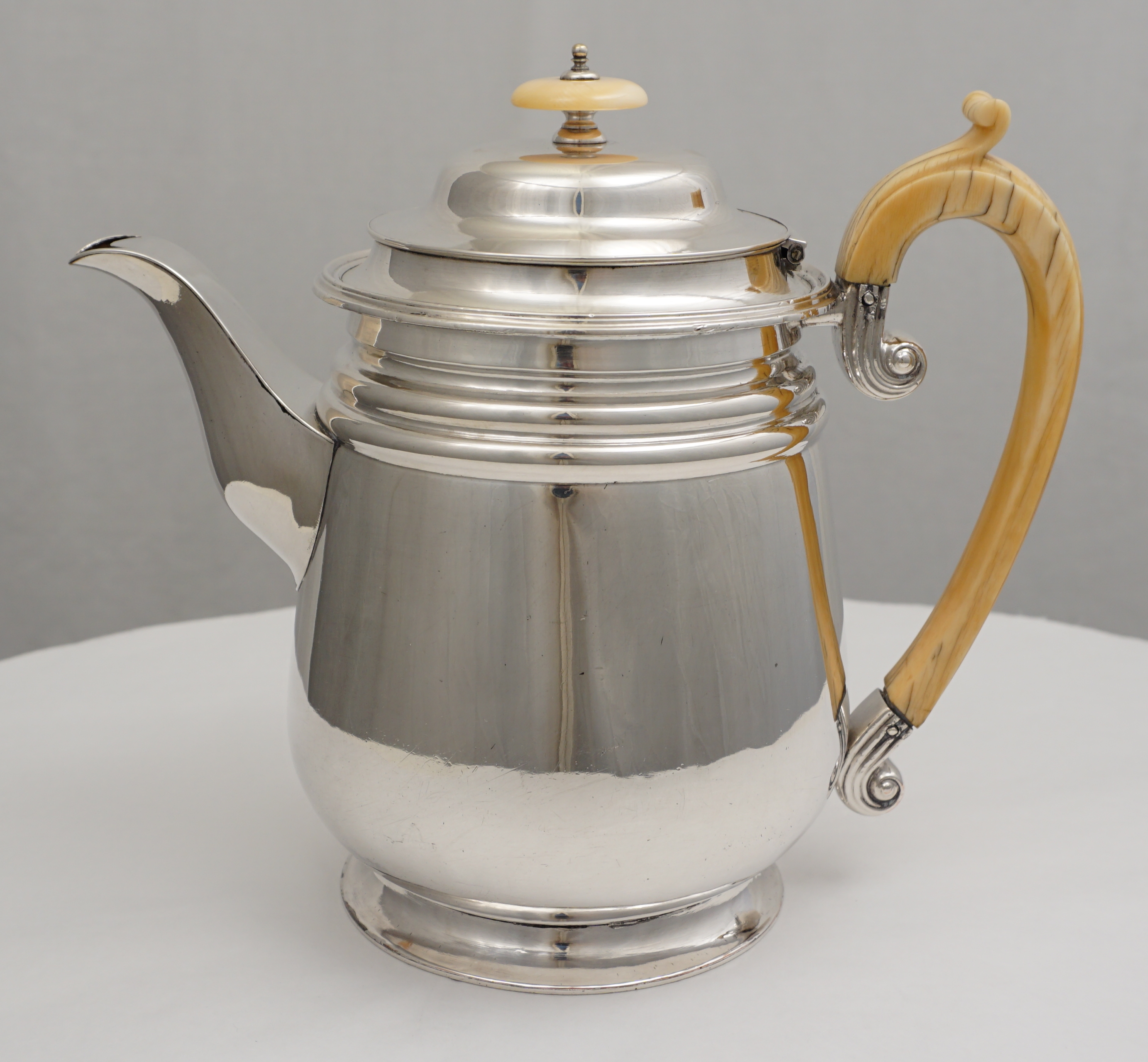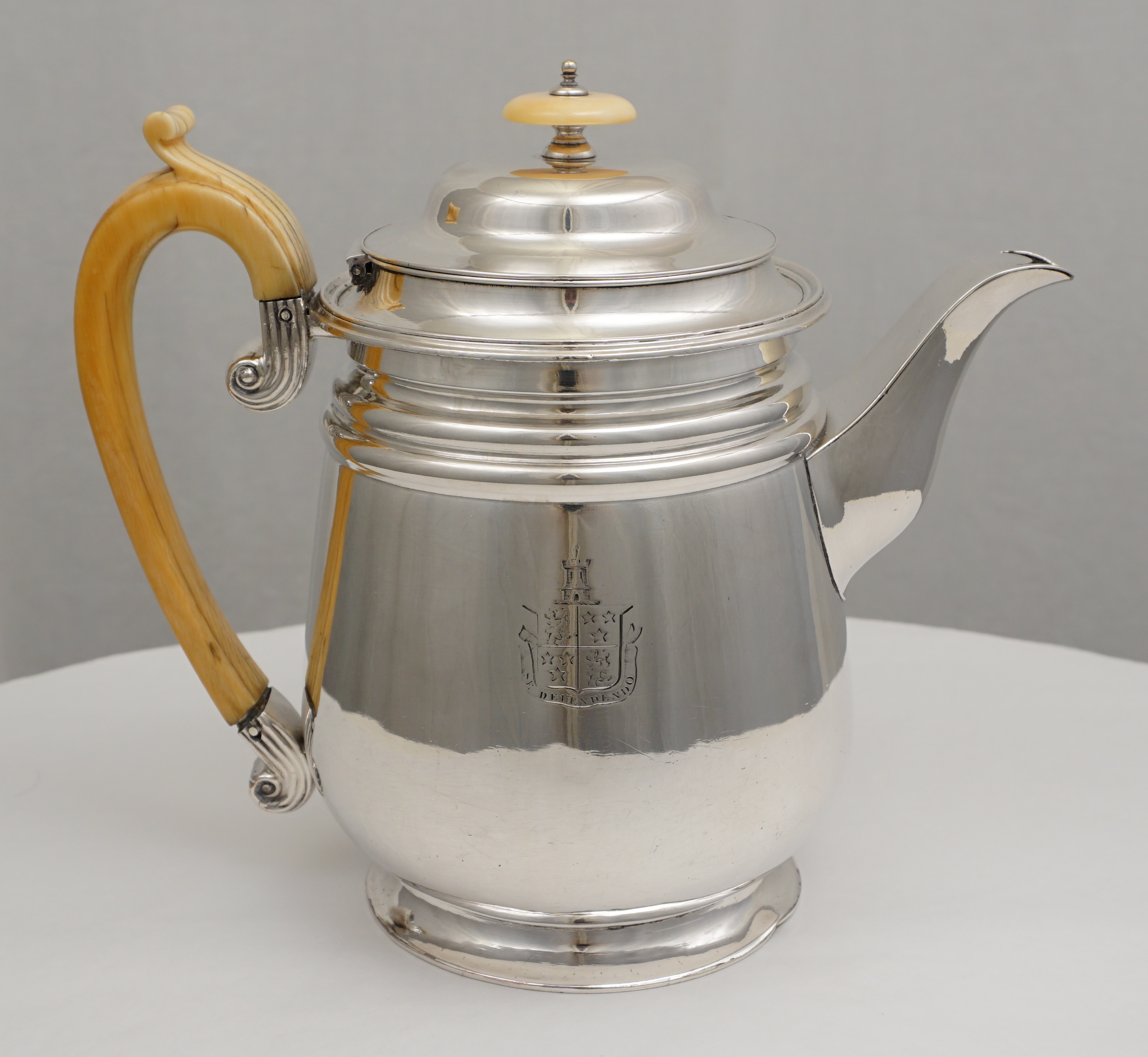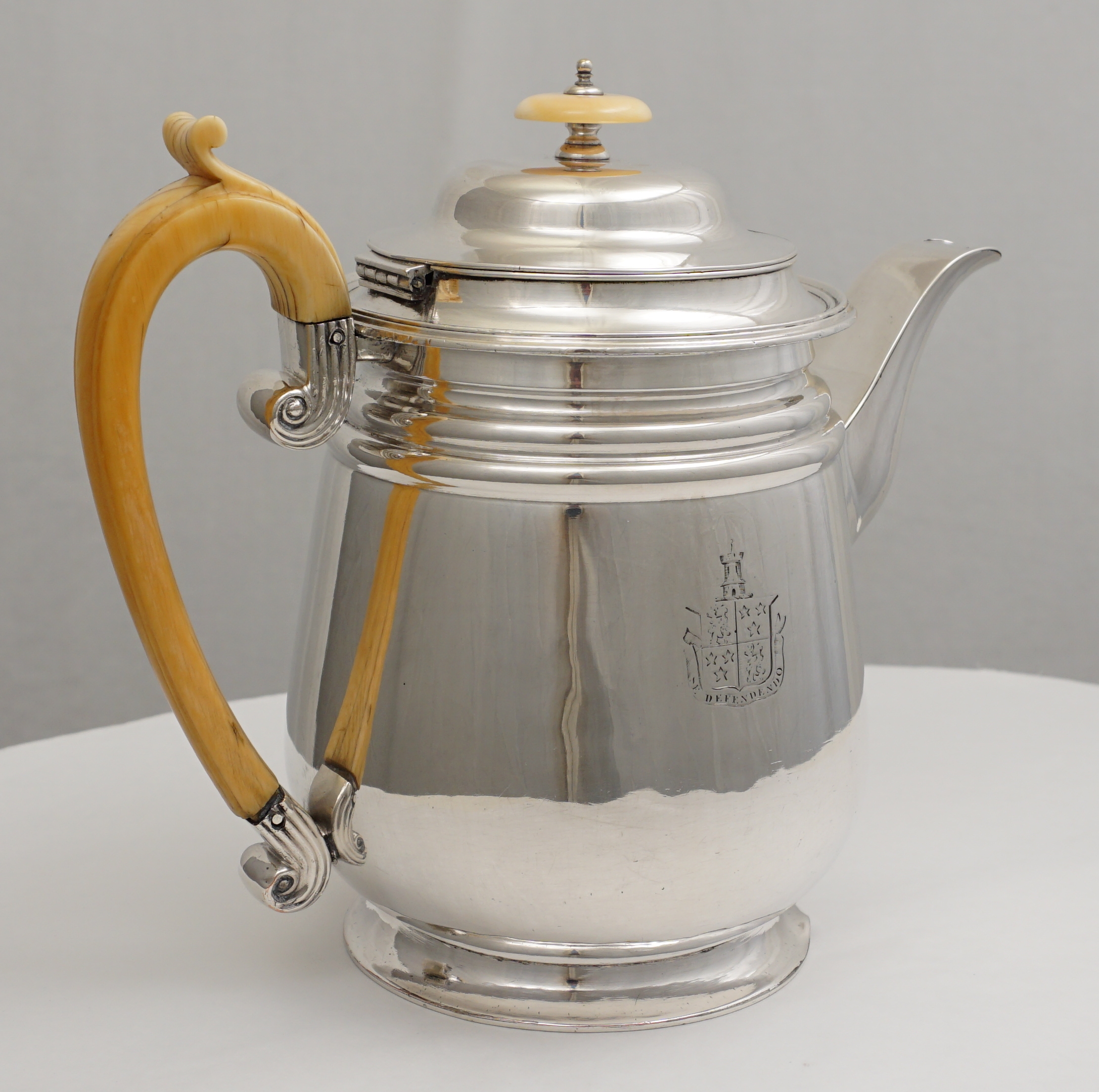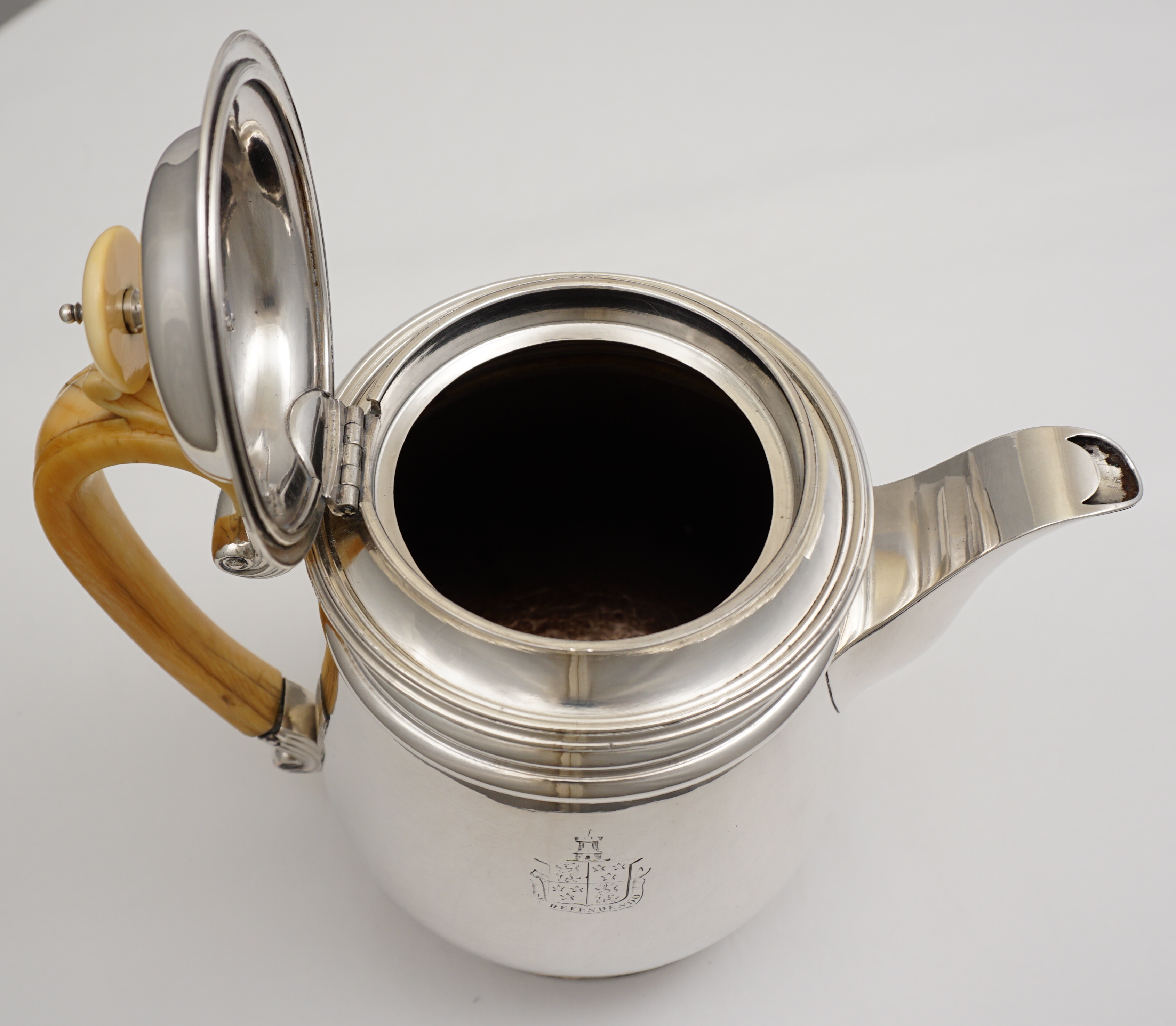 DESCRIPTION | Antique Georgian Old Sheffield Plate coffee Biggin with ivory handle and knop and engraved armorial to one side. The coffee biggin was invented in the 1780s by a Mr. Biggin. The idea is that you suspend your ground coffee within a cloth bag from the upper internal flange. Main issue was that the Georgian natural materials used in the bag could impart off flavours to the coffee so the biggin was not in fashion for long. Today biggins are simply used as a pot for coffee or tea. Due to the ivory content this item is available to for UK delivery only. It would be legal to export but I do not know enough about the paperwork required. |