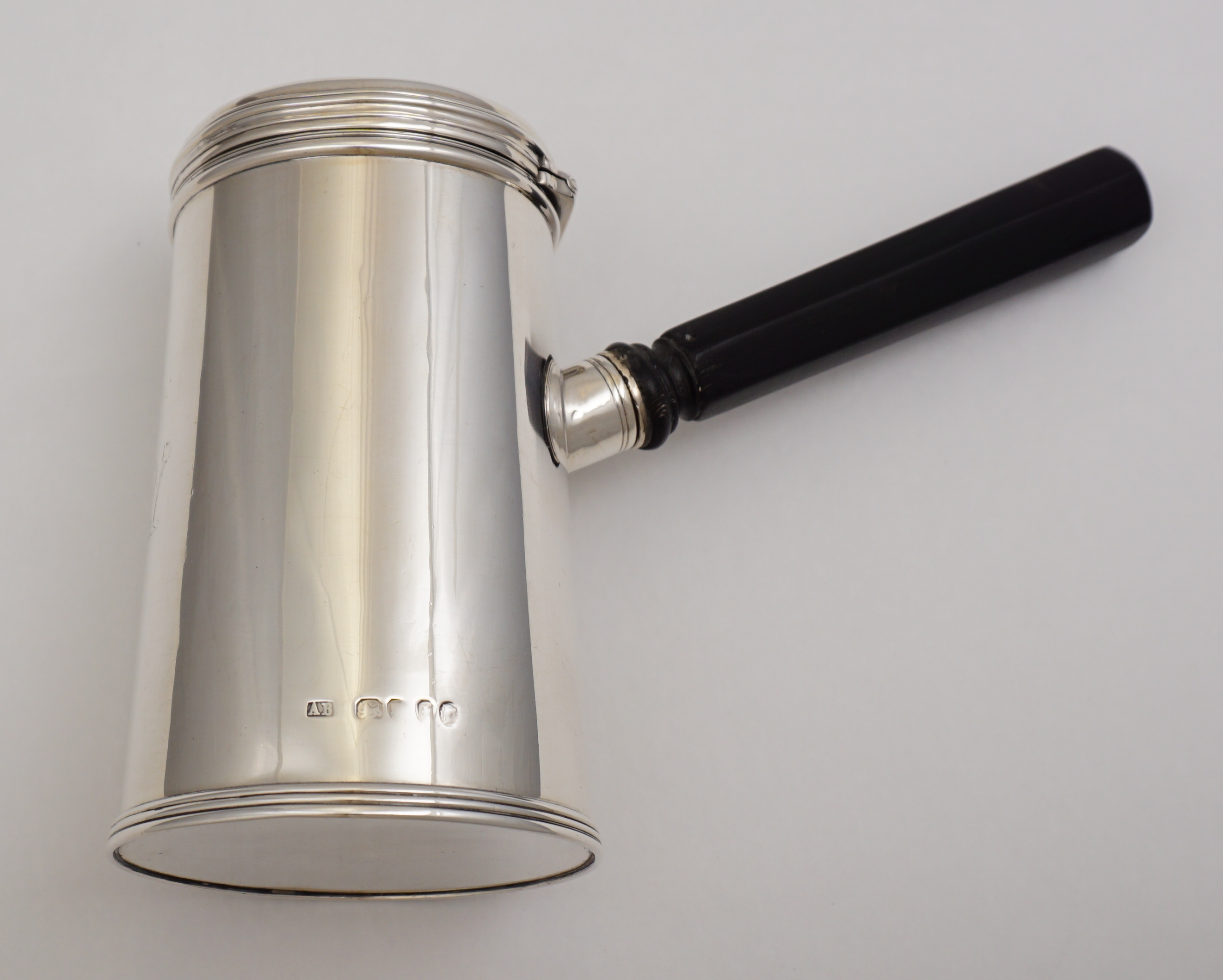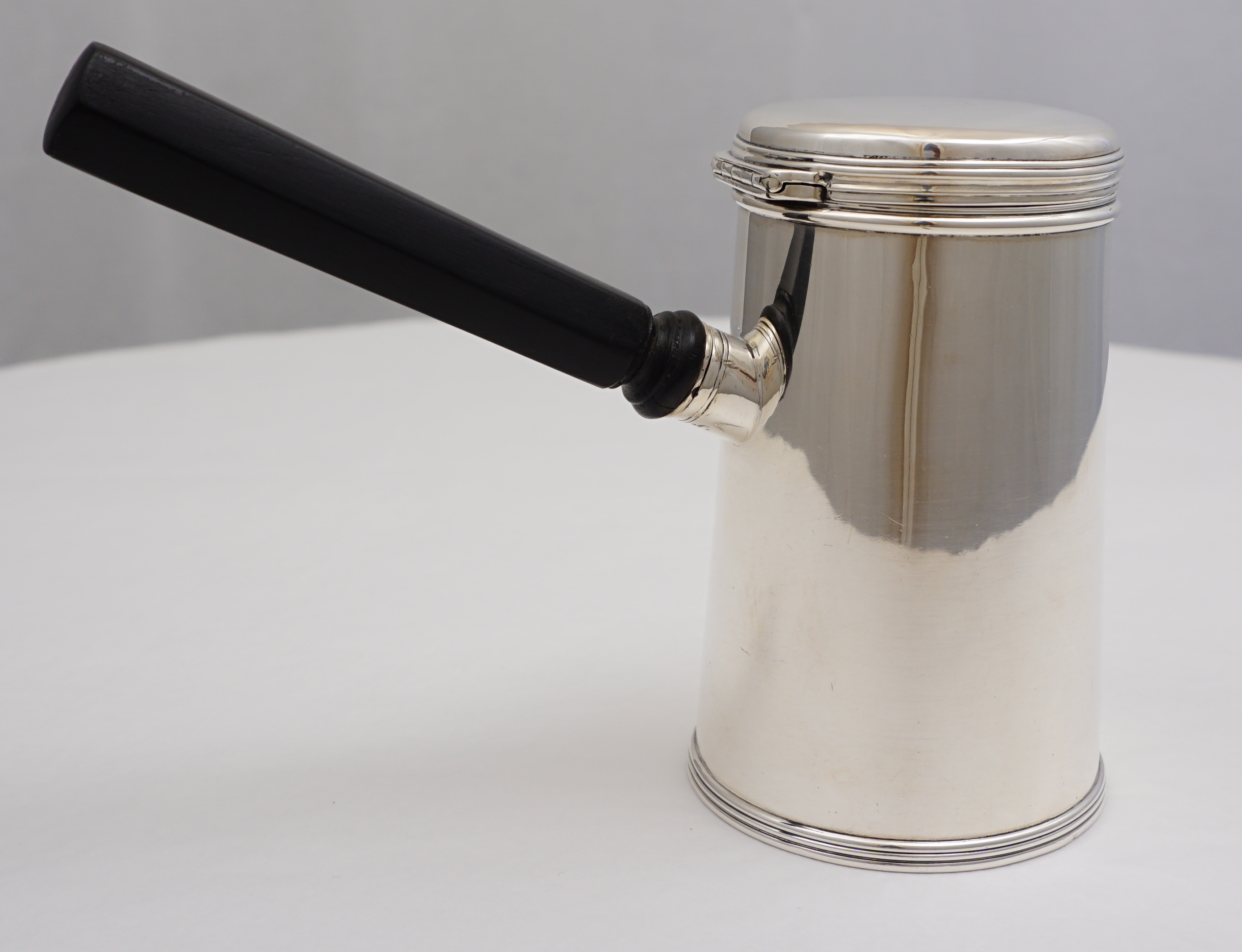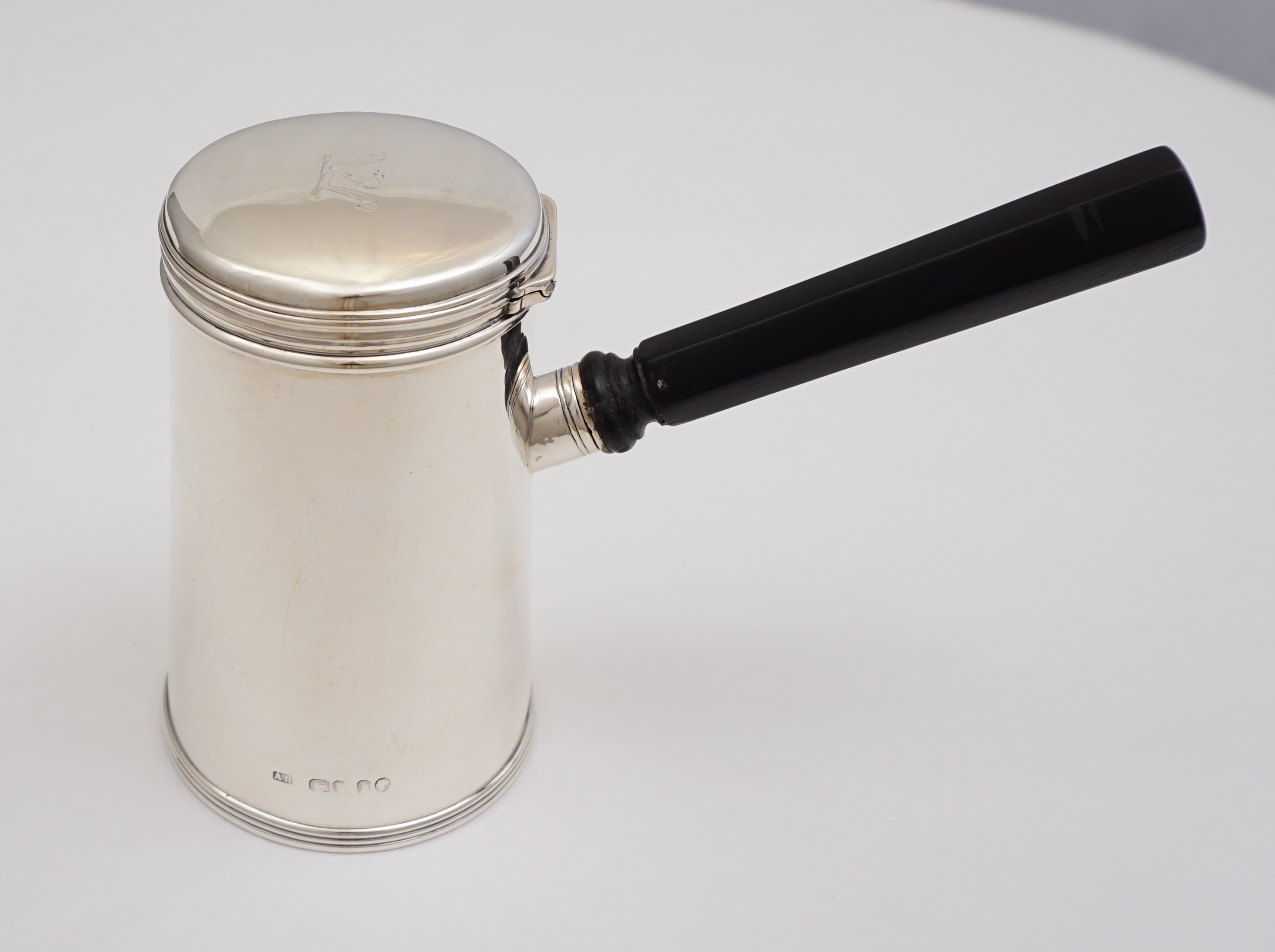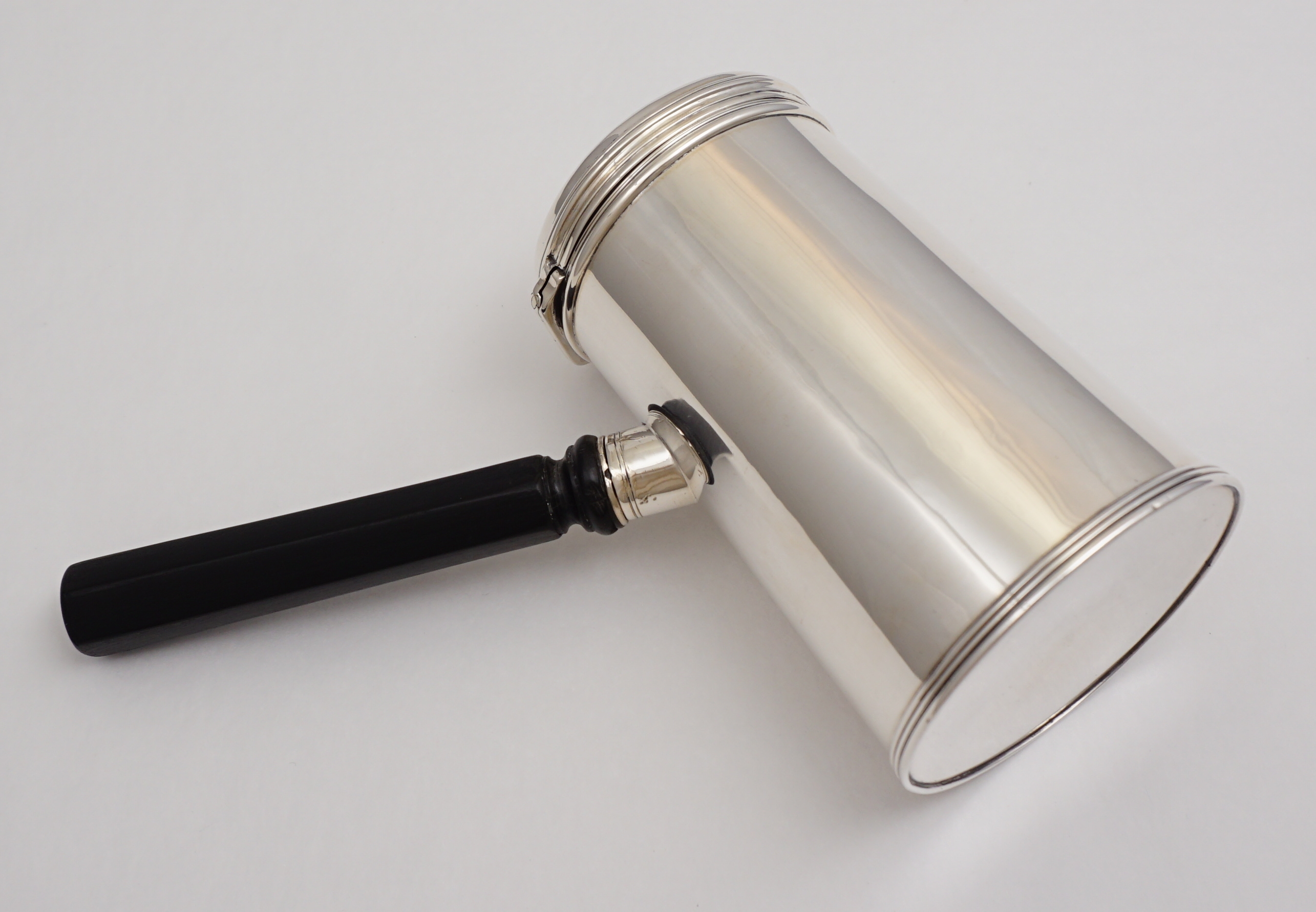 DESCRIPTION | Antique English Victorian solid sterling silver travelling pot with a crest engraving to the body and hinged lid and an unscrewable hexaform ebony handle that will fit inside the body. Similar lidded pots have been noted as part of travelling shaving sets and this maker is noted for shaving sets but I am still not certain of the exact purpose of this pot. The base is correctly hallmarked as a separate piece (in construction) yet the marks have been placed to the inside. This is unusual. Perhaps the contents were warmed over a spirit burner or candle and the maker wanted to protect his marks. If so, this pot was likely used to warm the water for your shave. All thoughts are welcome. Detectable but not strong smell of old fashioned scent from within the pot. |