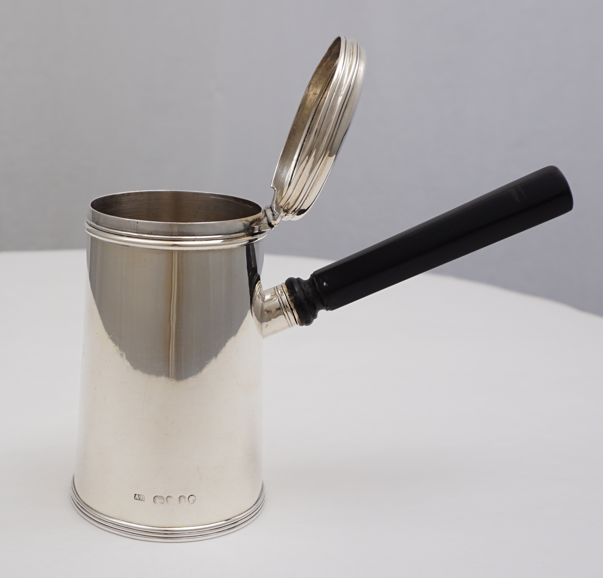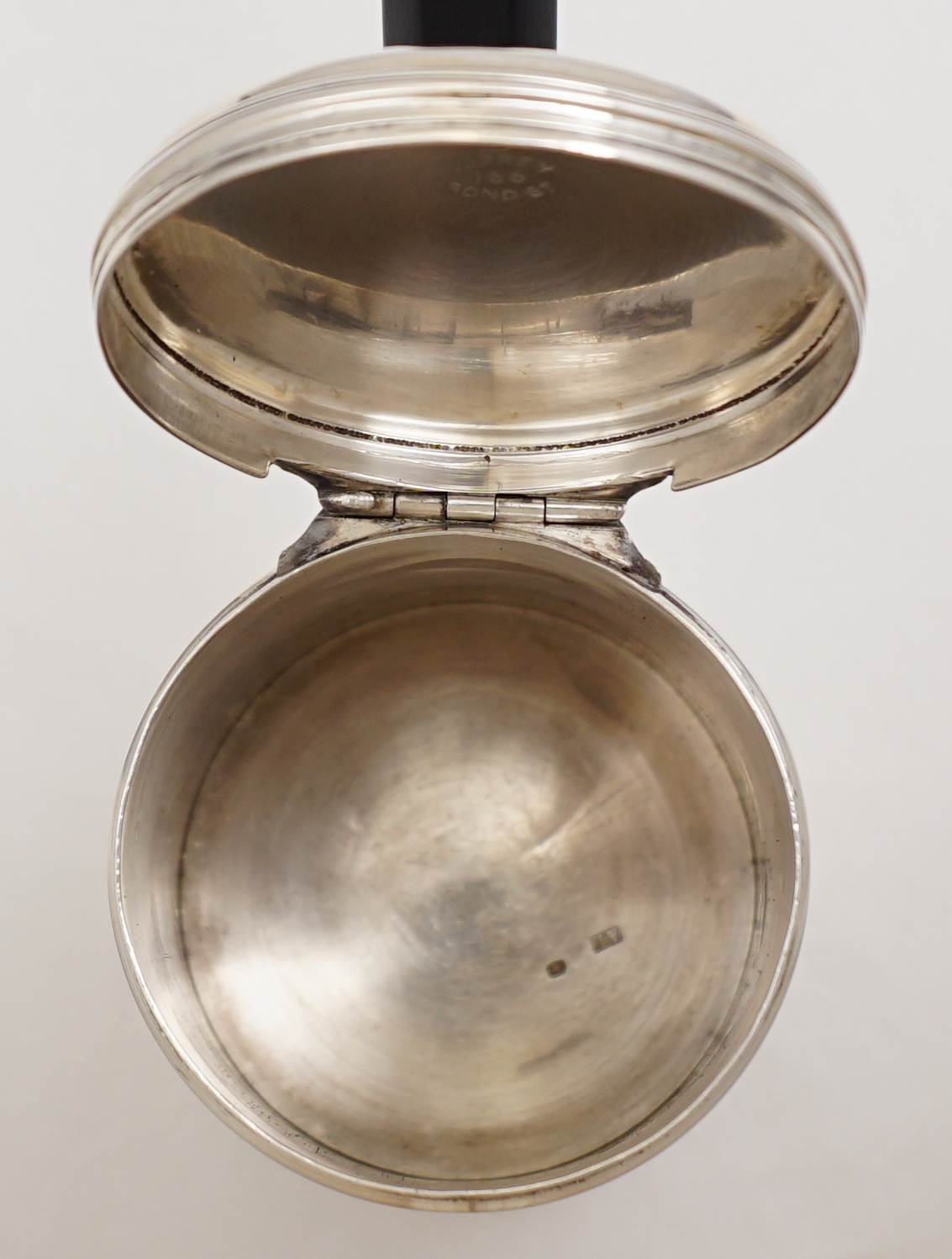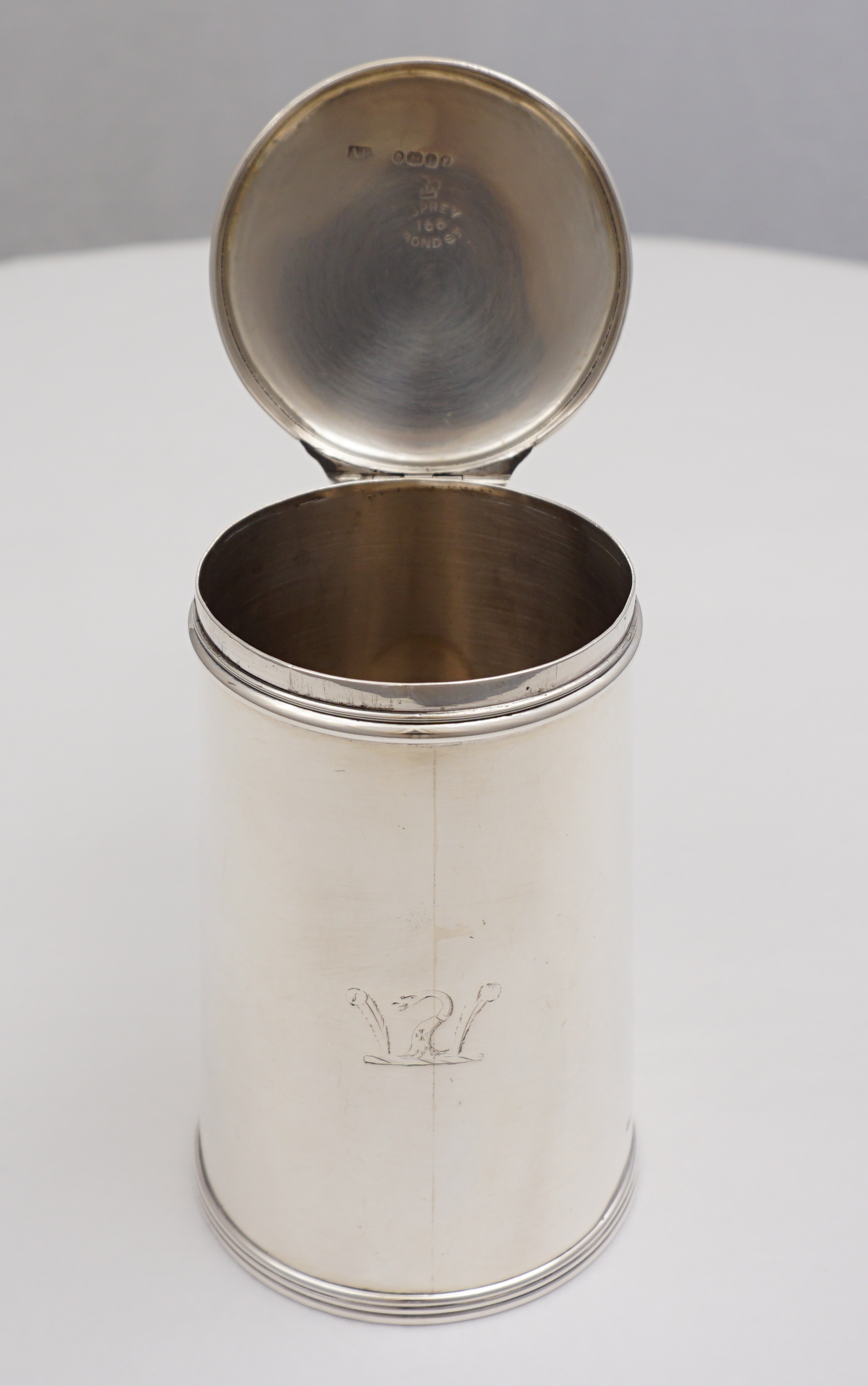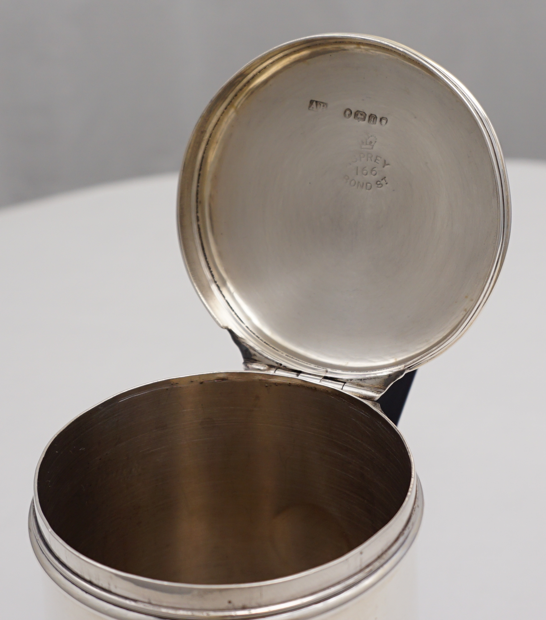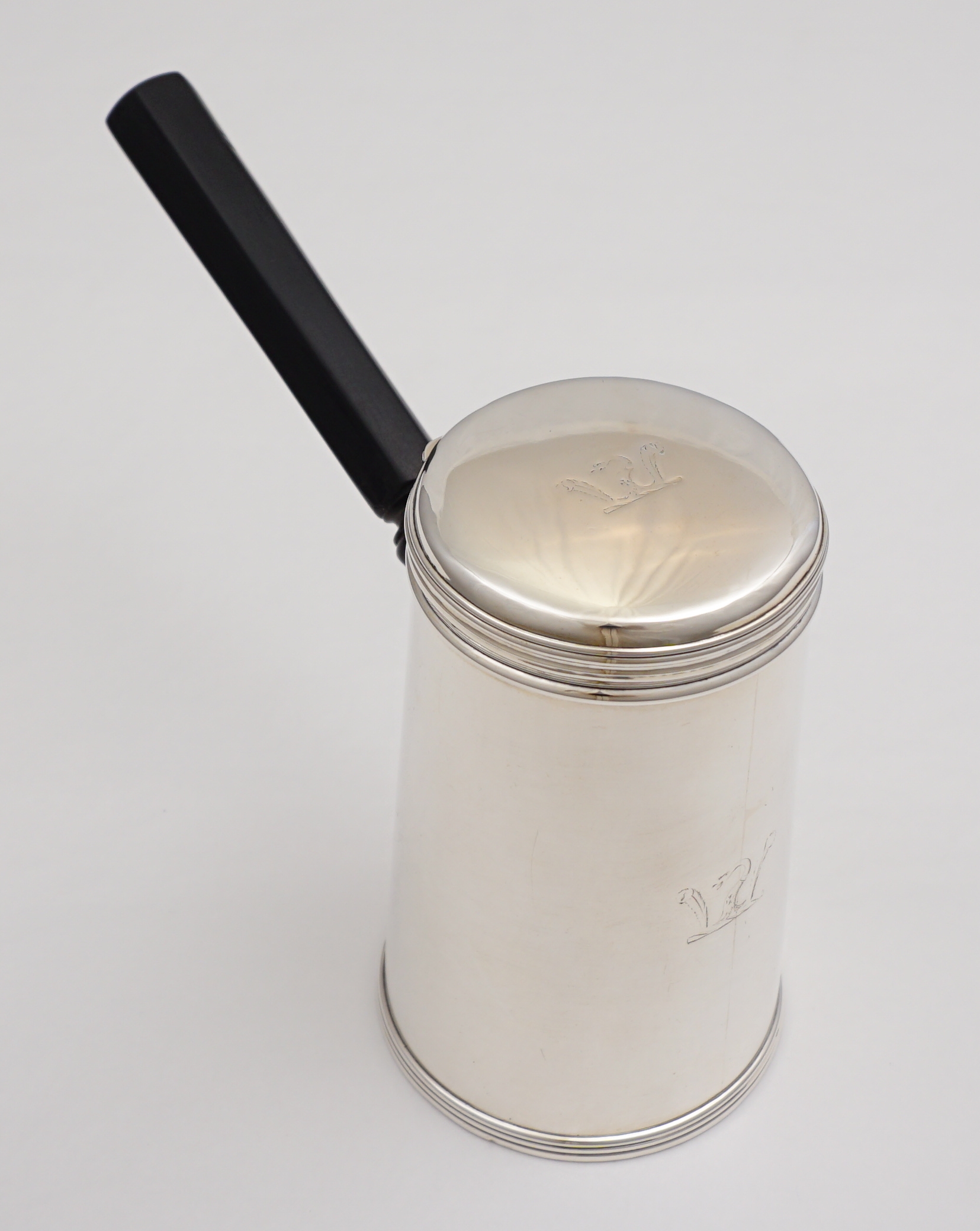 DESCRIPTION | Antique English Victorian solid sterling silver travelling pot with a crest engraving to the body and hinged lid and an unscrewable hexaform ebony handle that will fit inside the body. Similar lidded pots have been noted as part of travelling shaving sets and this maker is noted for shaving sets but I am still not certain of the exact purpose of this pot. The base is correctly hallmarked as a separate piece (in construction) yet the marks have been placed to the inside. This is unusual. Perhaps the contents were warmed over a spirit burner or candle and the maker wanted to protect his marks. If so, this pot was likely used to warm the water for your shave. All thoughts are welcome. Detectable but not strong smell of old fashioned scent from within the pot. |