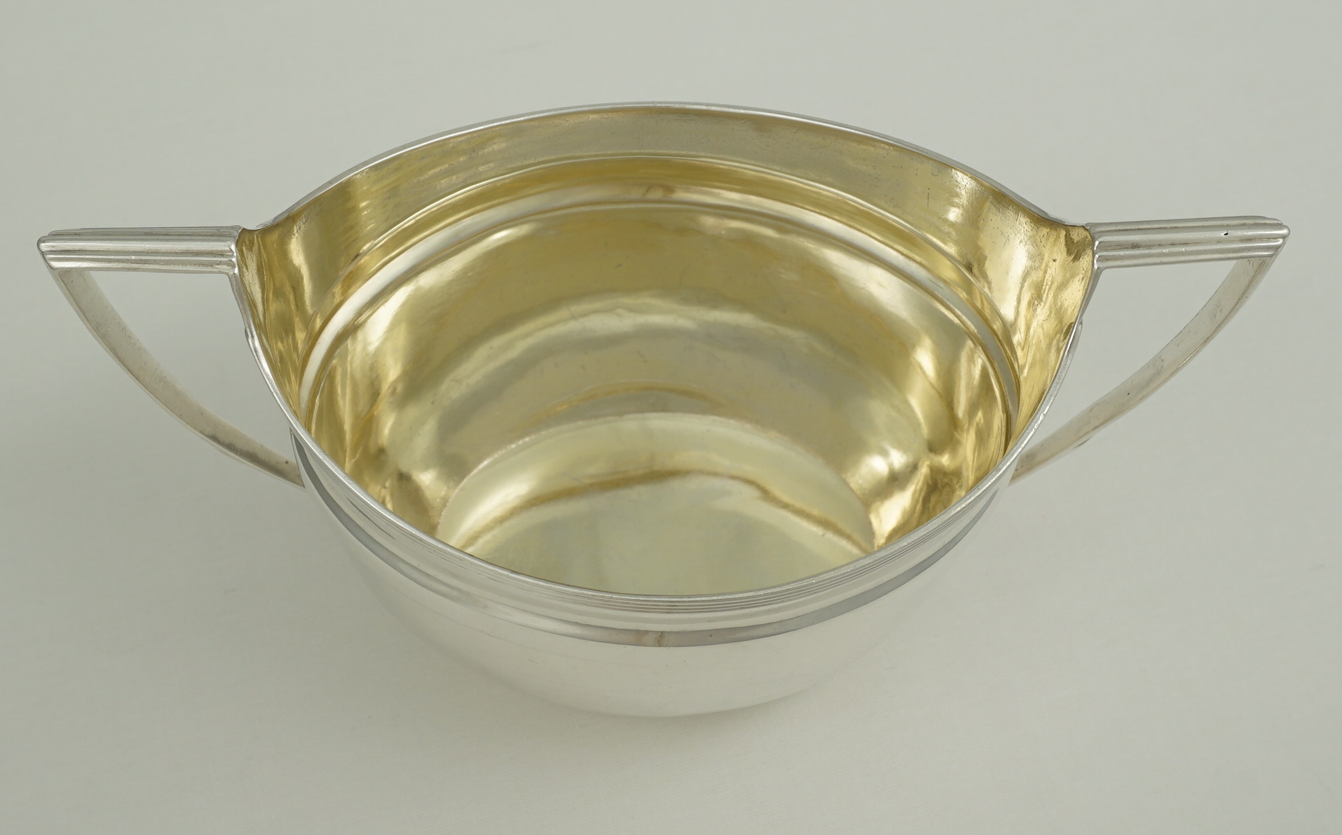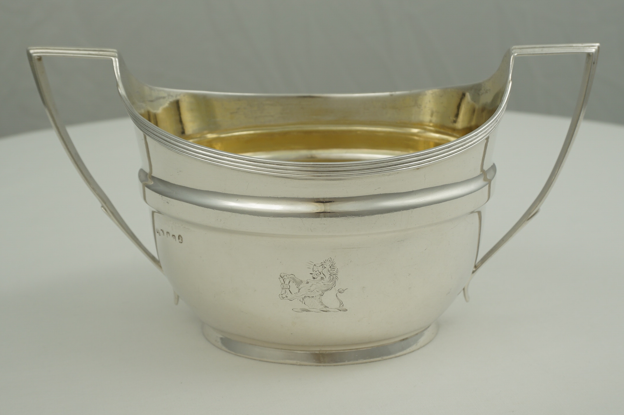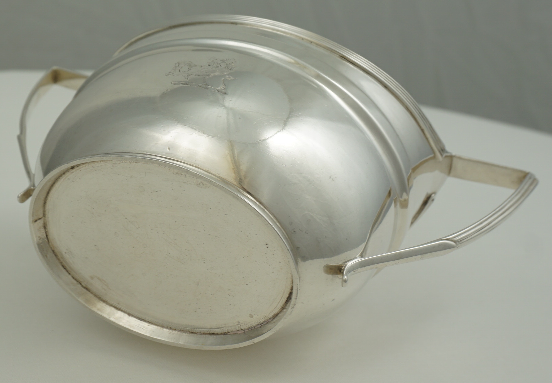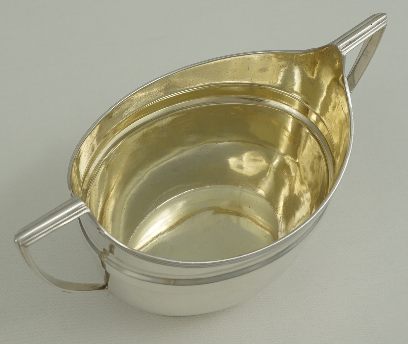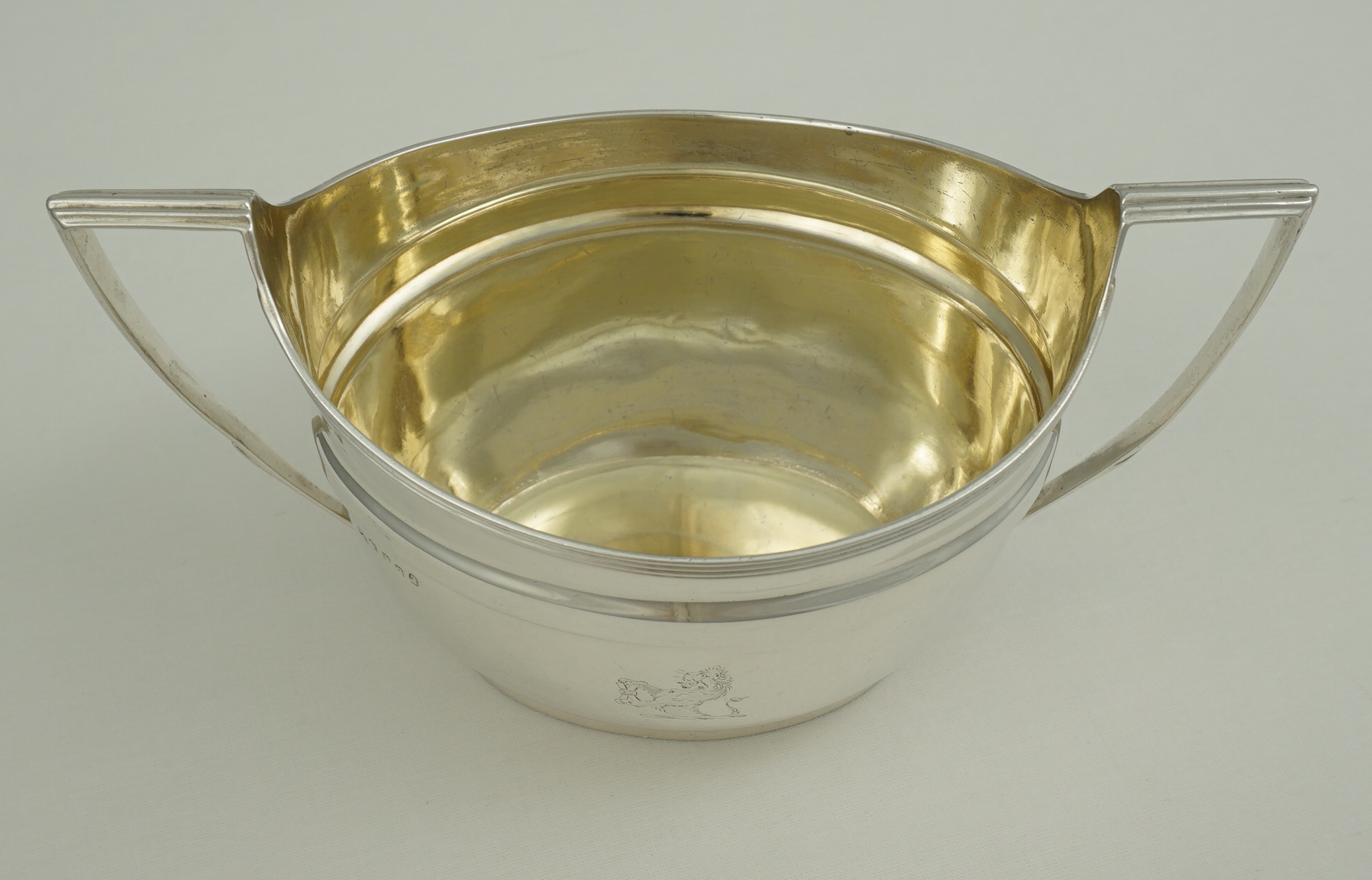 DESCRIPTION | Very good, large, antique English Georgian solid sterling silver two handled sugar basin (bowl) with thread decoration, a fully gilded interior and crest engraving to one side. |