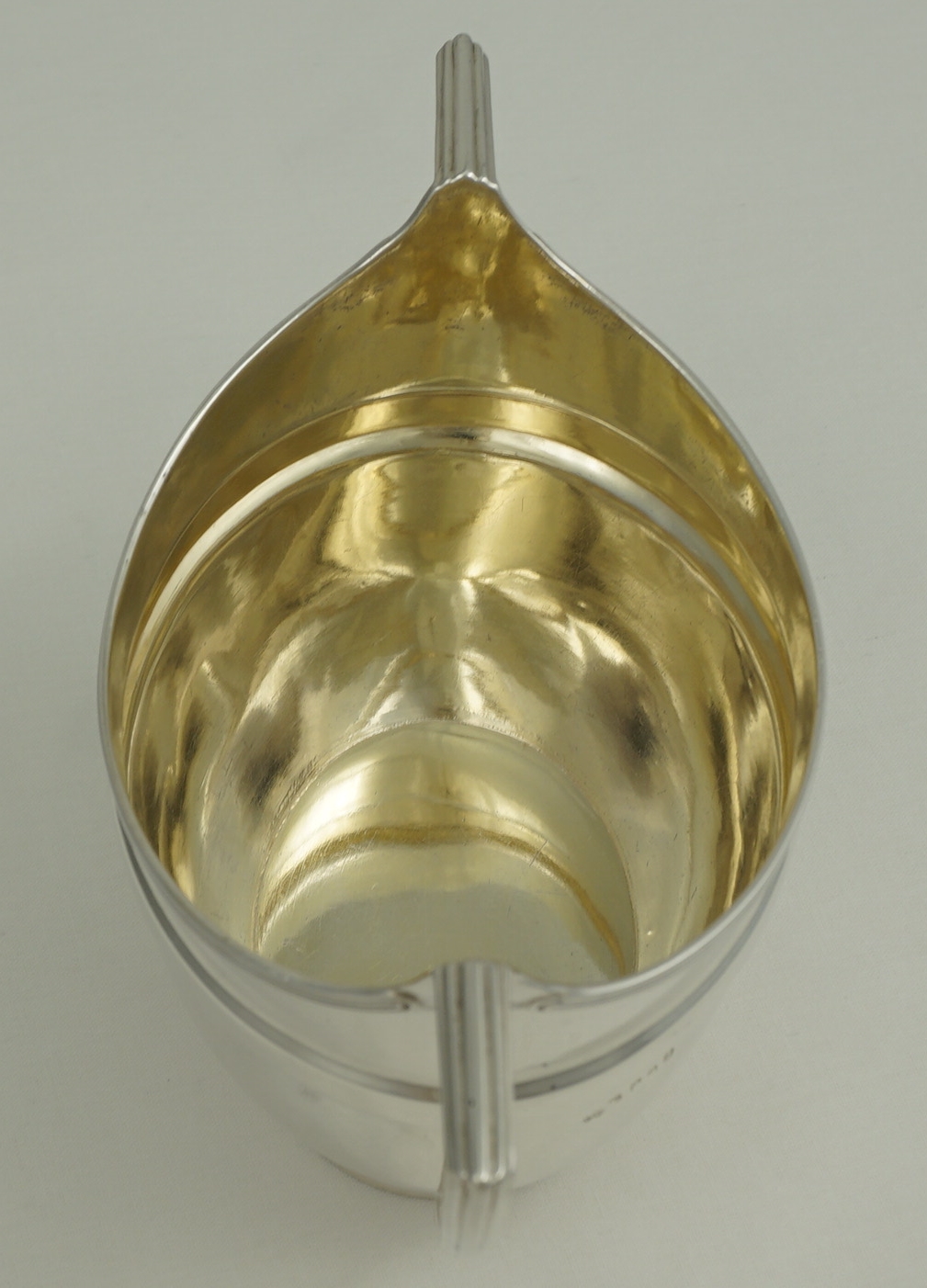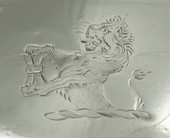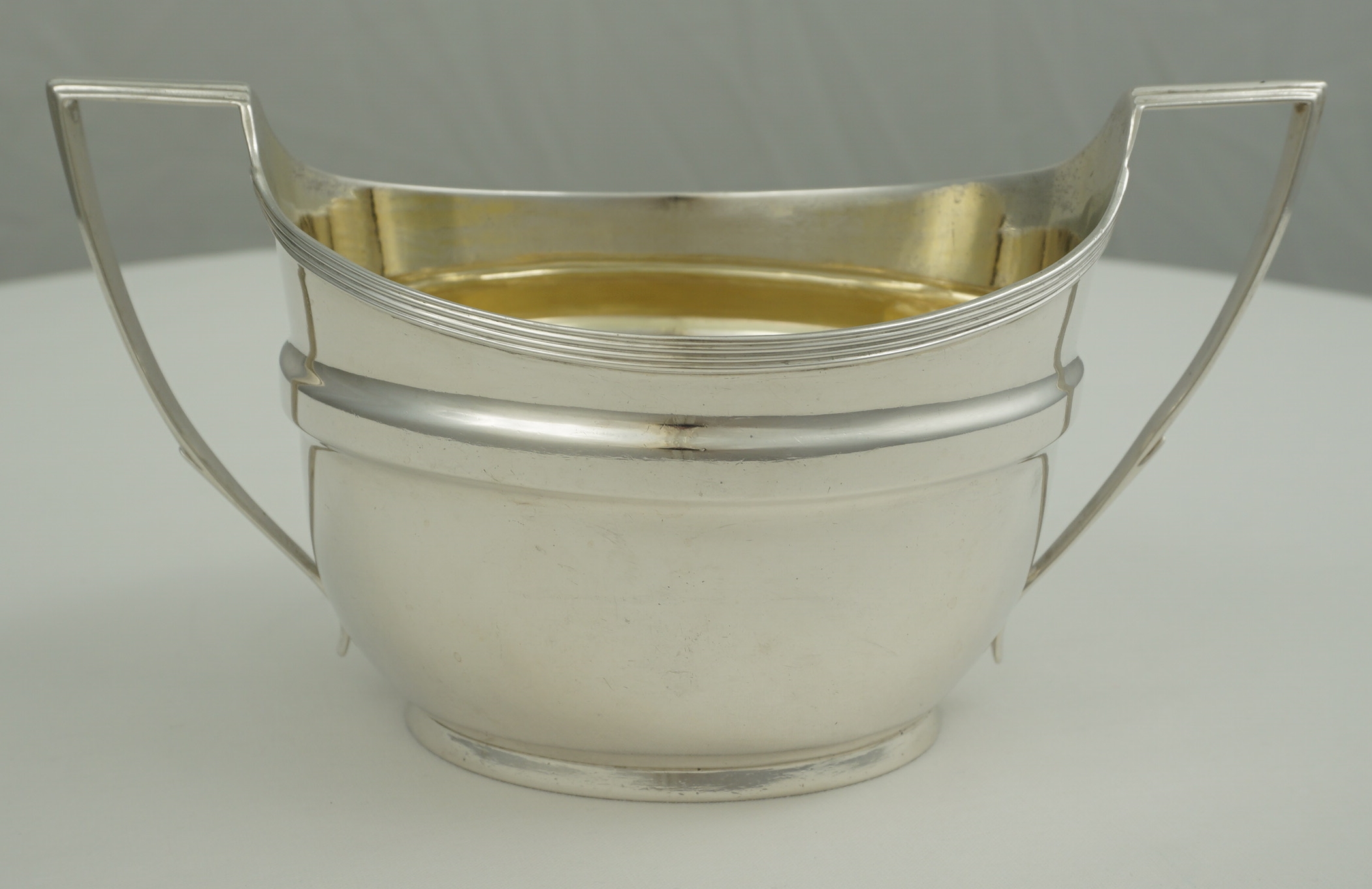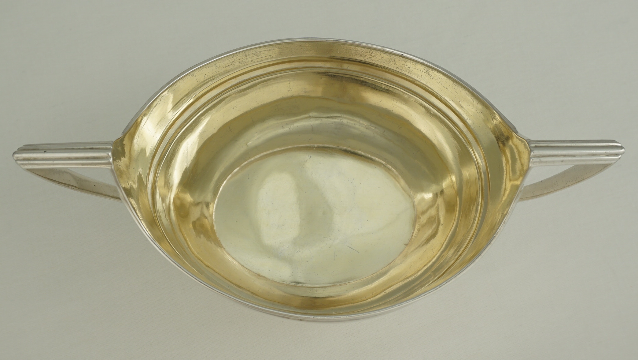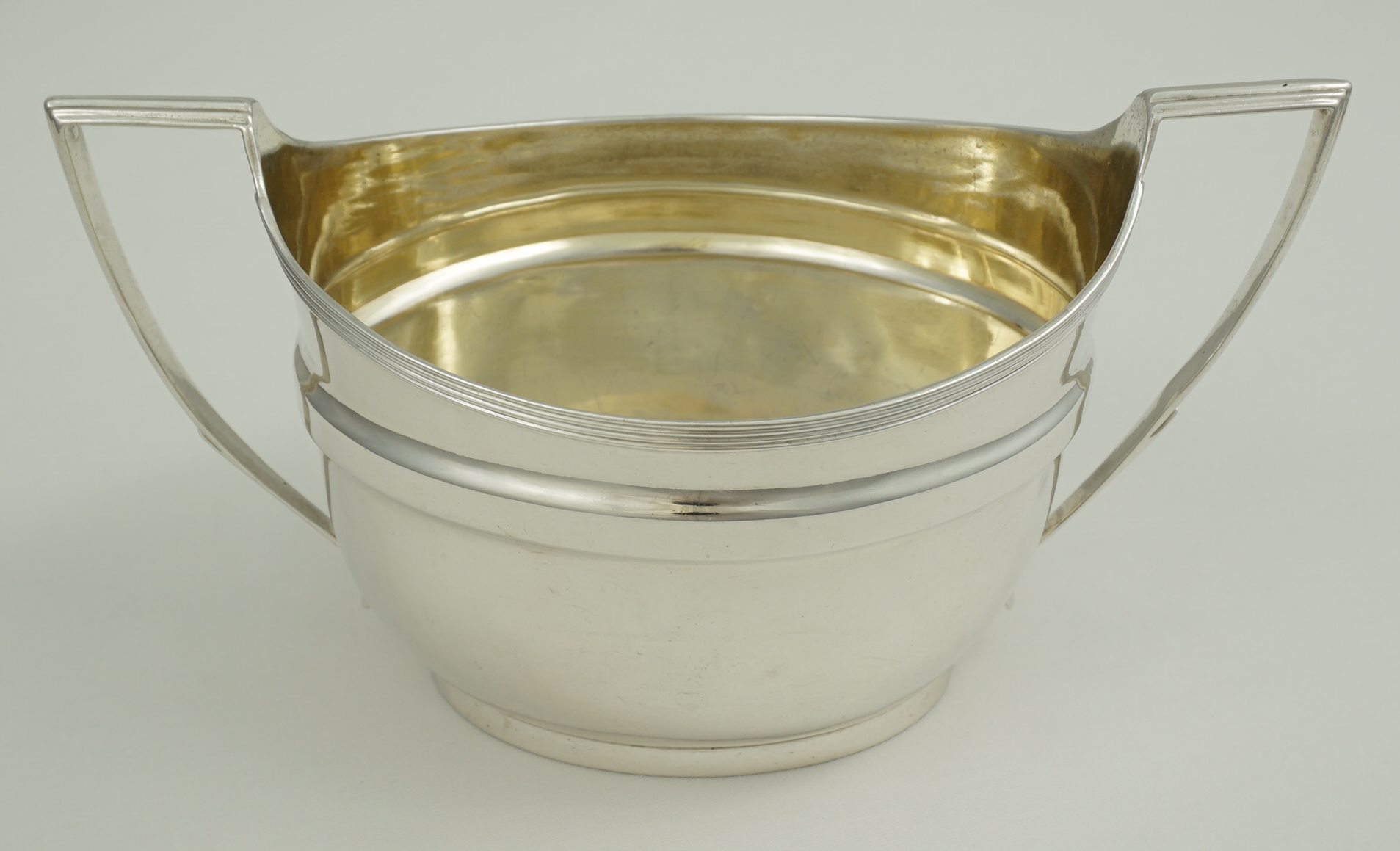 DESCRIPTION | Very good, large, antique English Georgian solid sterling silver two handled sugar basin (bowl) with thread decoration, a fully gilded interior and crest engraving to one side. |