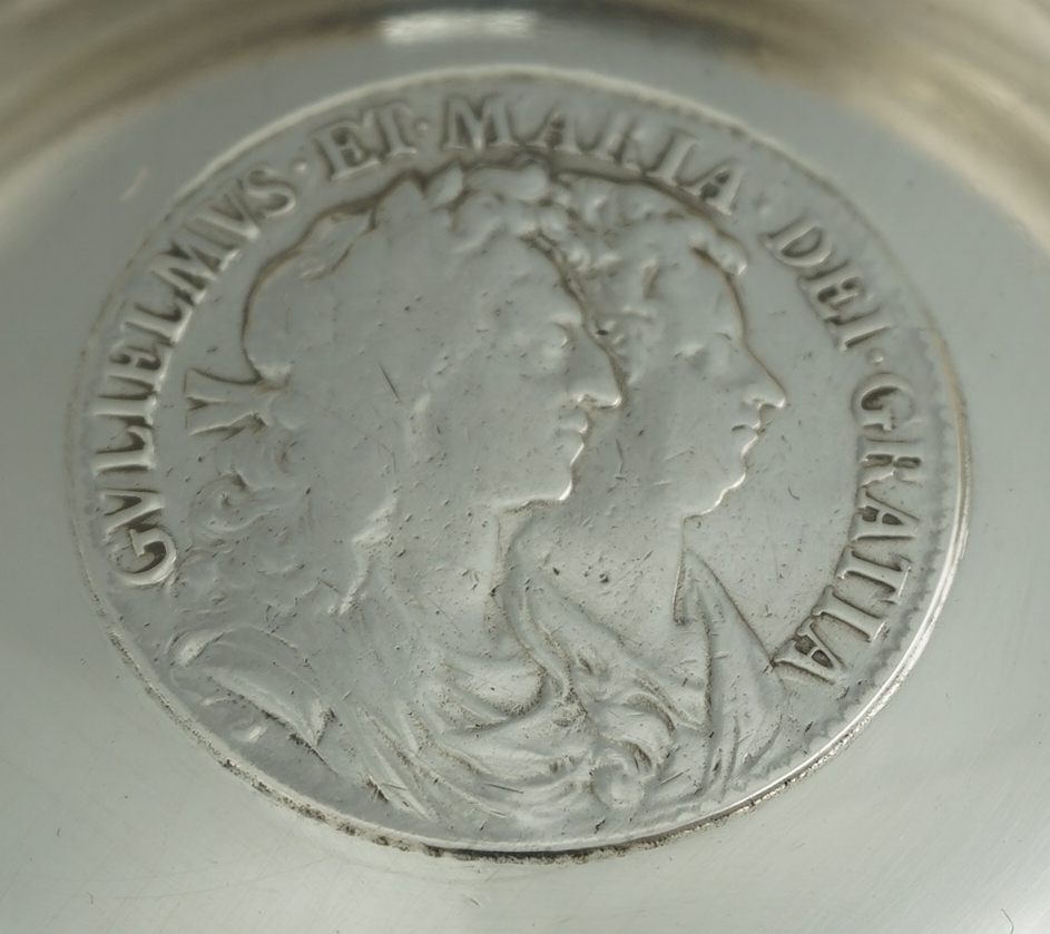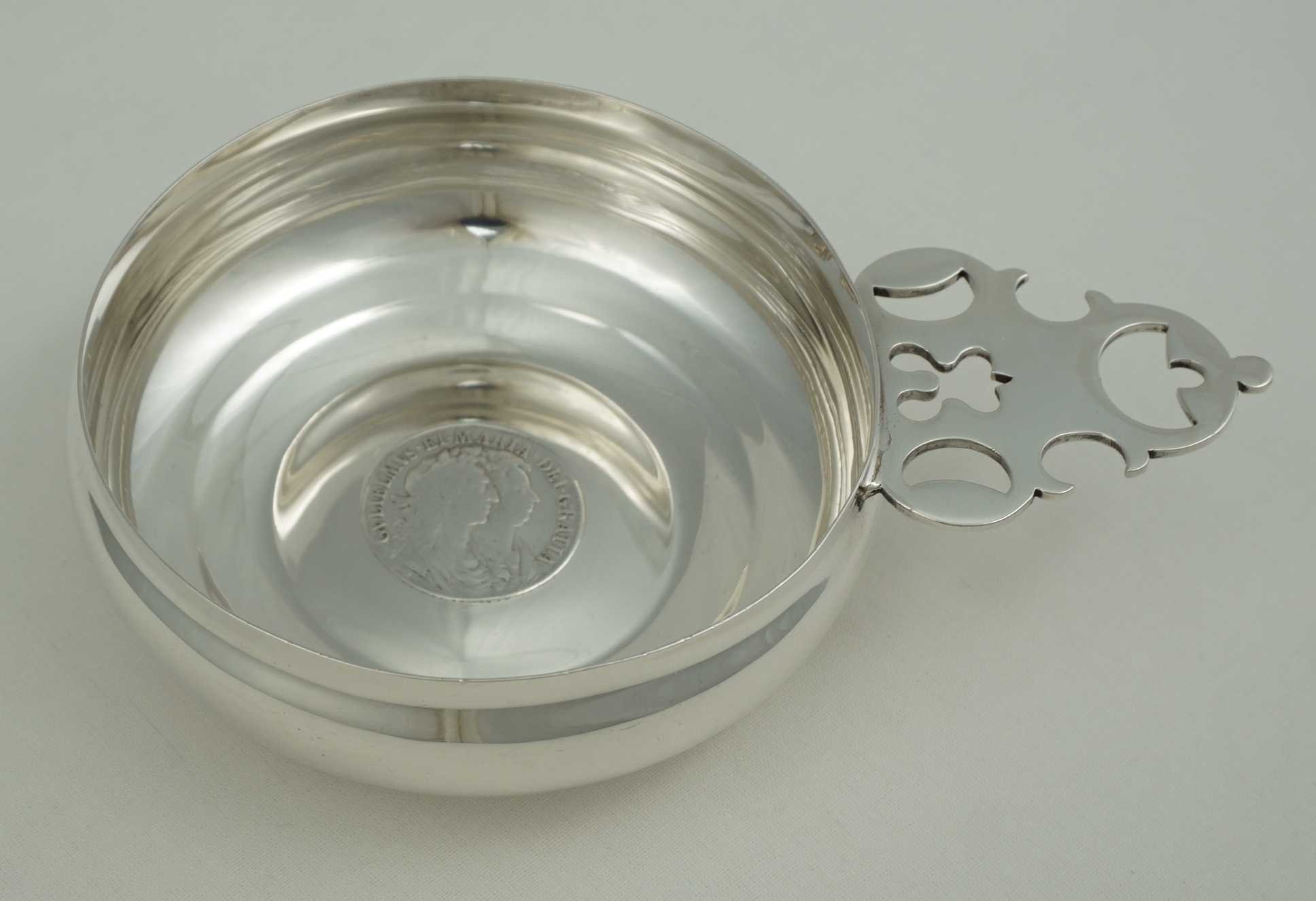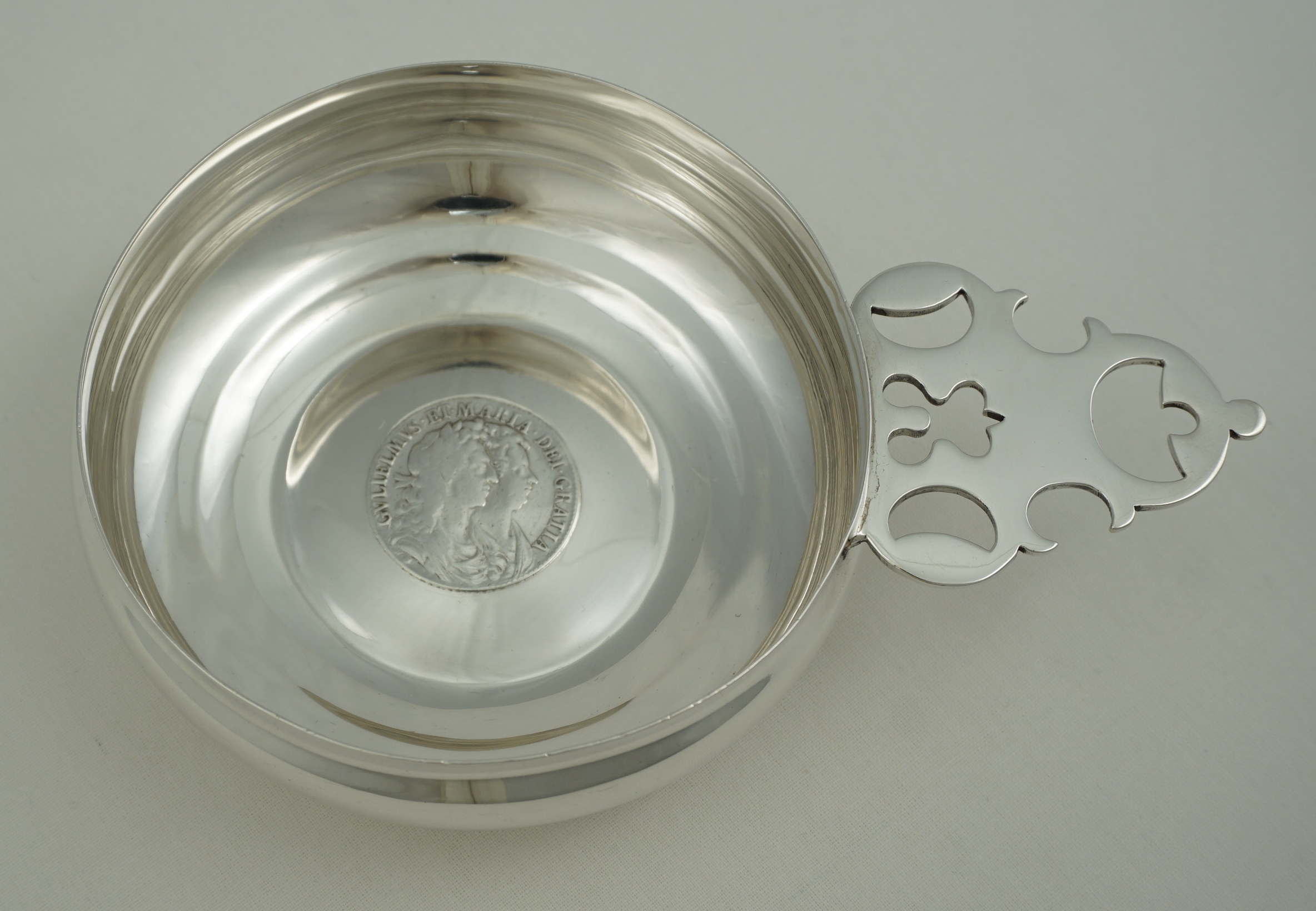 DESCRIPTION | Antique English Edwardian solid sterling silver reproduction of a 17th century porringer, the bowl inset with a silver 1689 William & Mary half crown coin. |