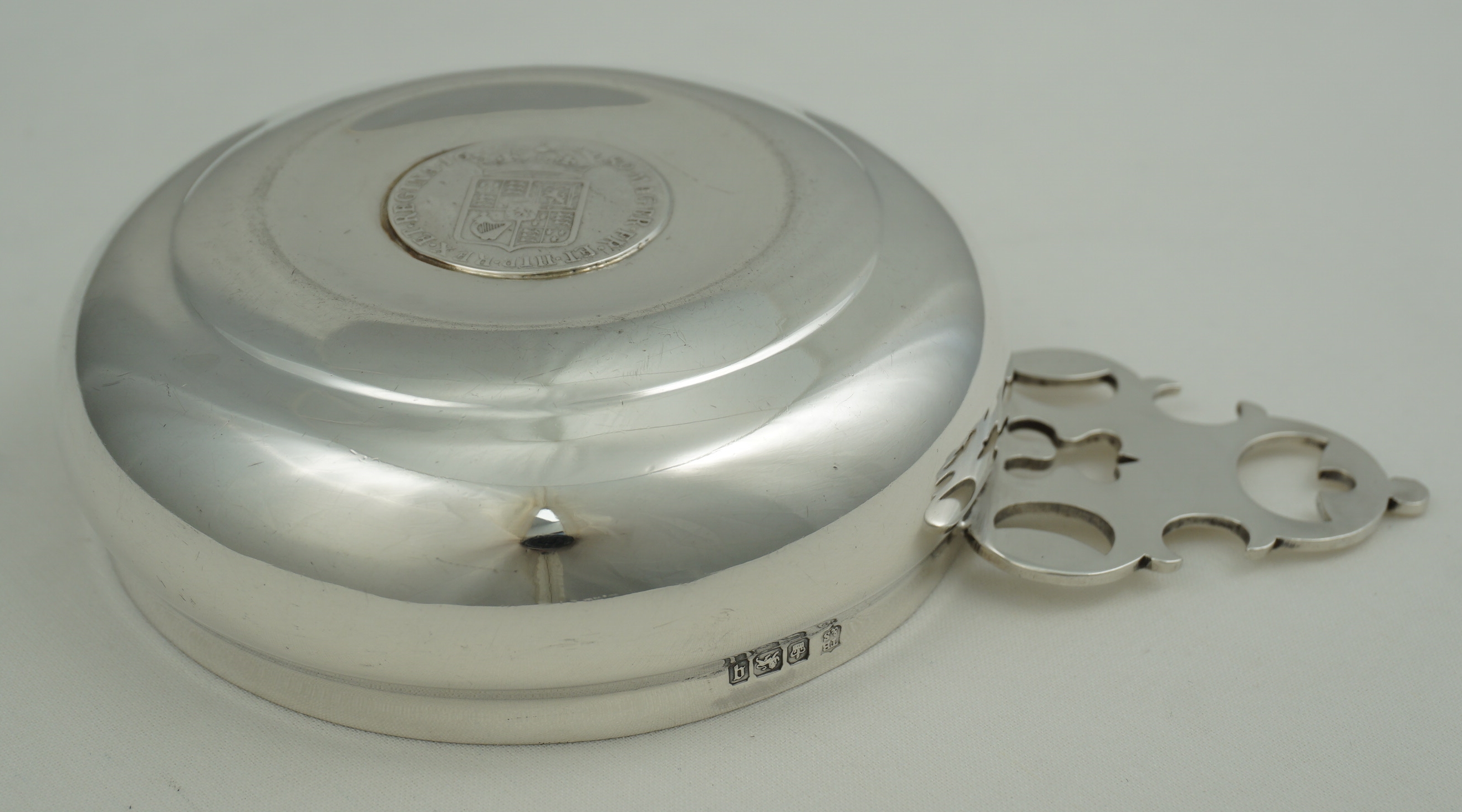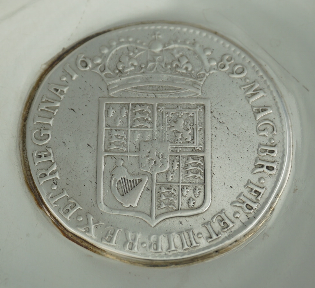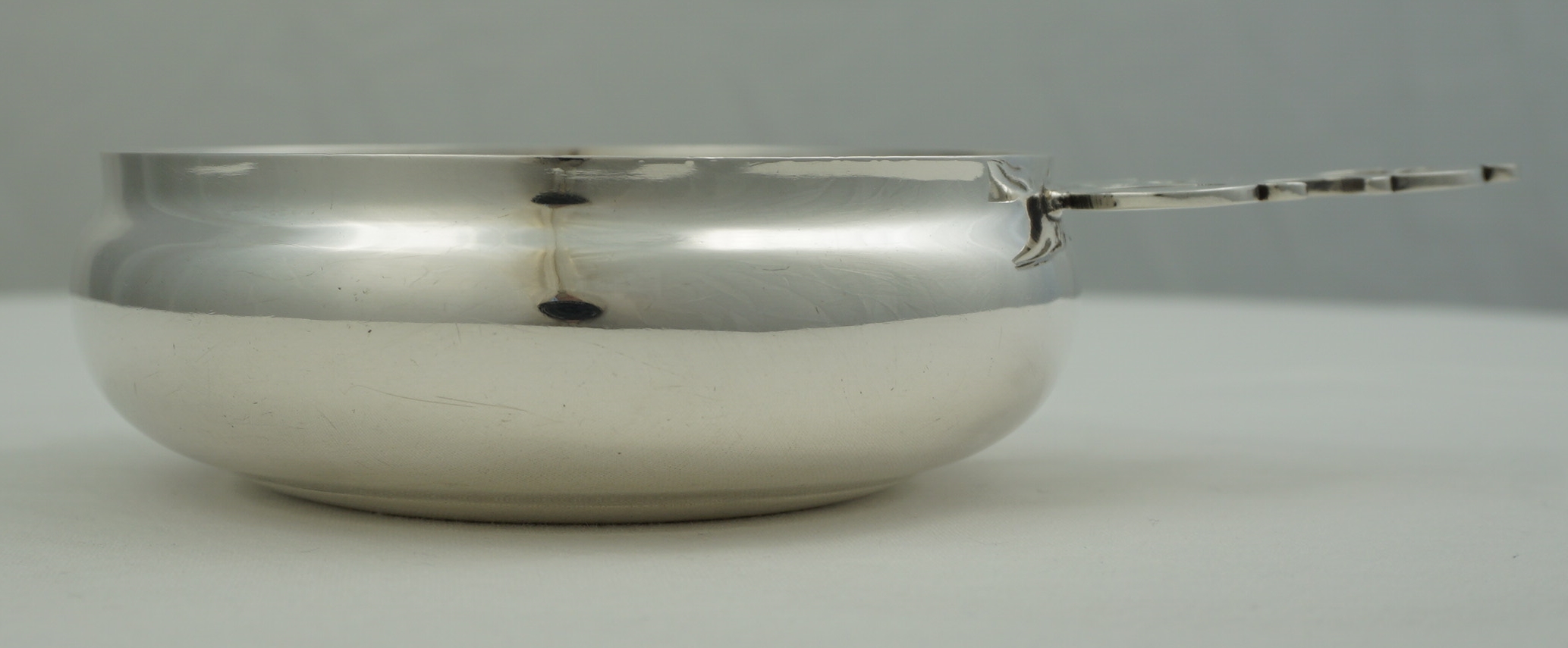 DESCRIPTION | Antique English Edwardian solid sterling silver reproduction of a 17th century porringer, the bowl inset with a silver 1689 William & Mary half crown coin. |