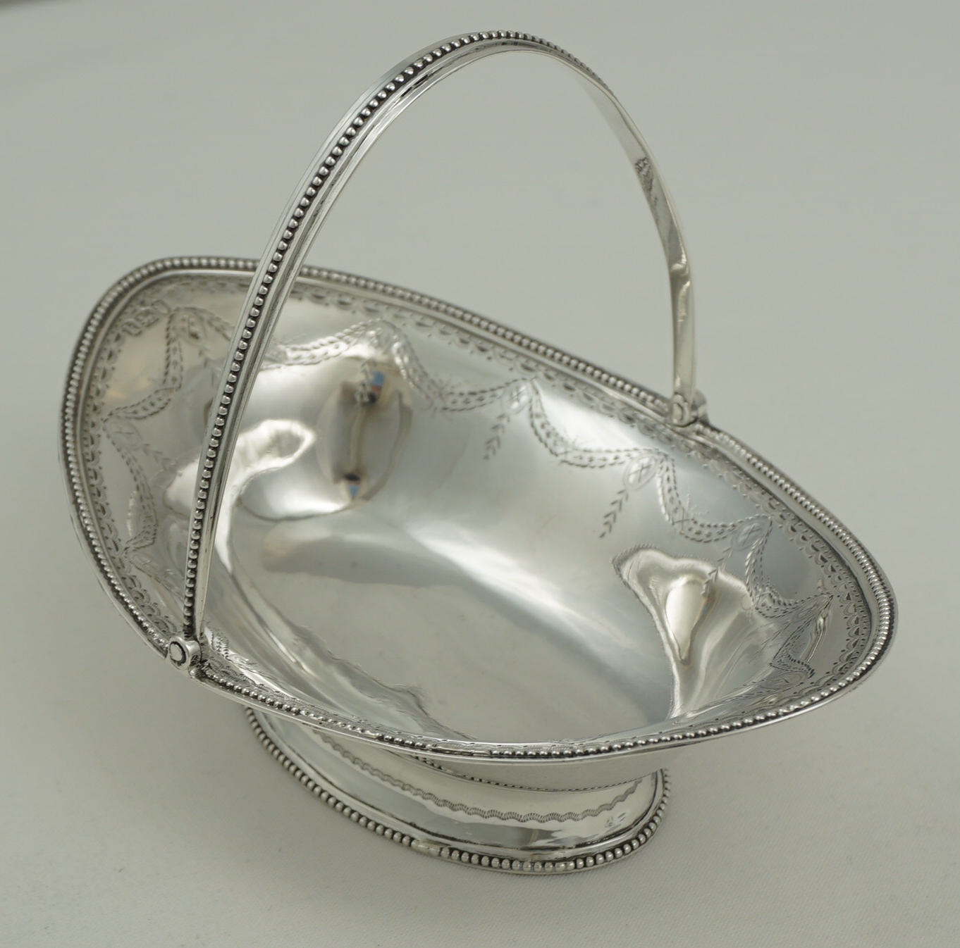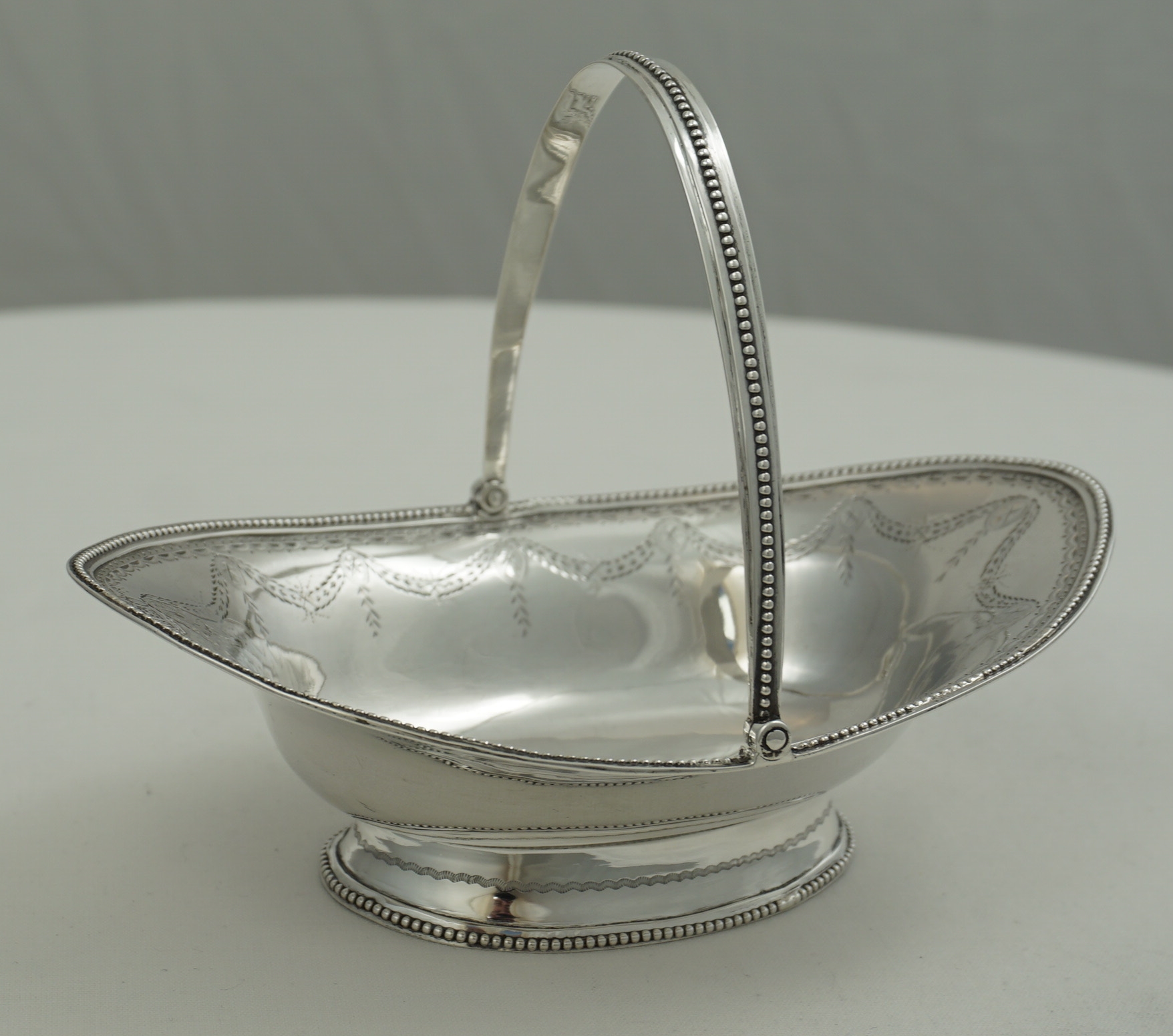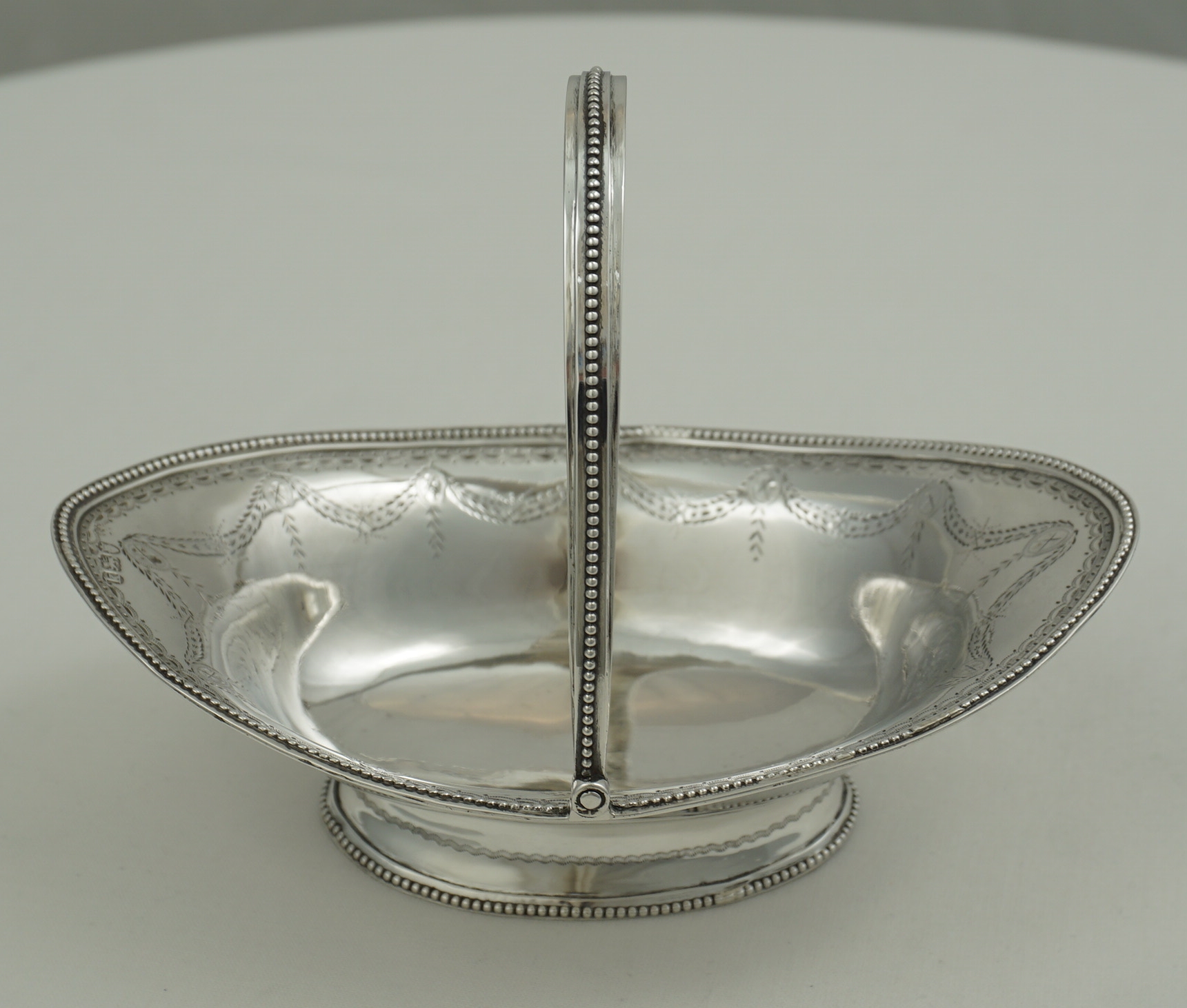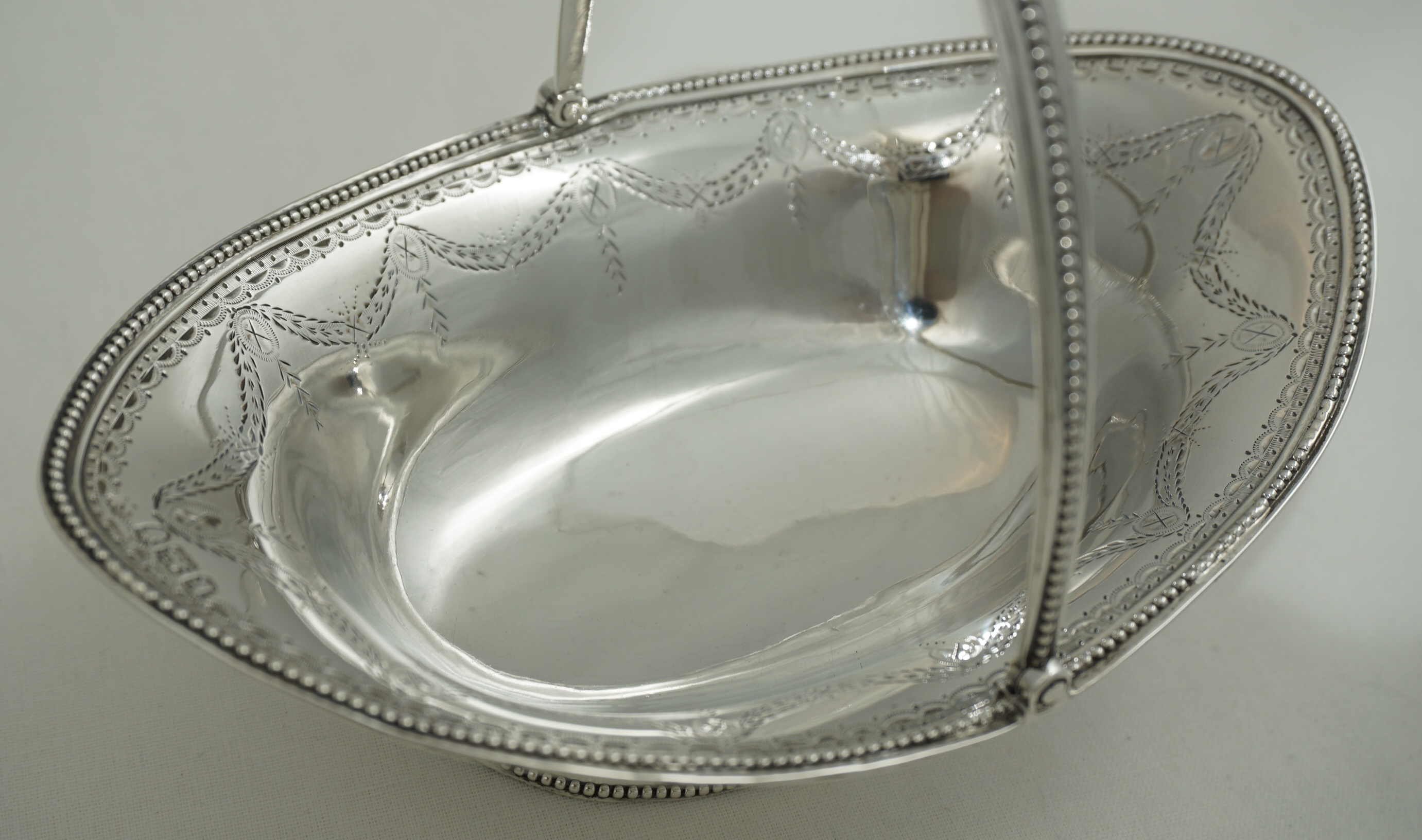 DESCRIPTION | Charming and scarce antique English Georgian solid sterling silver swing handled basket with bead edge and bright-cut engraved decoration. Possibly once part of an impressive