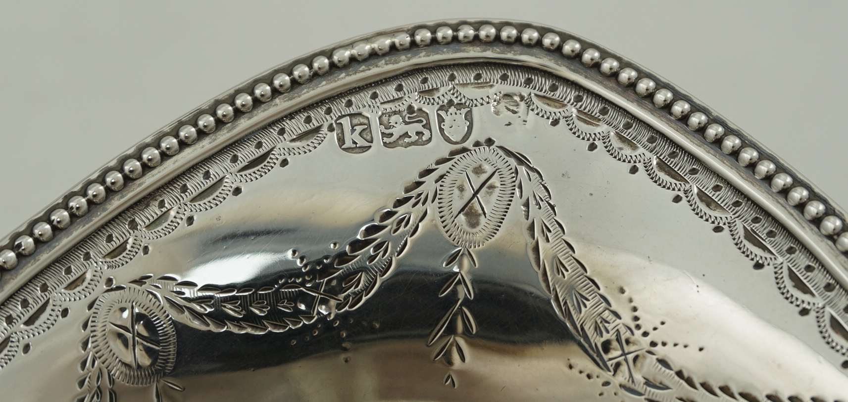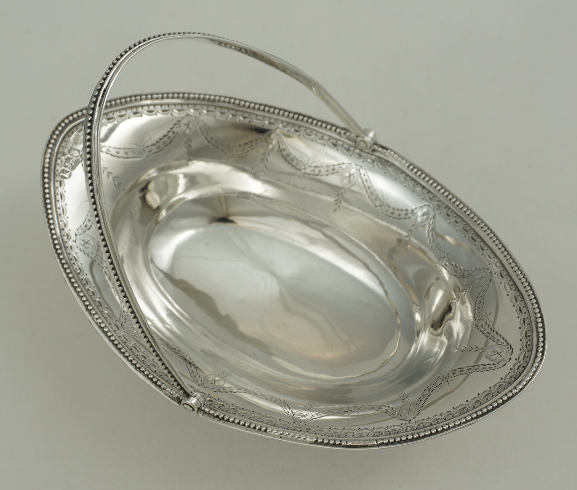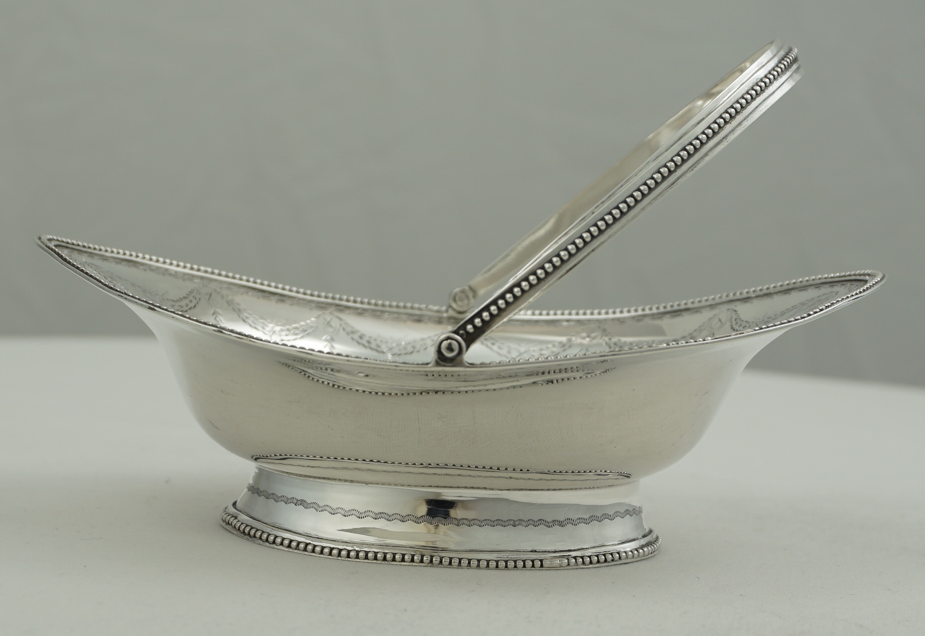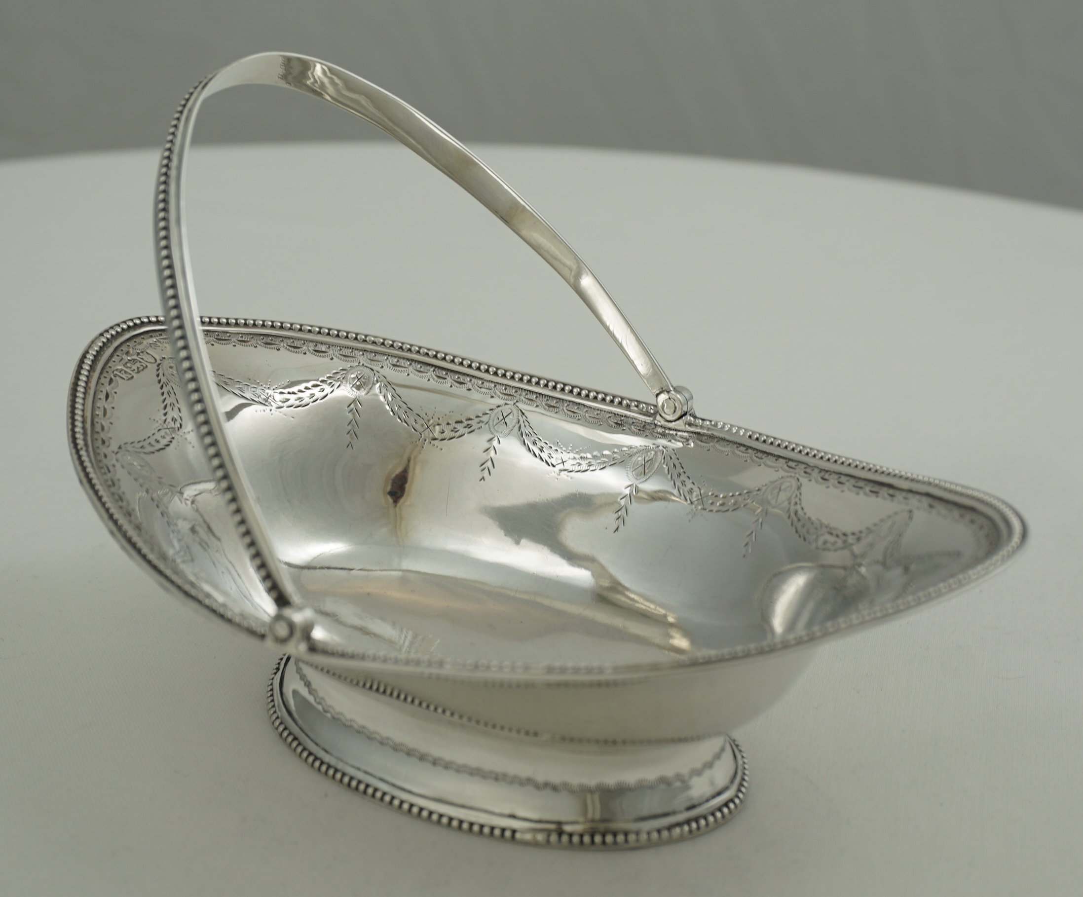 DESCRIPTION | Charming and scarce antique English Georgian solid sterling silver swing handled basket with bead edge and bright-cut engraved decoration. Possibly once part of an impressive