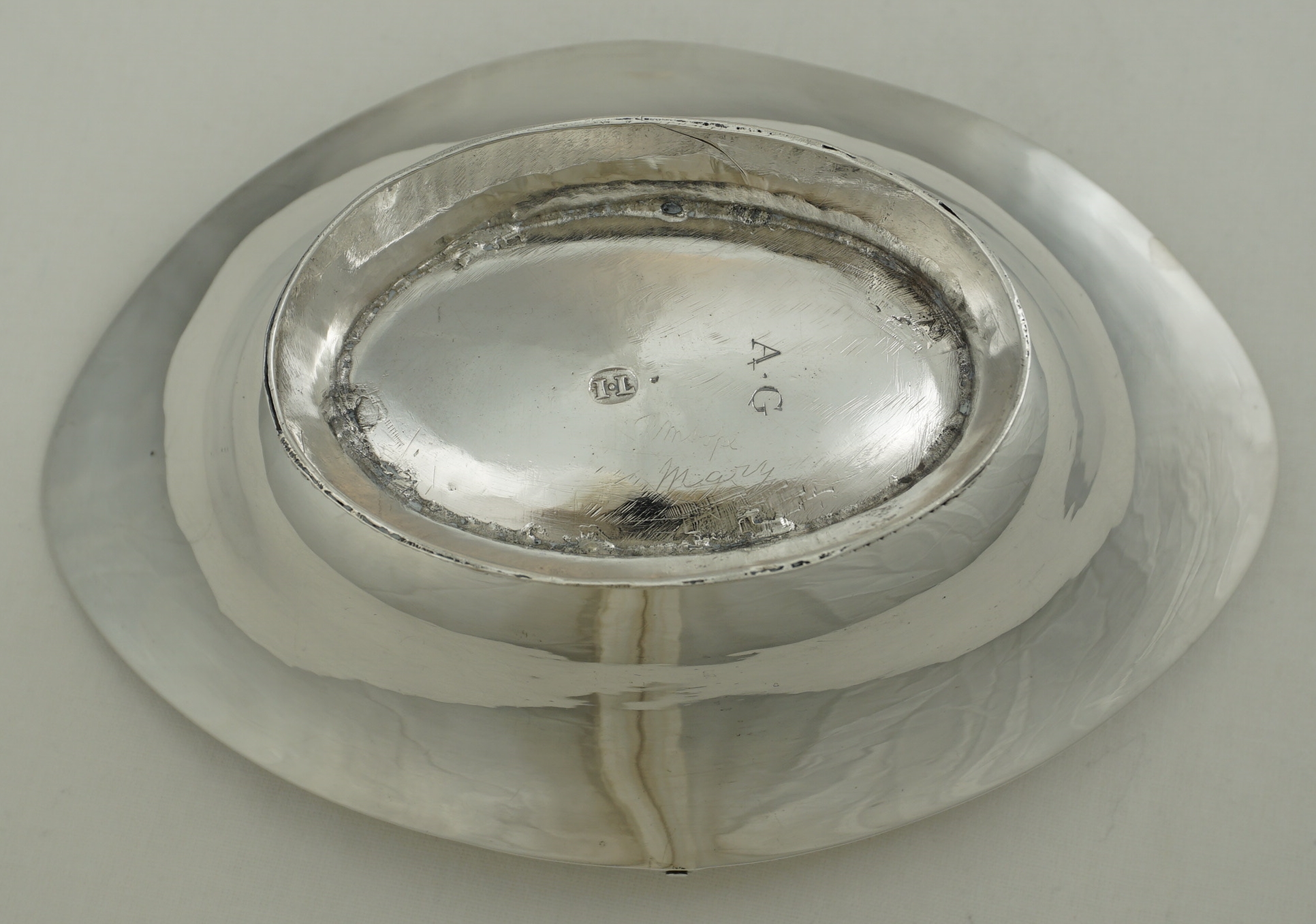 Although an important decorative feature, the primary purpose of these applied bead edges is to add strength. The handle would be weak and bendy without it's bead strip. Similarly the edges of the bowl section could become thin as the silver is worked up. It took great skill to work up enough metal in the correct thickness throughout and so was usually overdone and then cut and filed back. There is a small spot of solder beneath the top rim, about 4mm lengthways (image 9, right side edge, up a bit from the middle). Difficult to split the bowl without also splitting the bead strip and the bead strip is not split, so was the silver worked up too thin and split in manufacture? Probably not as the rim beneath the decoration actually looks a least as thick as the rest and with no indication of a split. I am thinking it is some solder spillage from when the bead strip was applied and for some reason not cleaned up. There a few patches of solder spillage to the upper side too, especially where two lengths of bead strip meet. By 1785 more of the manufacturing was becoming mechanised and these decorative strips were bought in from the man who had just invested in a machine to make the strips. Beneath the base is the maker's mark, the original initial engraving A·G and a small, faint scratch engraving R M Hope and beneath that a slightly bolder 'Mary' in the same hand. The full set of hallmarks is up next to the top rim with the incuse duty mark lightly struck. |