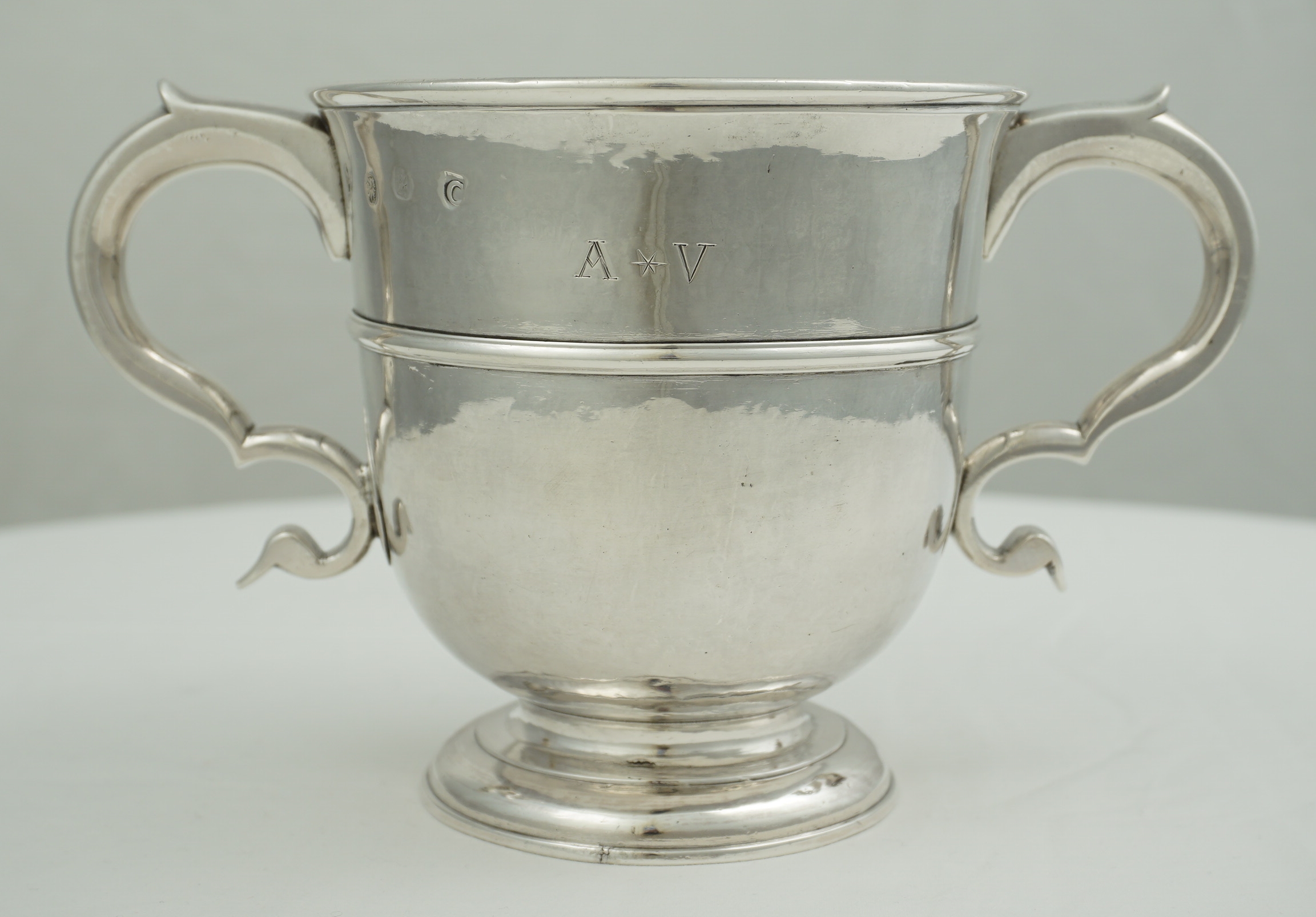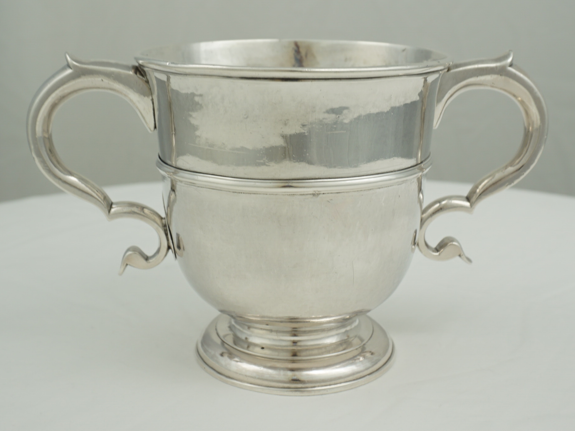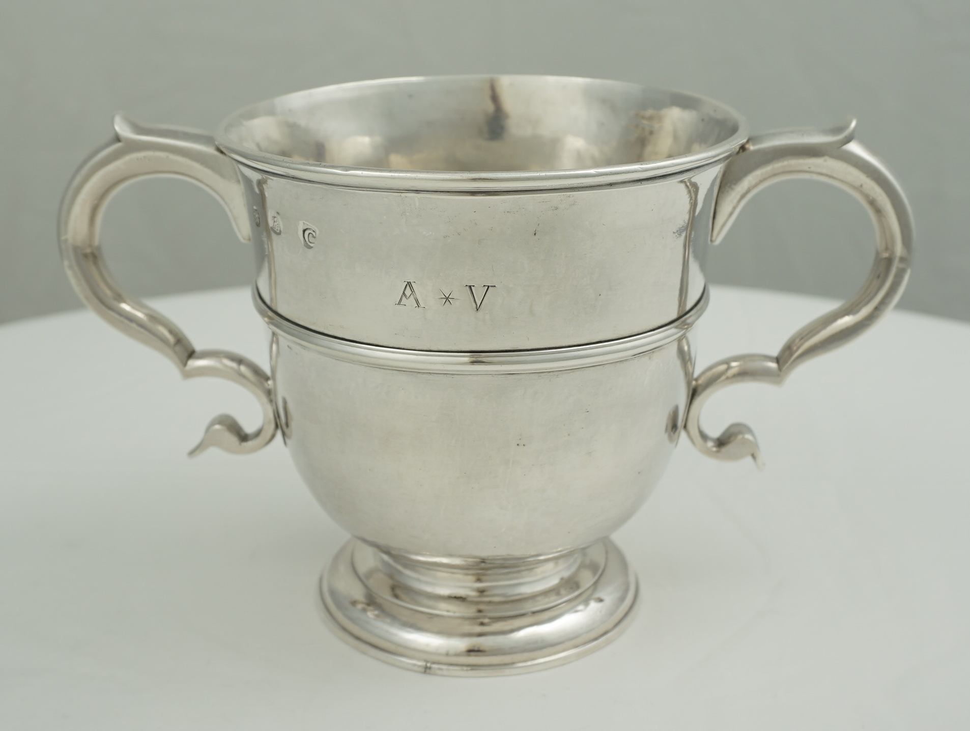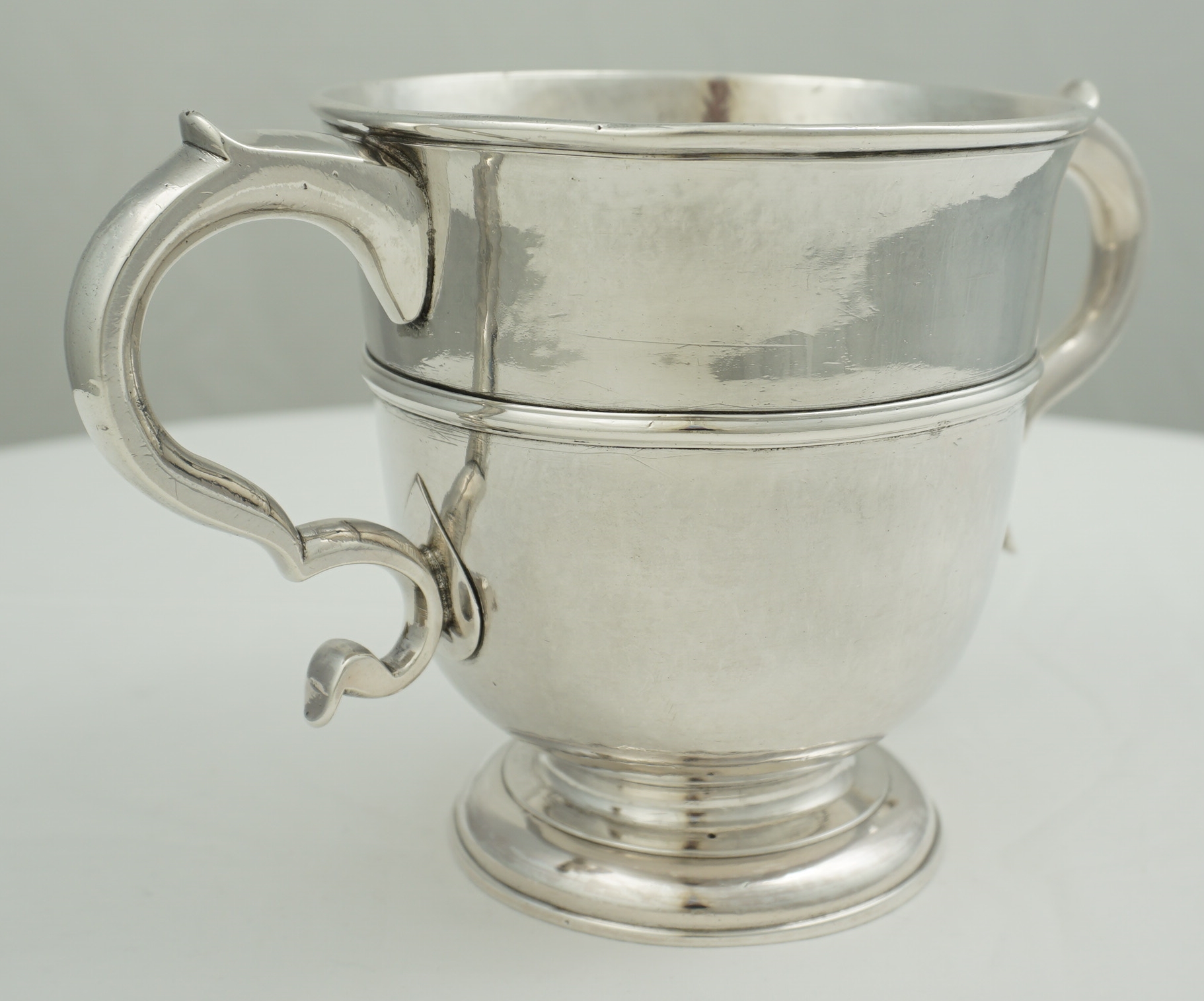 DESCRIPTION | Very good antique English George I solid Britannia standard silver two-handled cup. These items are also known today as