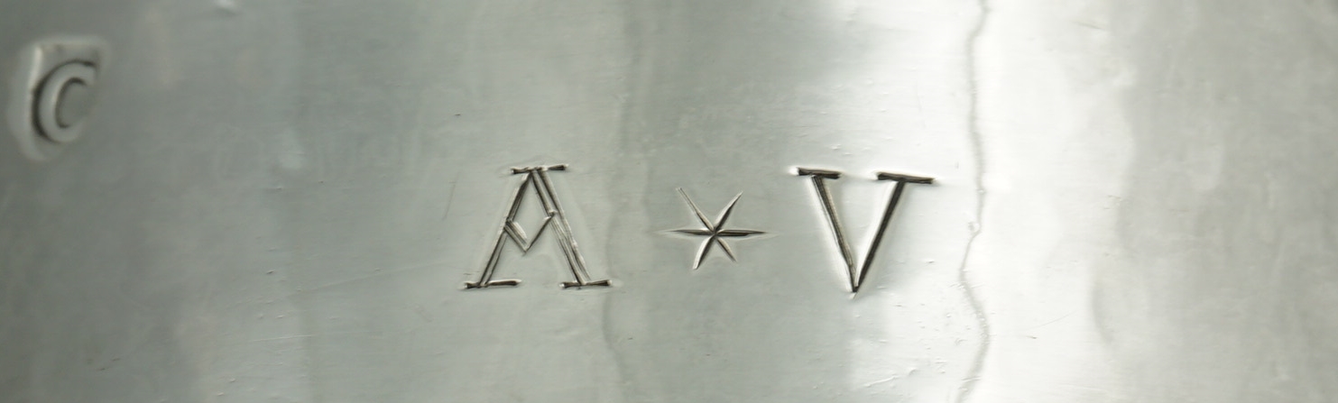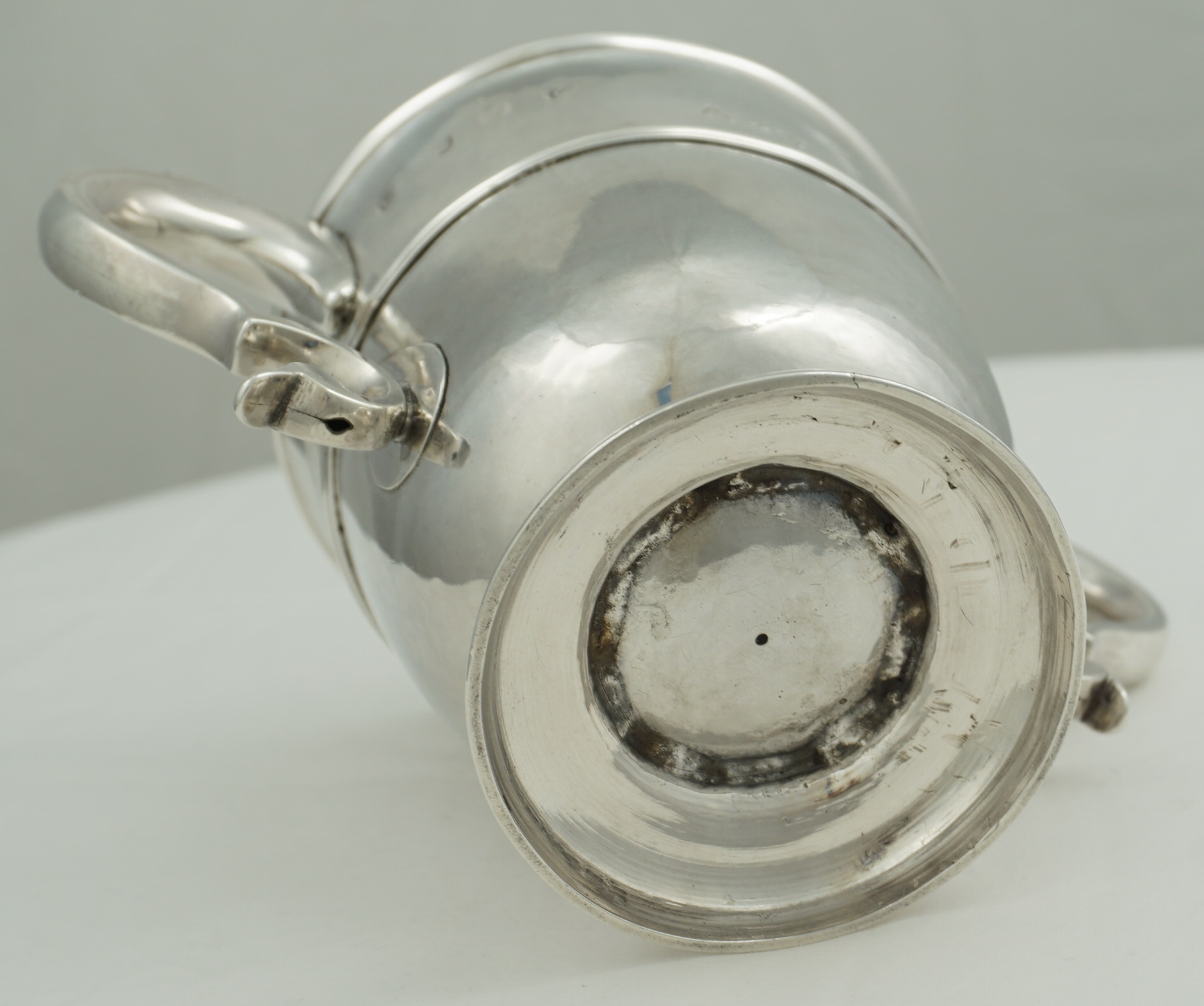 CONDITION | excellent, clean but not polished, looks just as old silver should. Both lower handle joints have pushed into the body in the distant past and the areas strengthened by the addition of the teardrop form plates. Small amount of grey solder at the bottom of each upper handle joint that does not go through and appears to be simply sitting on the external surface. This might be old lead and it would be worth considering removing this next time the handles are off but for now it causes no concern. |