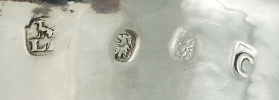 SILVERSMITH | Thomas Langford I, mark also noted on a "porringer, com. cup" of 1719. Mark is LA, the first two letters of the surname which is the correct form on Britannia