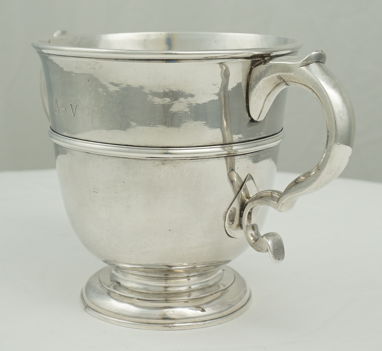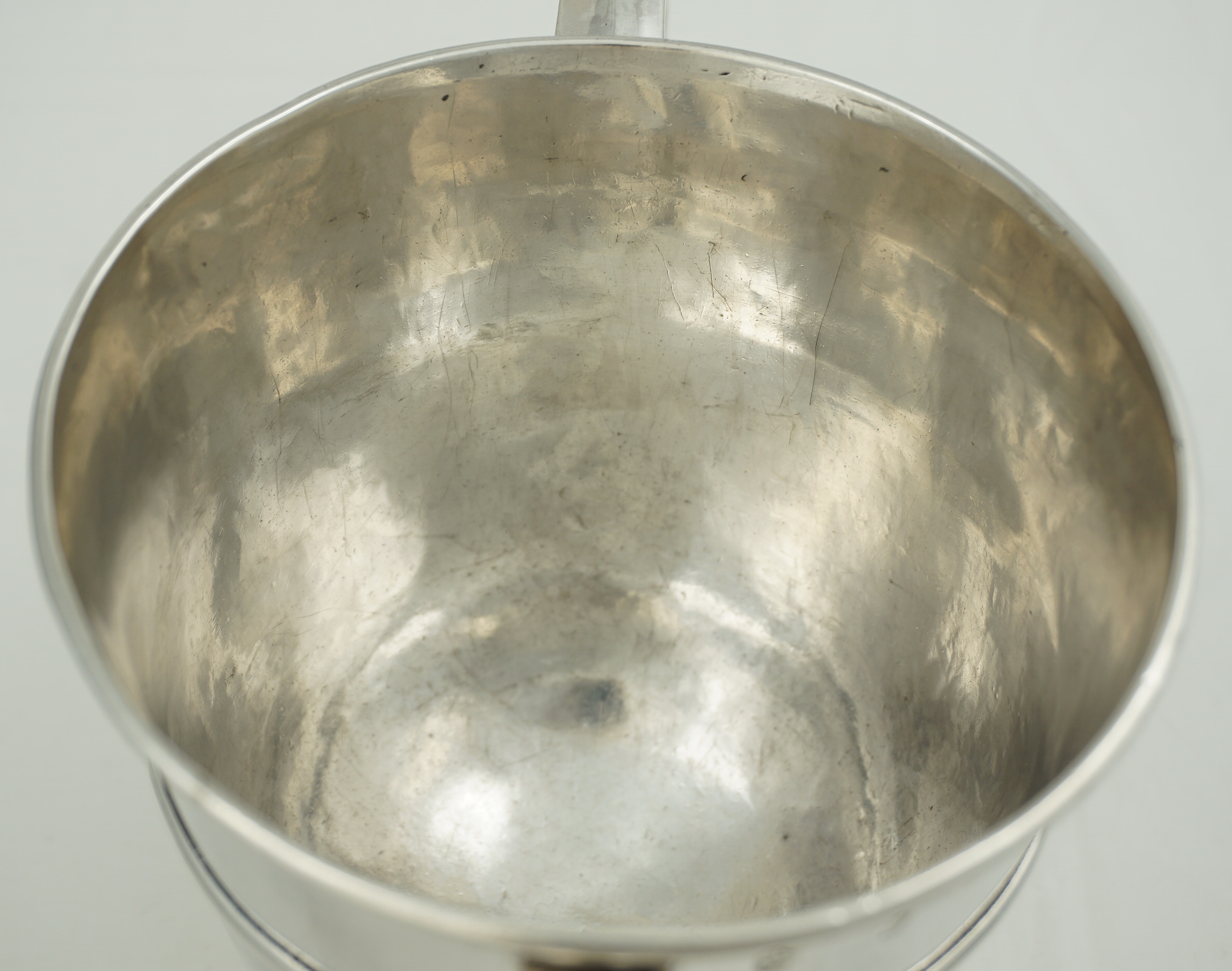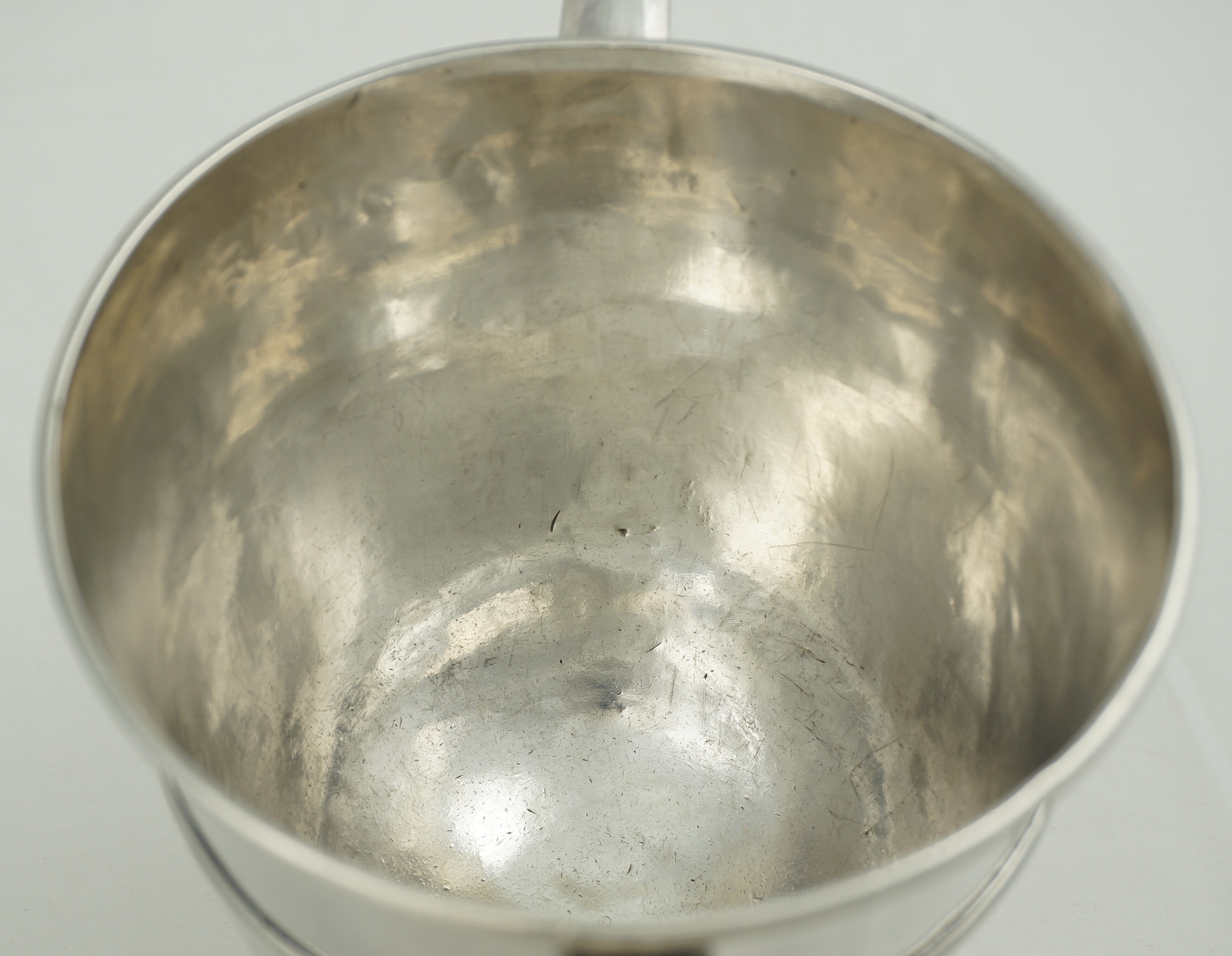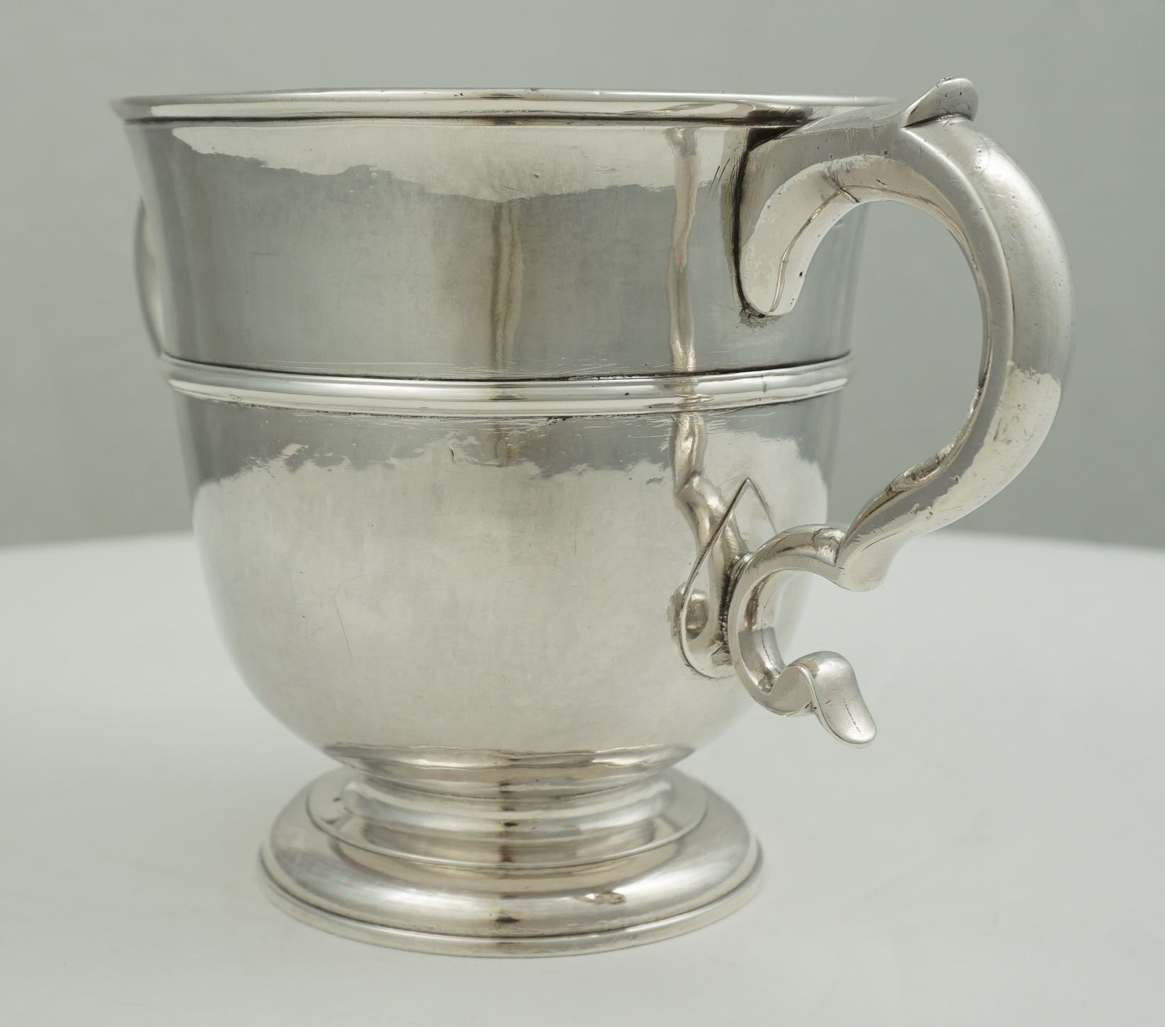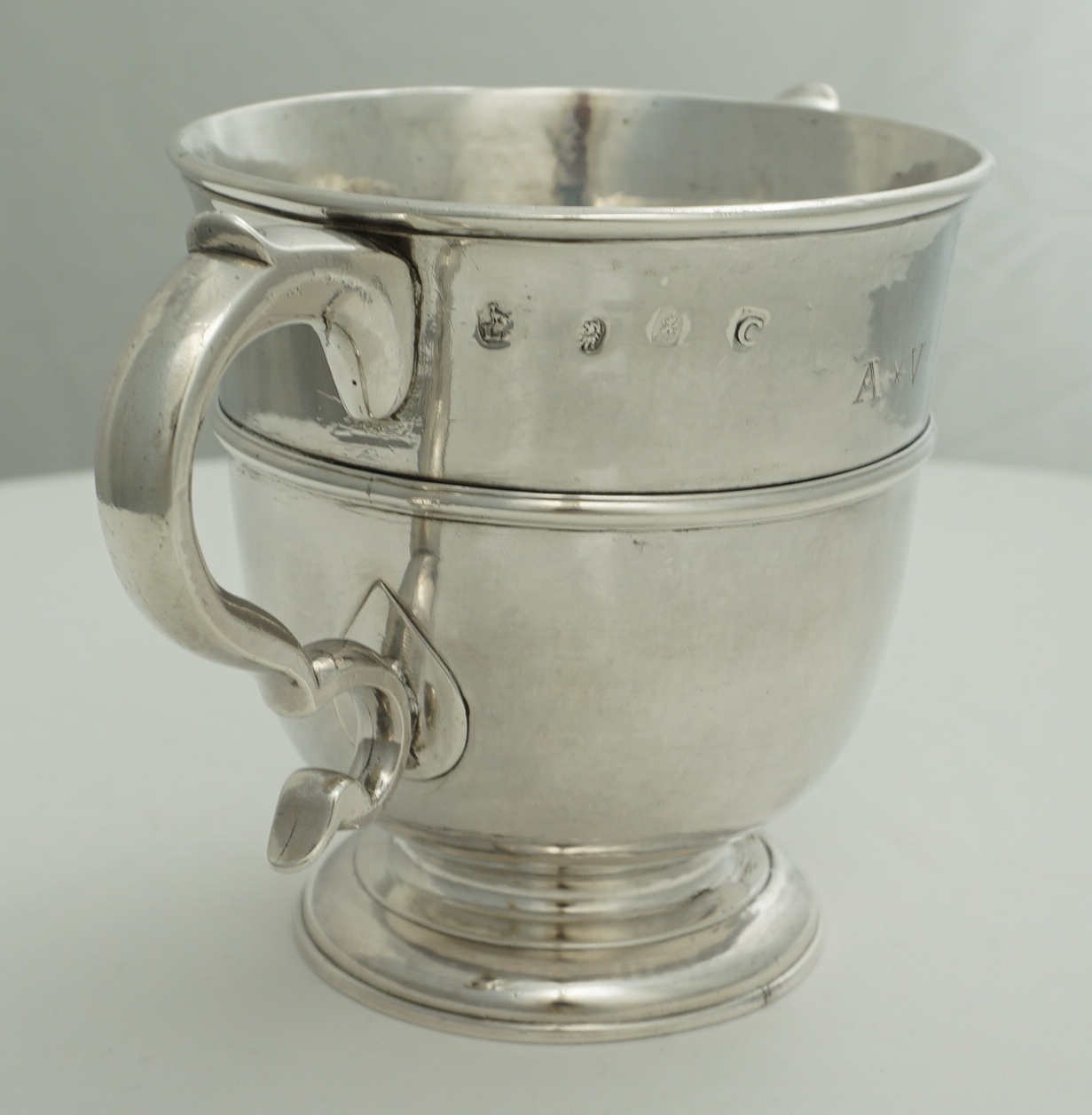 This pleases me. This large and very heavy example is in the restrained, rather plain form of domestic silver popular throughout the reign of Queen Anne that had ended only four years earlier. Simple ring turned foot and an almost straight sided body just flaring outwards towards the top with simple thread decorated applied central girdle. The stylised flying leaf capped scrolling handles are interesting for both retaining their lower duck's bill terminals that are so often broken off and lost and for being cast, the vertical solder seam most visible beneath the lowest scrolls around the vent holes. Without these holes the gasses trapped internally would expand and explode the handles when heat was applied to solder them to the body. Very simple initial engraving A*V to the upper front panel and no evidence of any other engraving or erasure. The hallmarks are exceptionally good and clear for silver of this period. Most likely would have been matched with one of the new 'salvers' of the period, a low, flat circular plate raised on a broad ring foot, the idea was for the salver to catch the drips of beer or whatever and save your fine carpets. If you have considered for even the briefest moment that this piece would make a lovely presentation trophy suitable for a modern engraving then you must leave now and hang your head in shame for the rest of the week. |