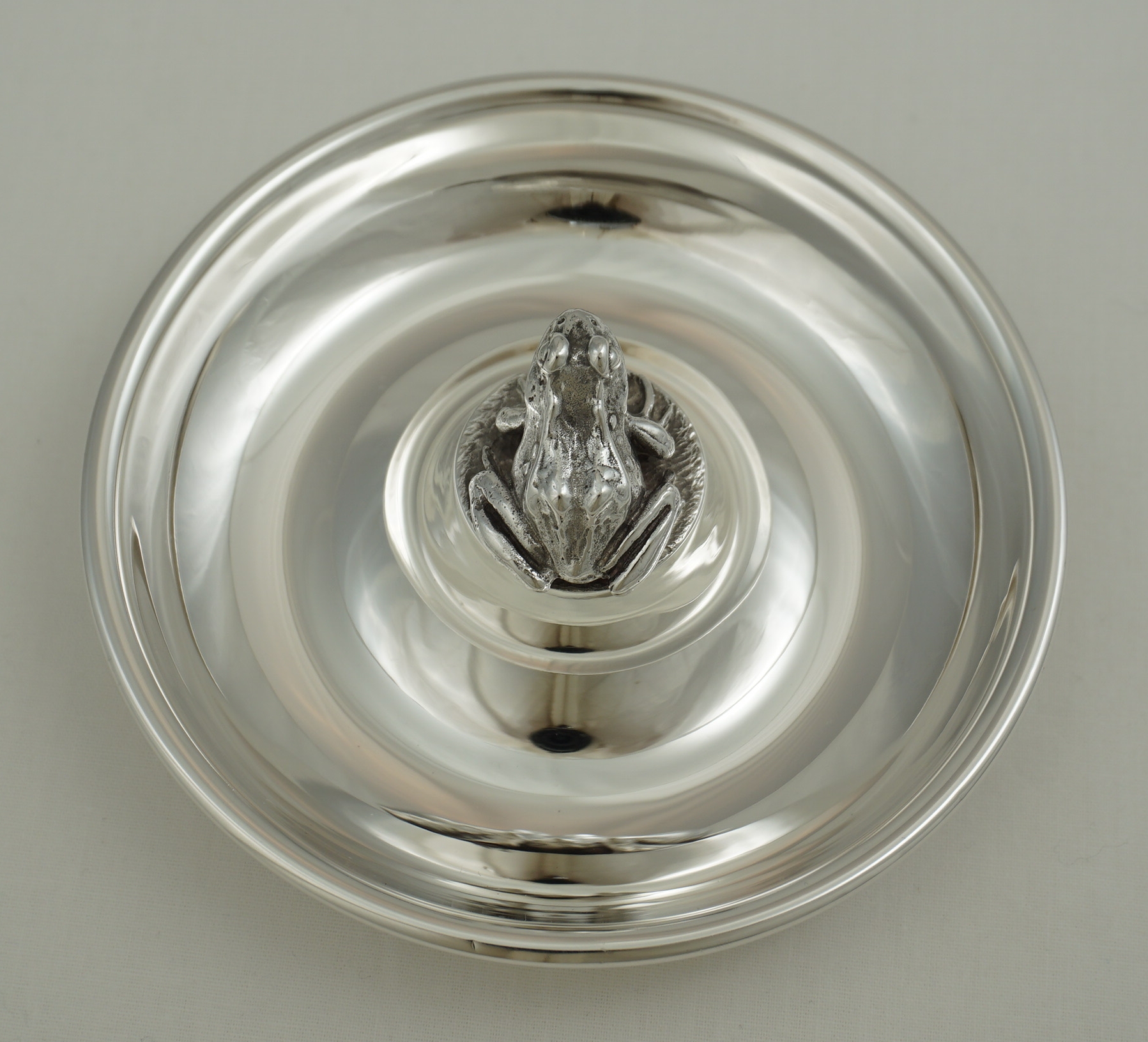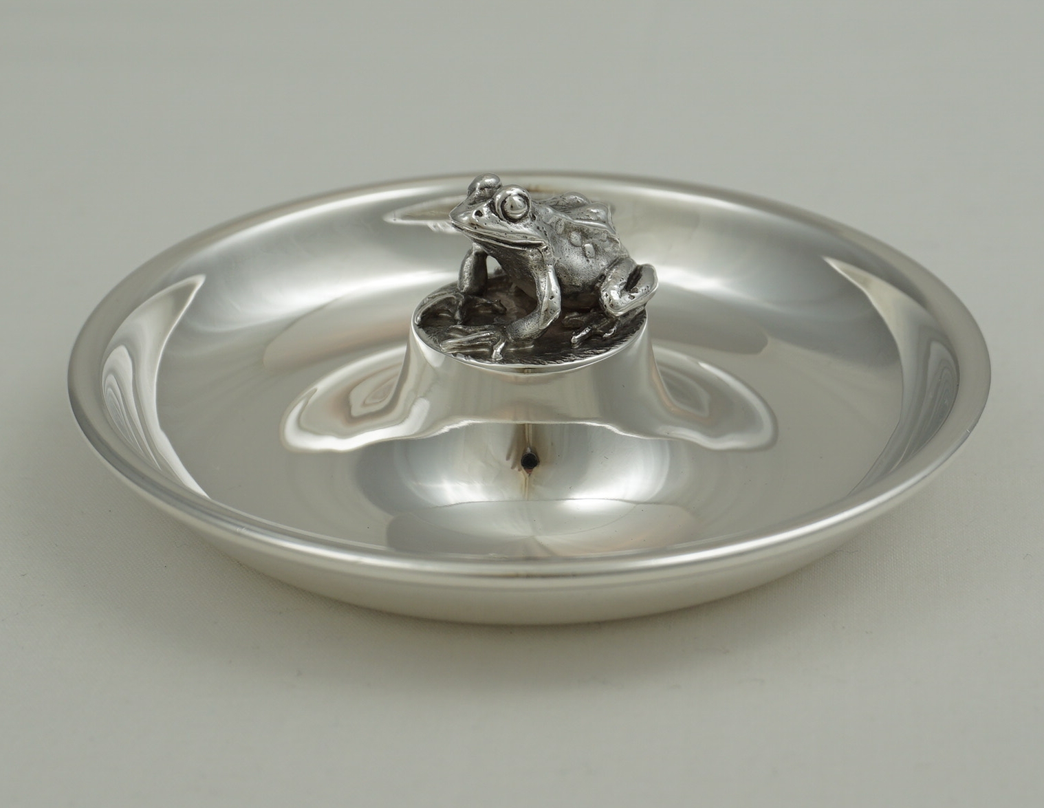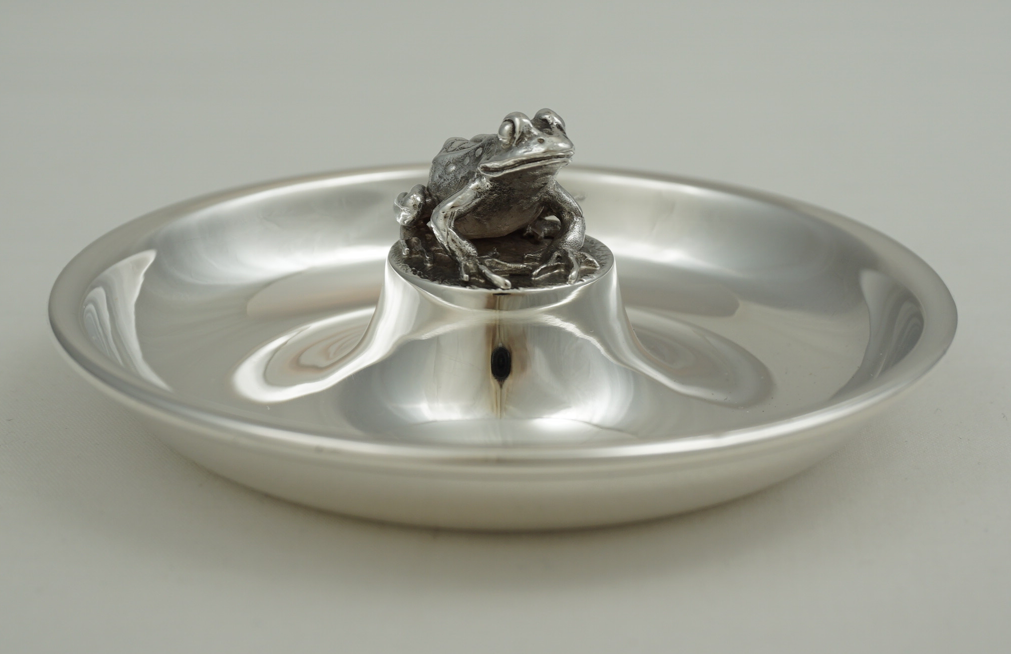 DESCRIPTION | Charming little modern English solid sterling silver dish centrally mounted with a pleasingly cast solid silver frog. |