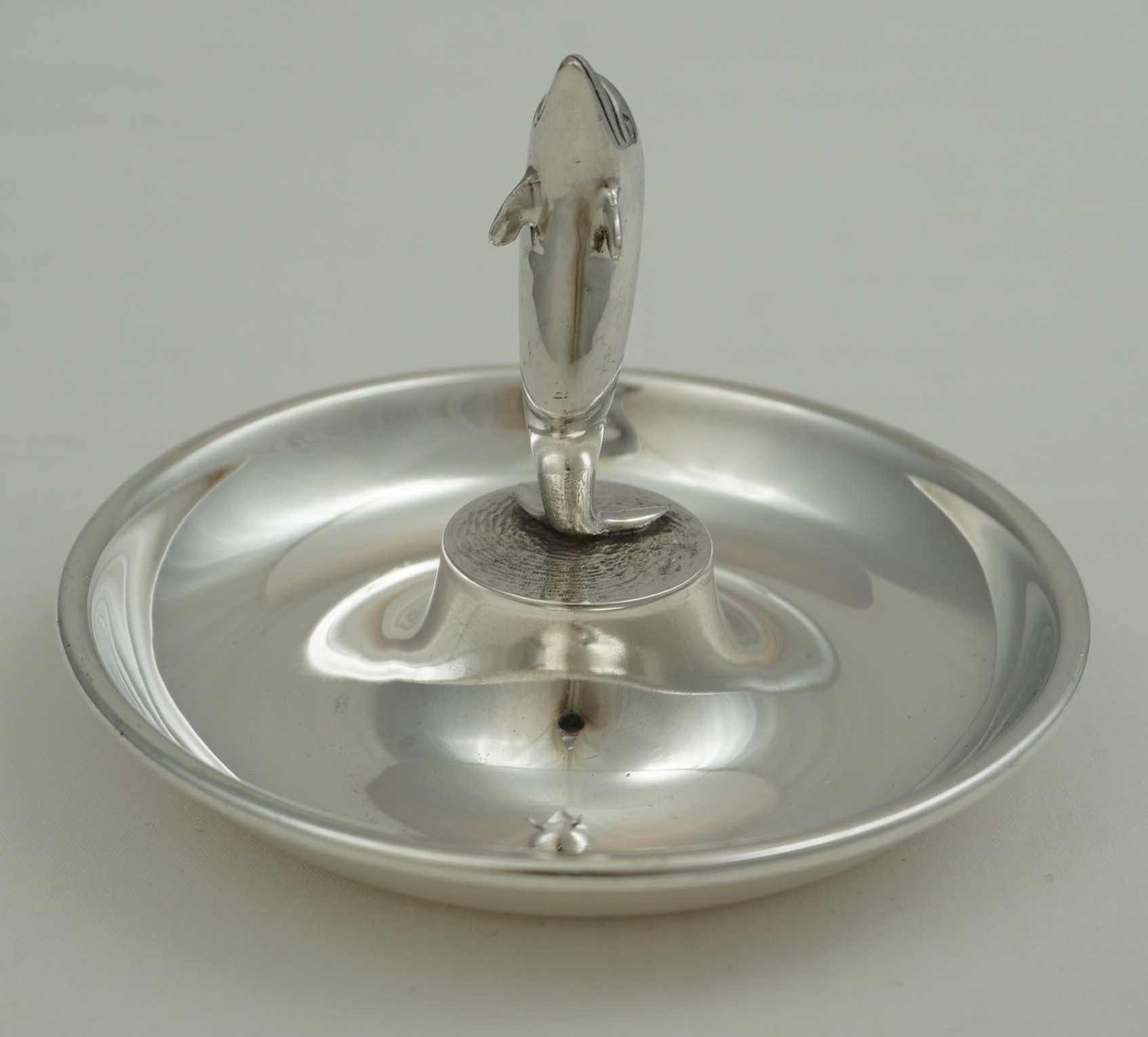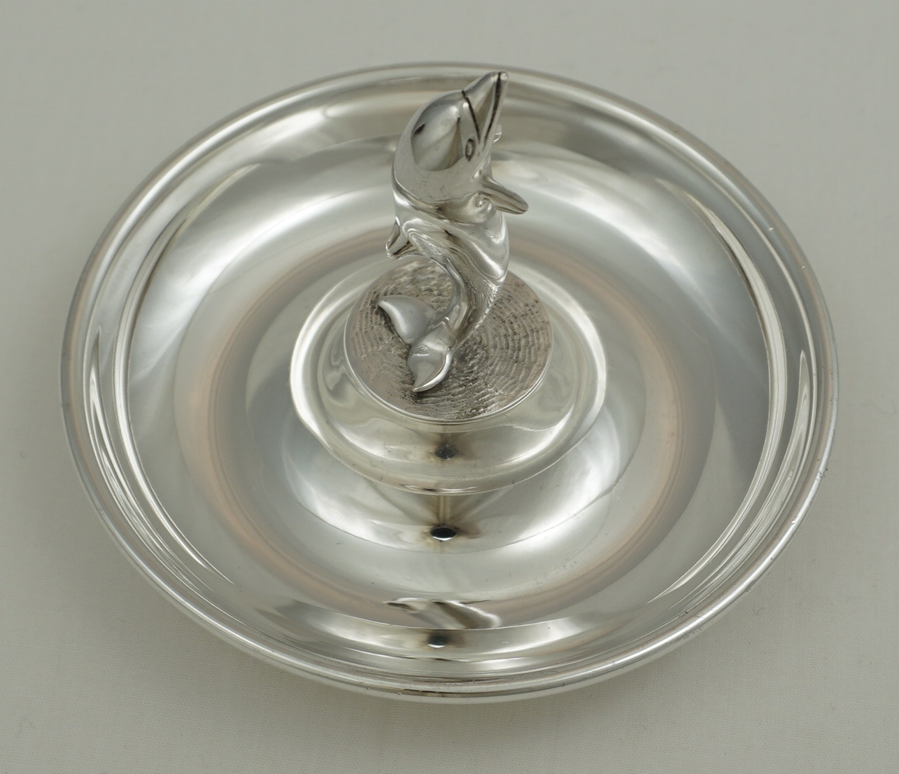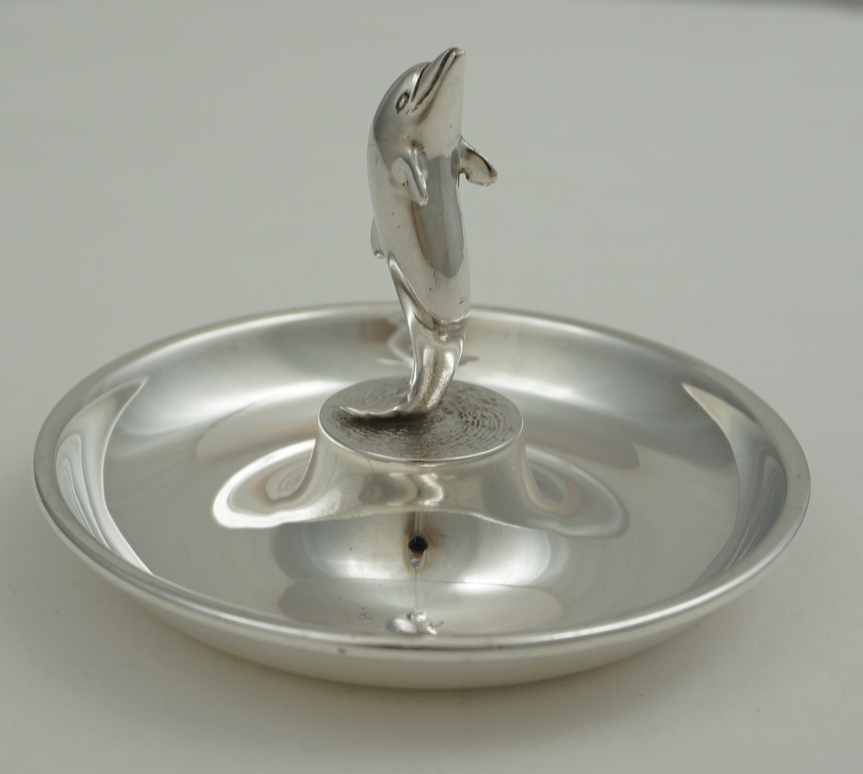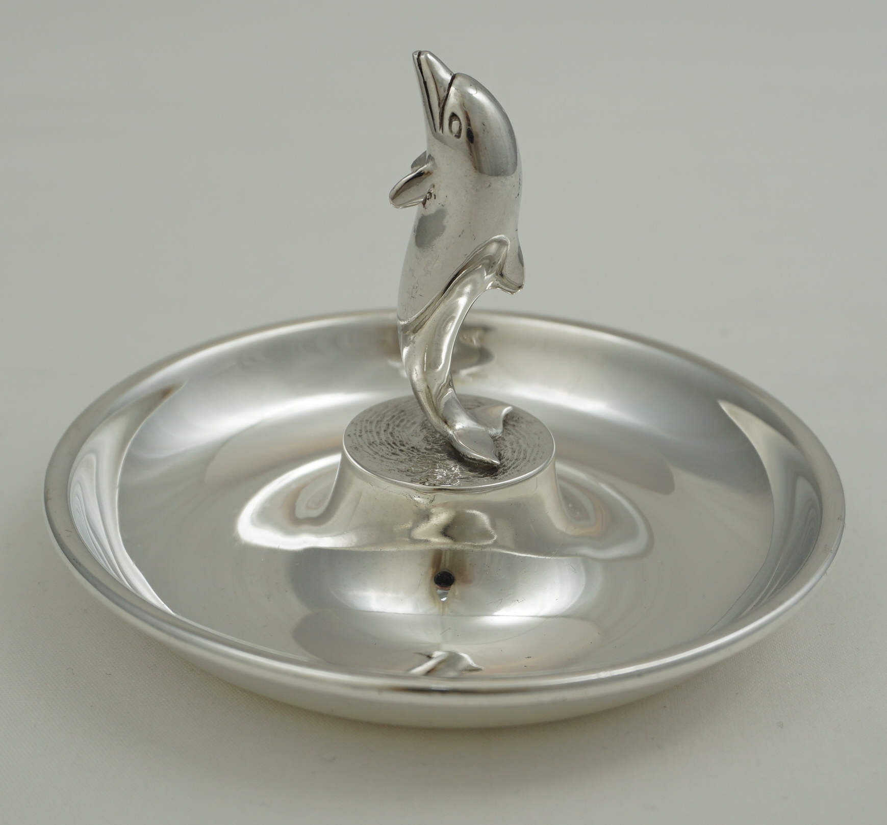 DESCRIPTION | Charming little modern English solid sterling silver dish centrally mounted with a pleasingly cast solid silver dolphin. |