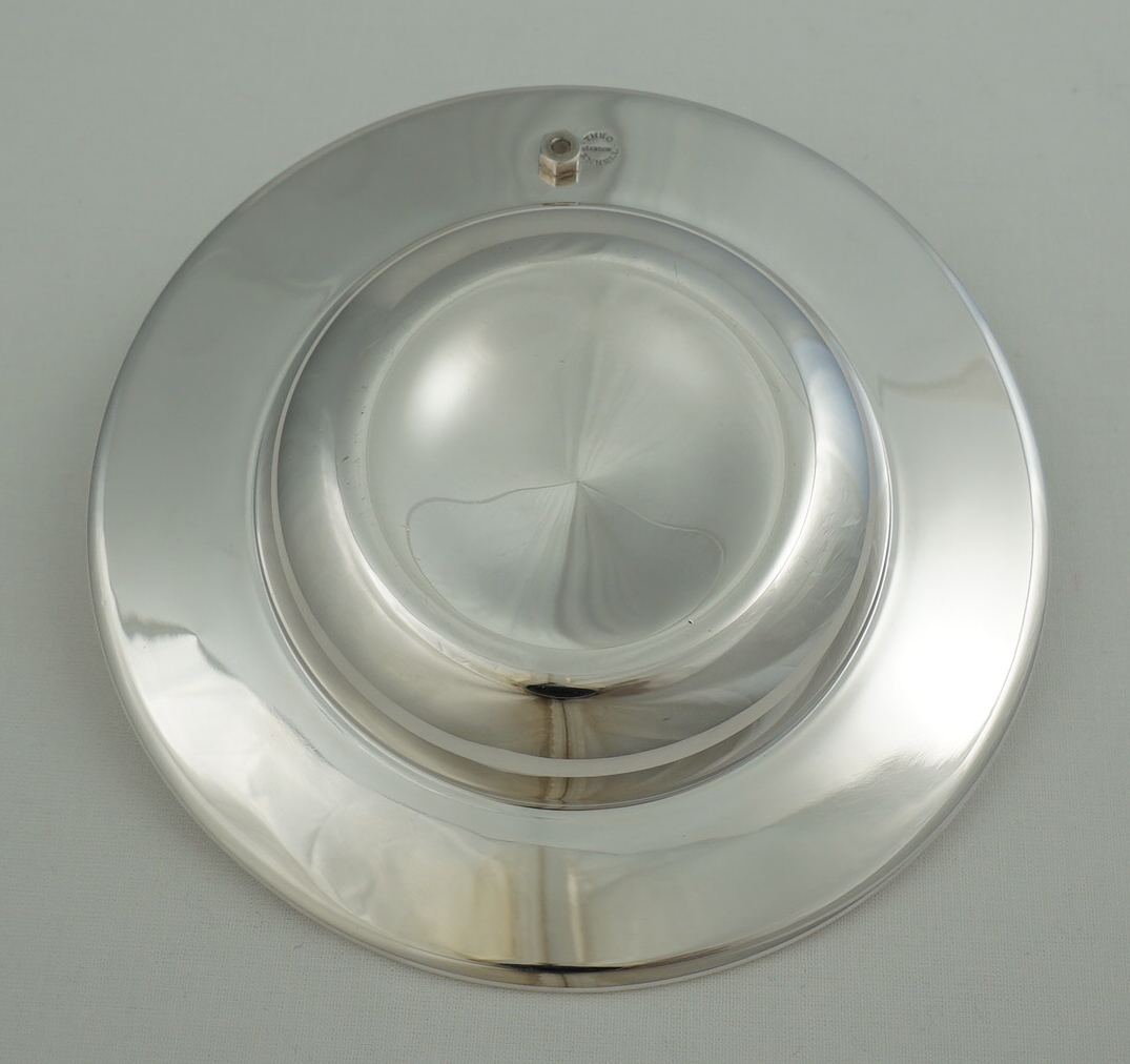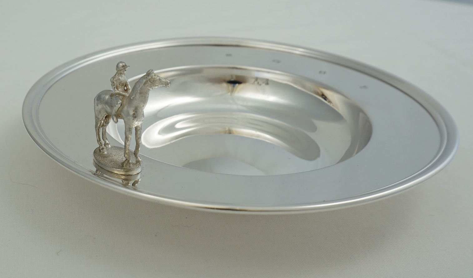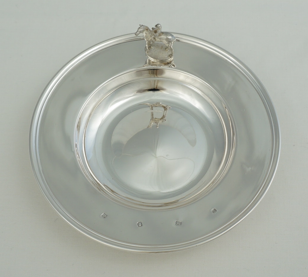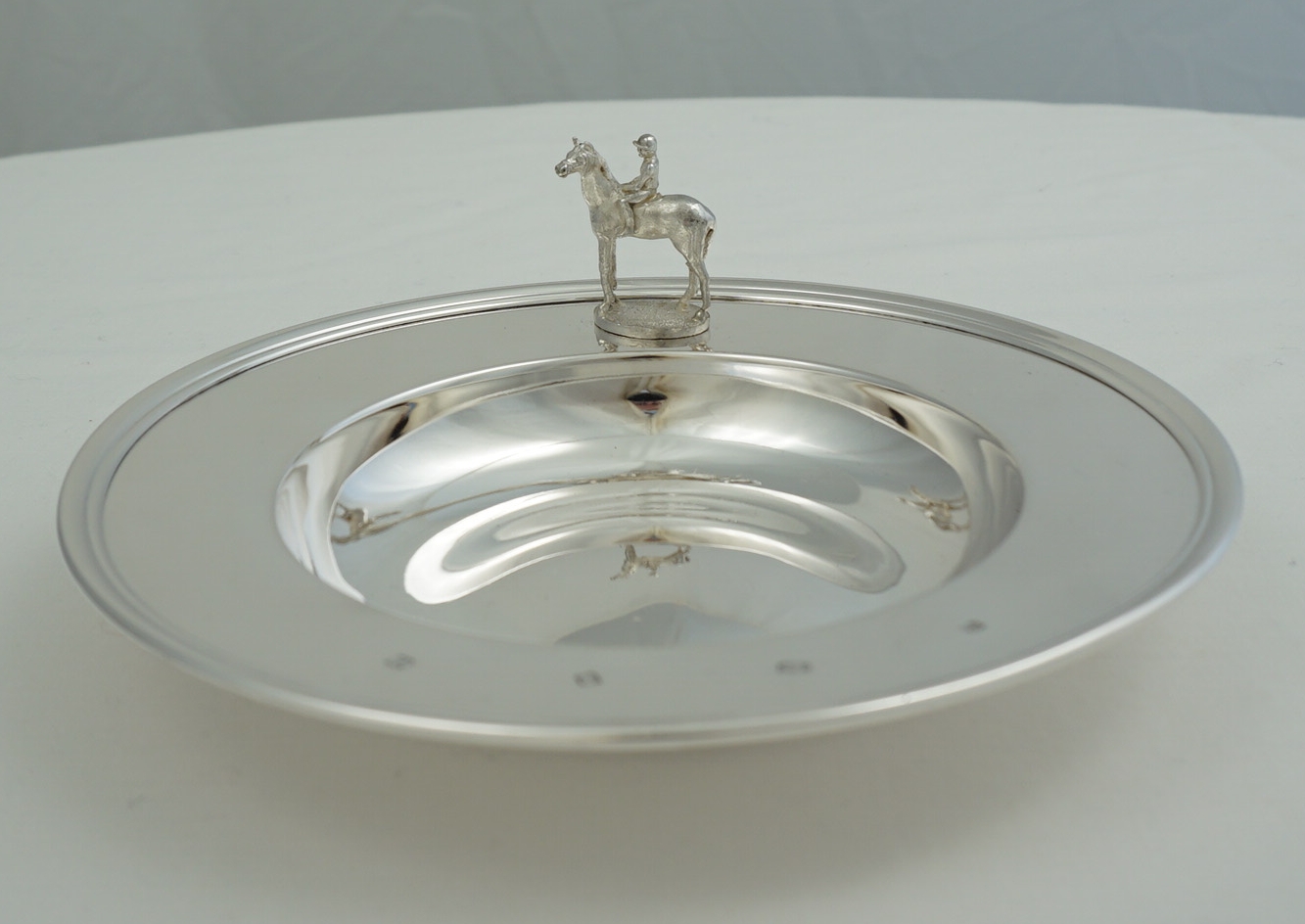 DESCRIPTION | Very good modern English solid sterling silver Unraised Alms Dish featuring a cast solid silver horse and rider. Would have been fabulously expensive when first sold and sadly no longer available from the maker. |