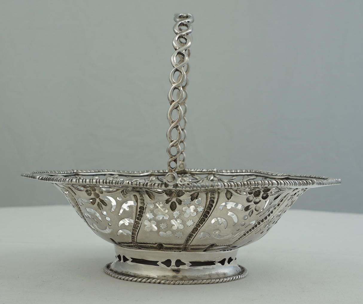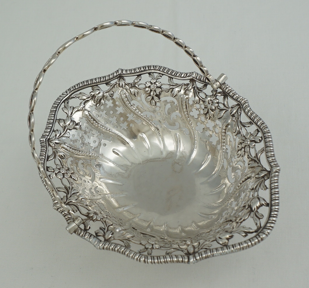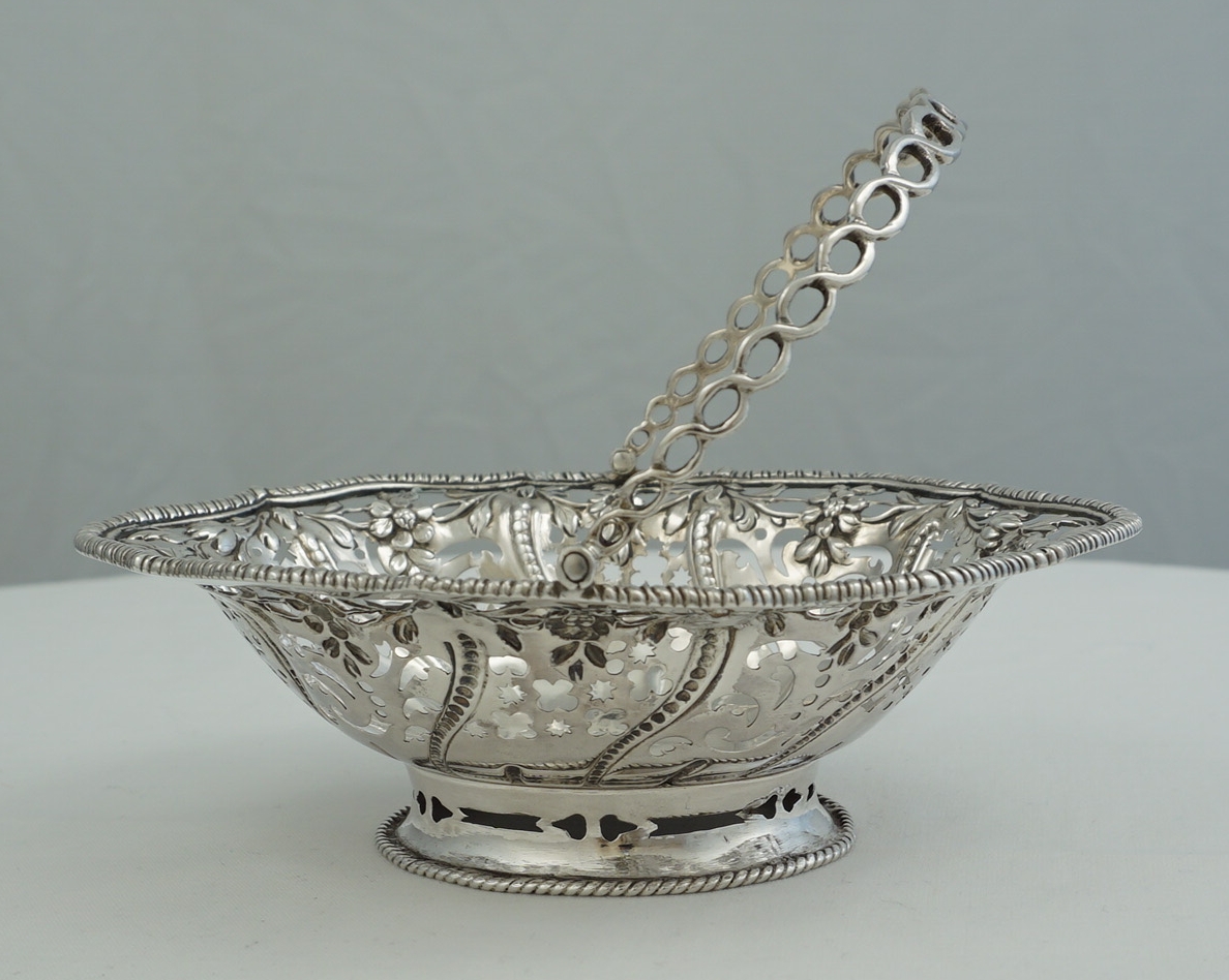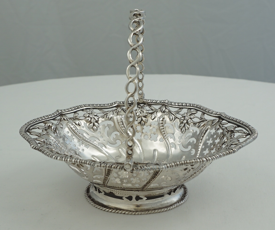 DESCRIPTION | Superb, high quality antique English Georgian pierced solid sterling silver swing handled basket. Possibly once part of an impressive Georgian table centrepiece epergne but works equally well as a fully formed standalone basket. Although styled as the very much larger fruit and bread baskets of the period, this piece was intended for sweetmeats. |
