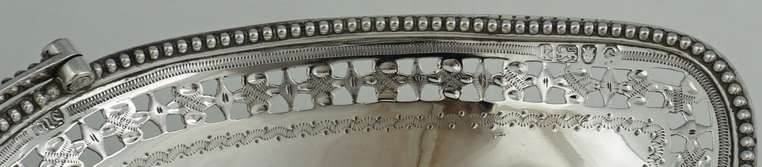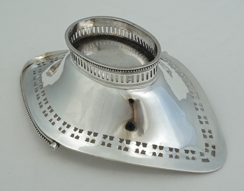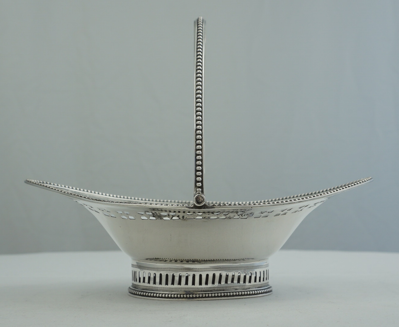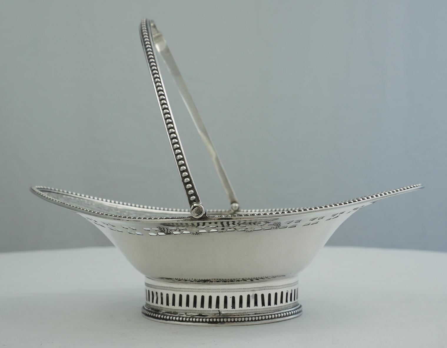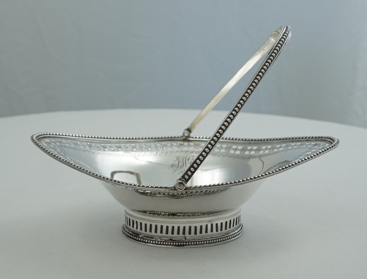 DESCRIPTION | Superb, high quality antique English Georgian pierced solid sterling silver marquise form swing handled basket with a monogram engraving. Possibly once part of an impressive Georgian table centrepiece epergne but works equally well as a fully formed standalone basket. Although styled as the very much larger fruit and bread baskets of the period, this piece was intended for sweetmeats. |