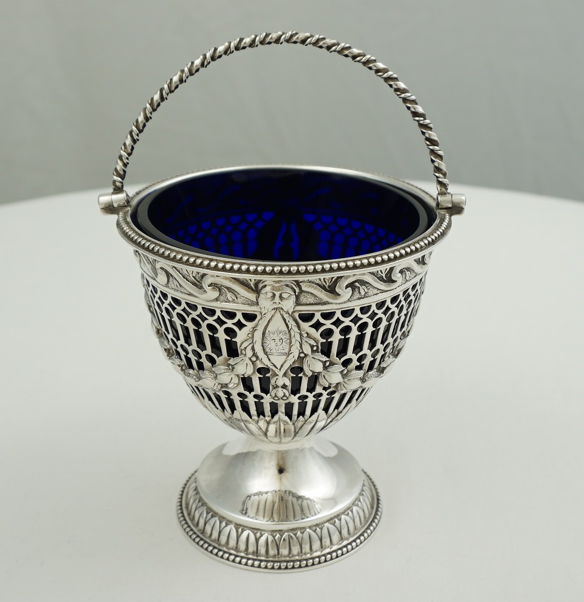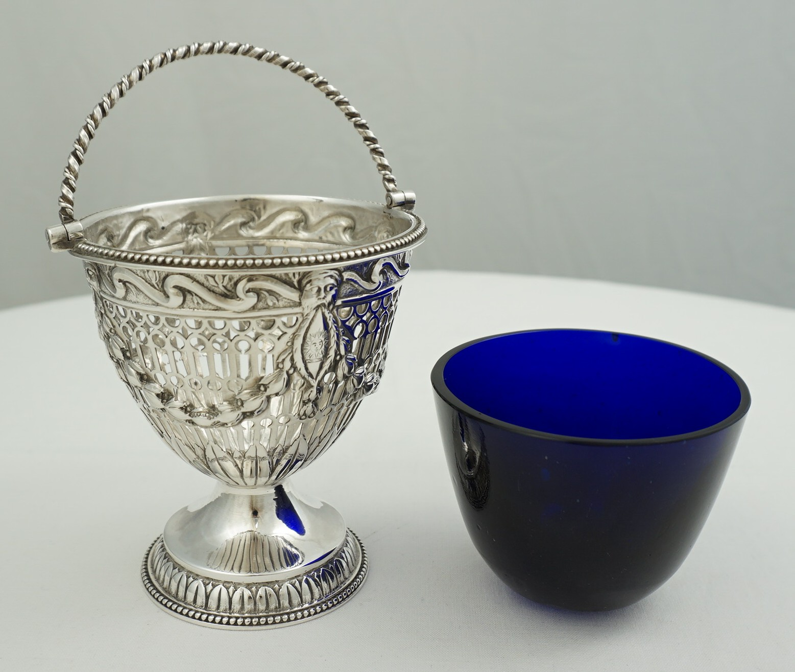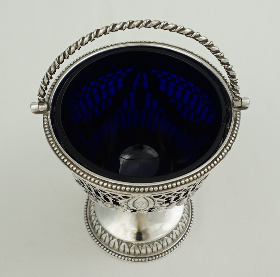 DESCRIPTION | Superb antique English Georgian sterling silver rope twist swing handled pierced pedestal sugar basket with a smiling sun crest and blue glass liner. The liner is a modern bespoke hand-made replacement. |