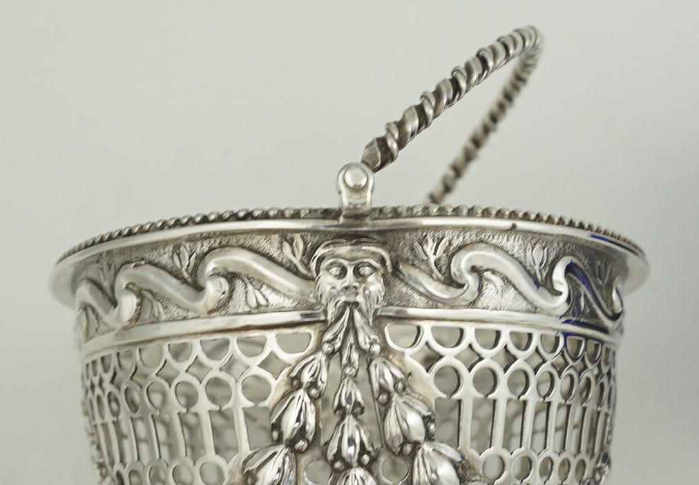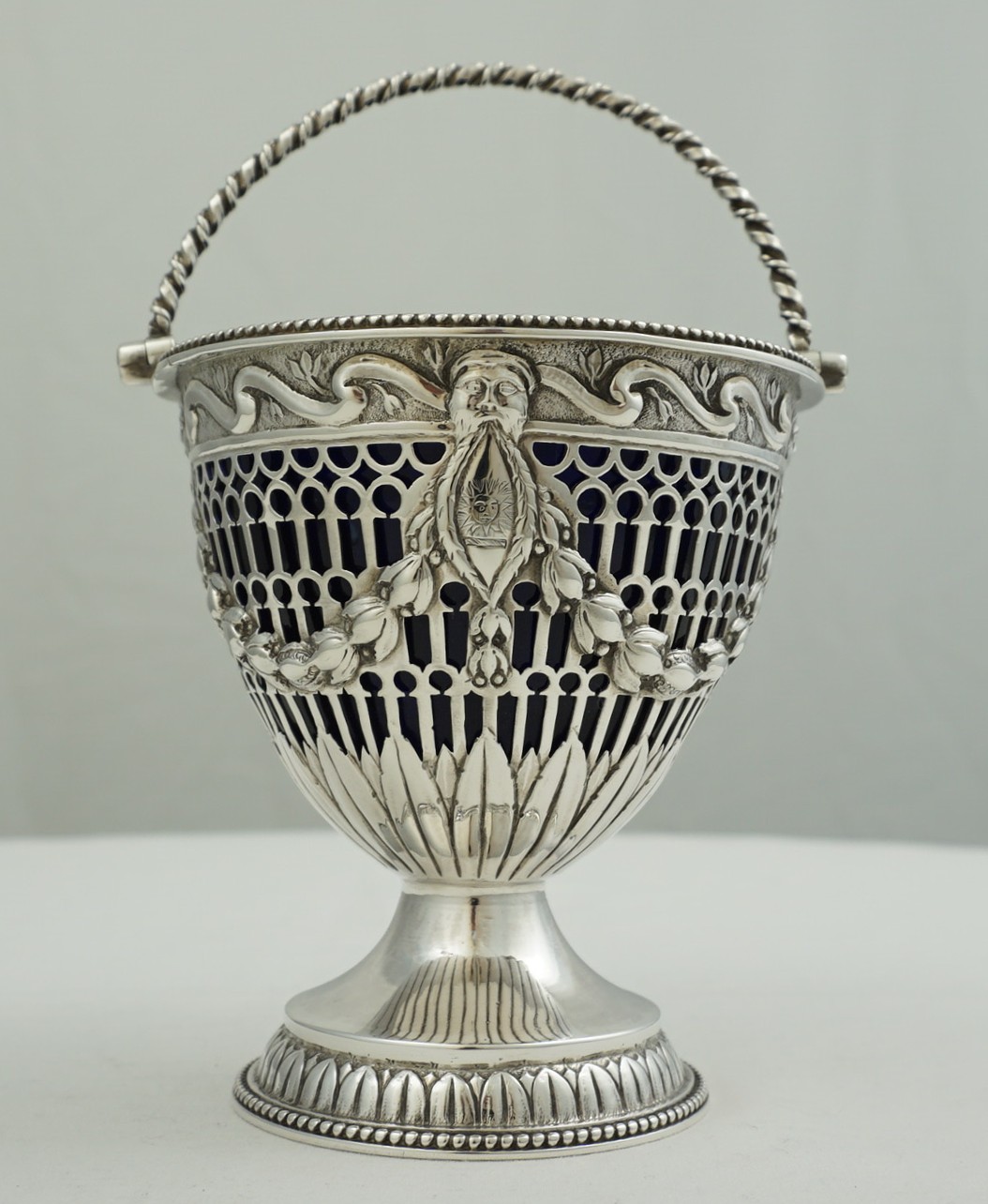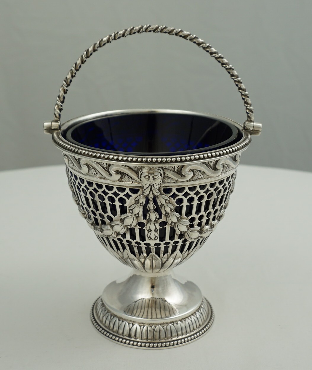 DESCRIPTION | Superb antique English Georgian sterling silver rope twist swing handled pierced pedestal sugar basket with a smiling sun crest and blue glass liner. The liner is a modern bespoke hand-made replacement. |