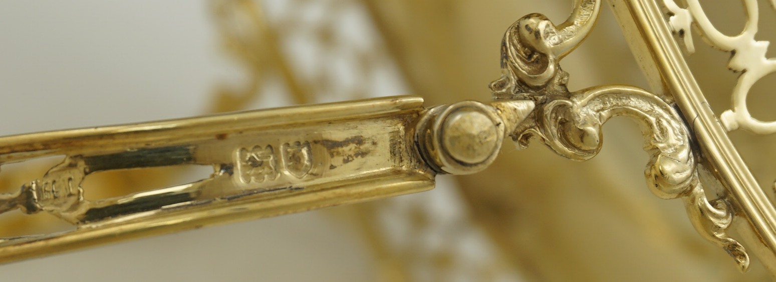 | DESCRIPTION | Magnificent, highest quality, antique English fully gilded and pierced solid sterling silver swing handled basket on four paw feet. |