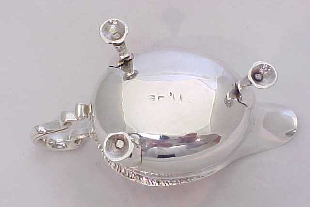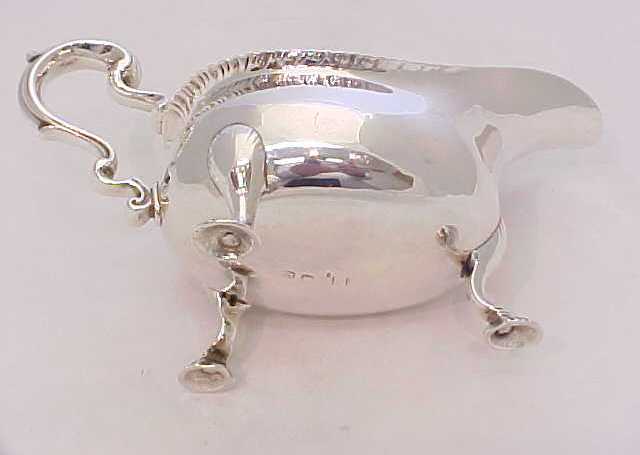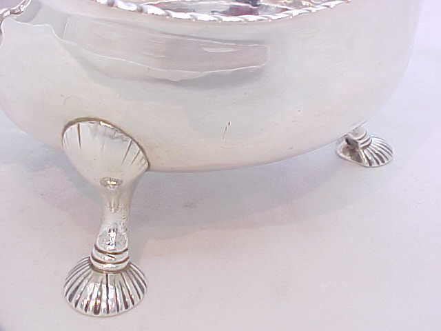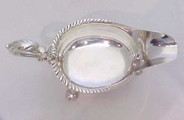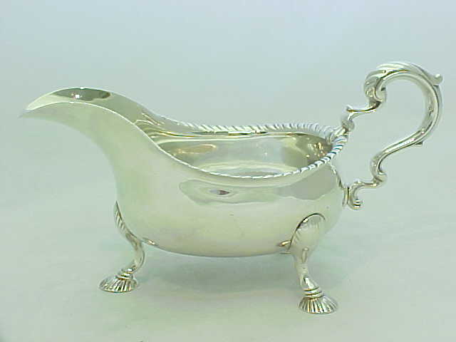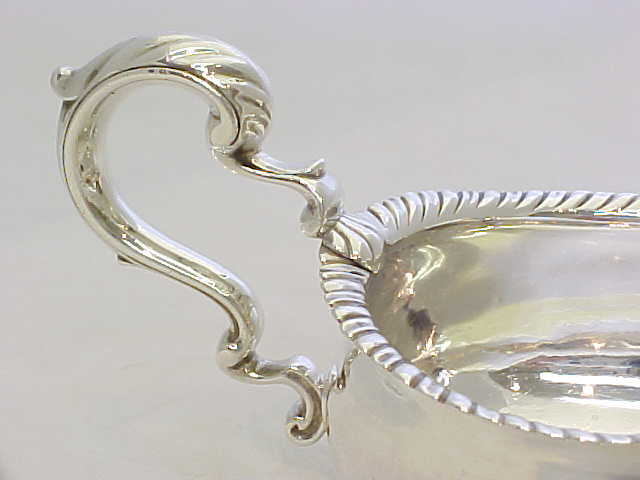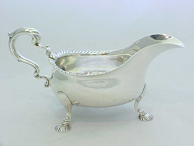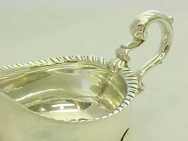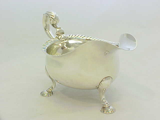 Large, heavy and superb quality Georgian silver sauce boat with a gadroon decorated top rim, leaf capped flying scroll handle and hollow cast shell feet. |