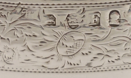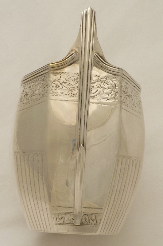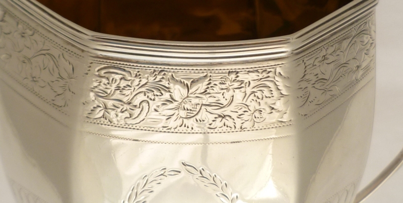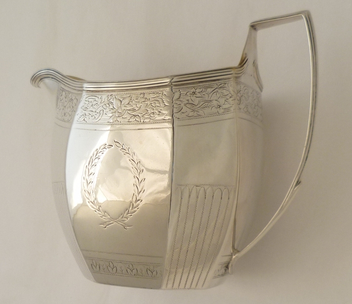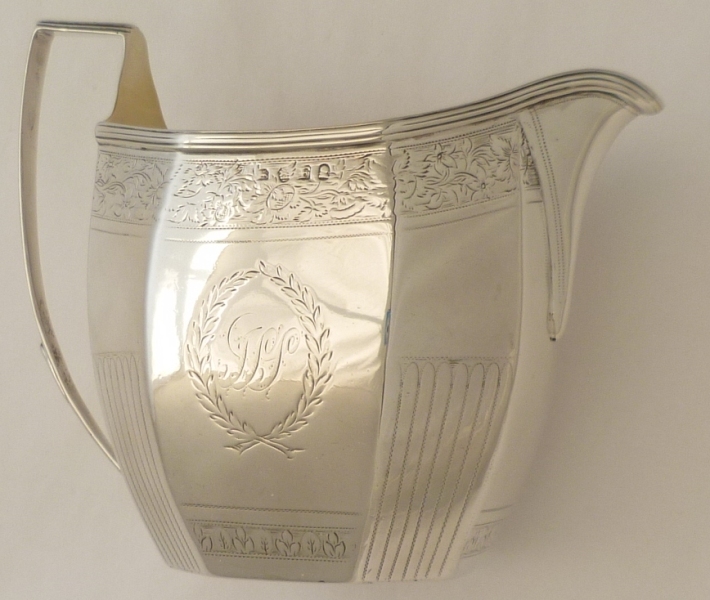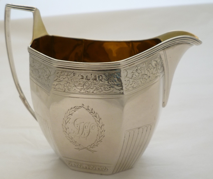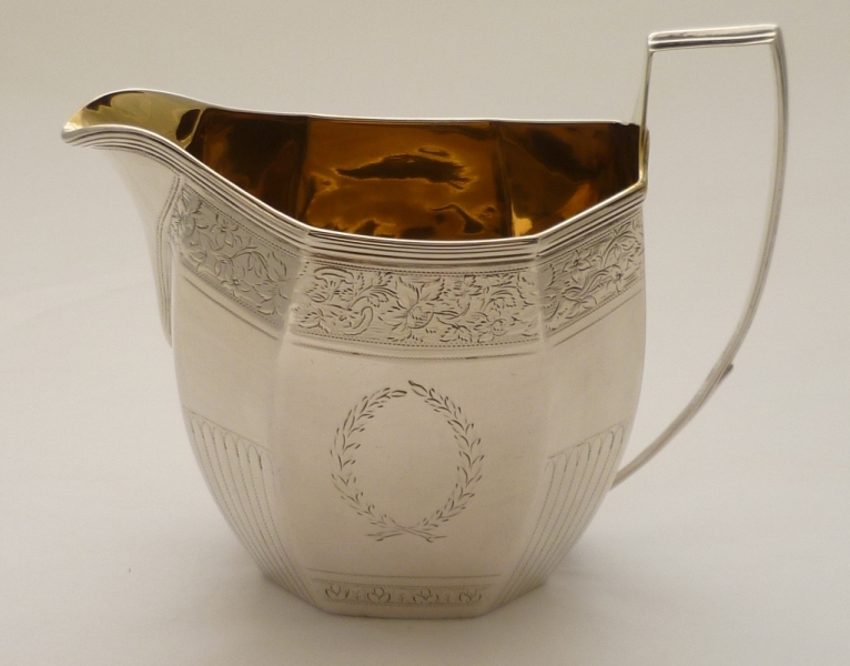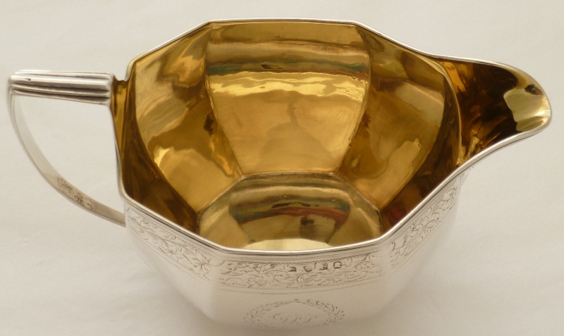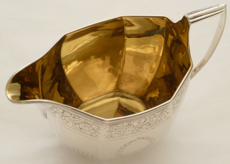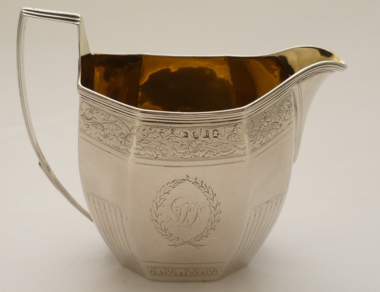 Very good Georgian silver cream jug with a beautifully gilded interior. Eight sided body with applied thread decorated handle and top rim above a deep floral and foliate engraved band. Laurel leaf engraved cartouche to each side, one with the original monogram engraving and the other blank, never erased. Below the plain central band alternate panels are flute engraved or floral and foliate engraved, all bordered by fine bright cut engraving. |