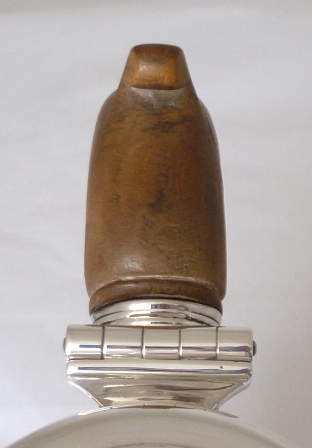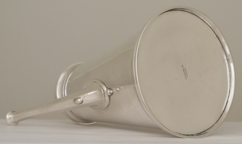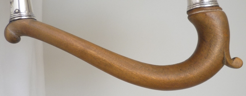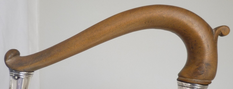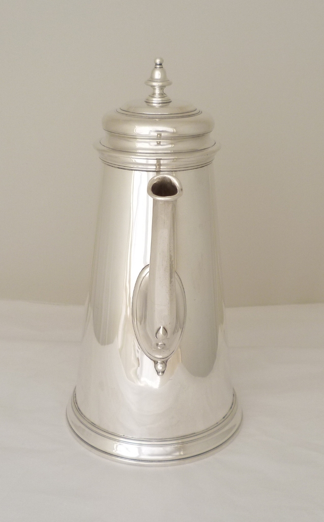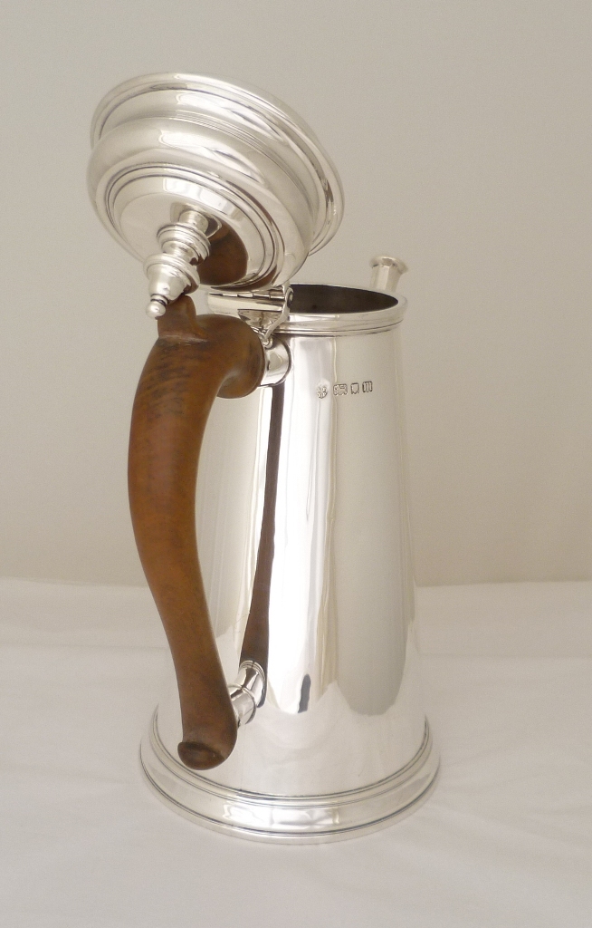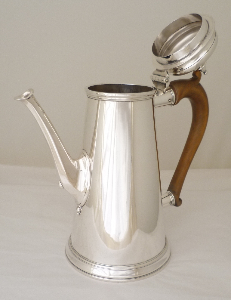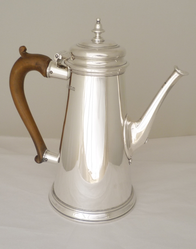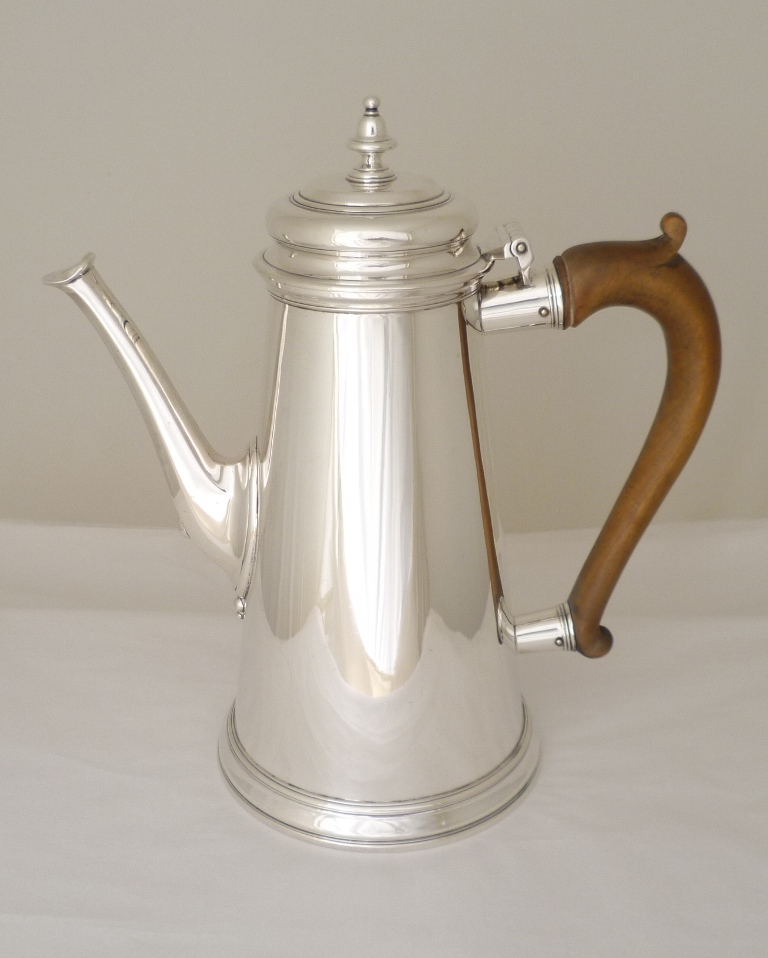 Substantial solid silver Georgian style coffee pot with a carved wood handle. |