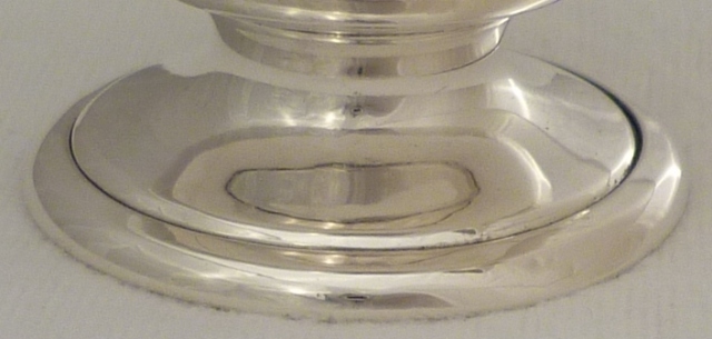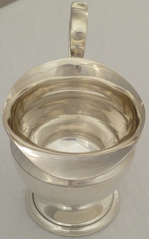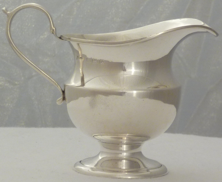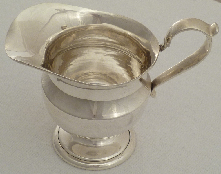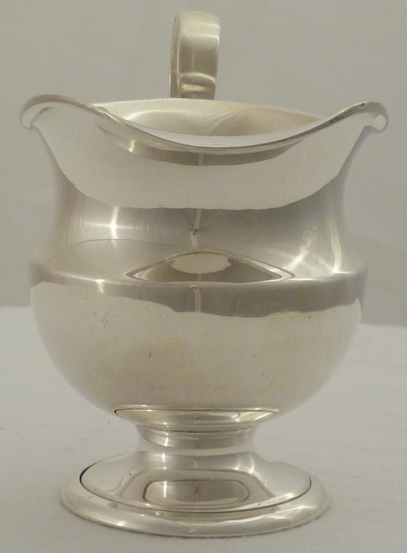 Small but rather stylish silver baluster cream jug with a ring turned circular pedestal foot, flying cap to the scrolling handle and a wide pouring lip. |