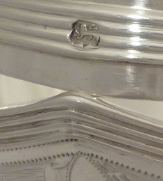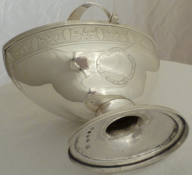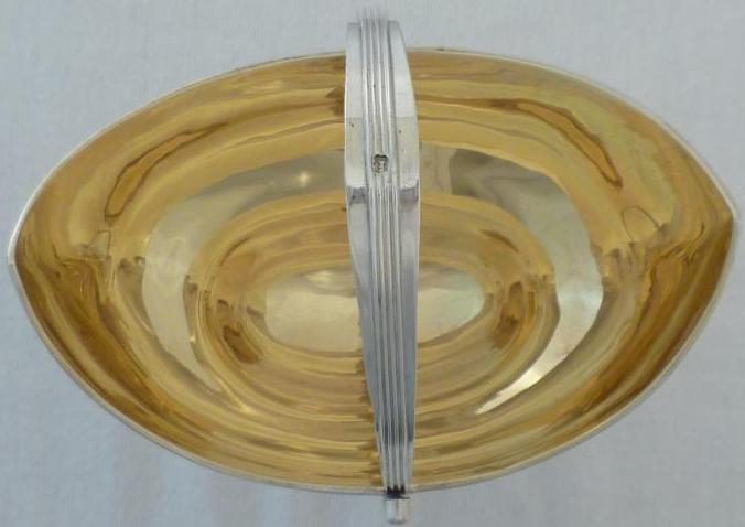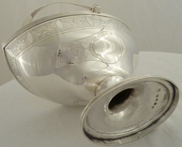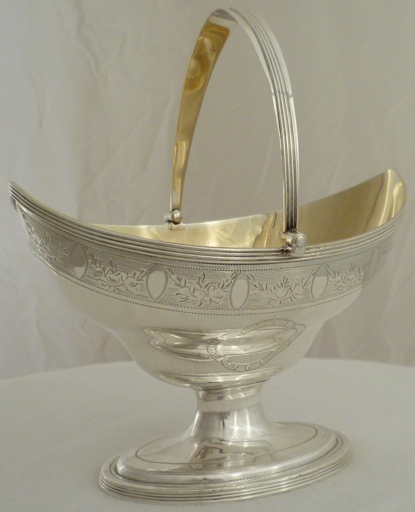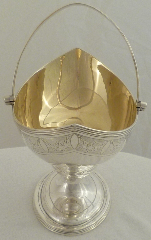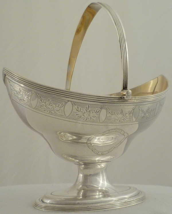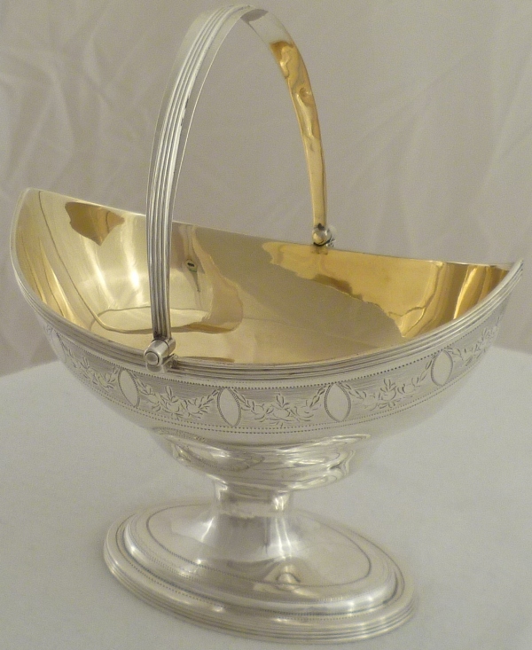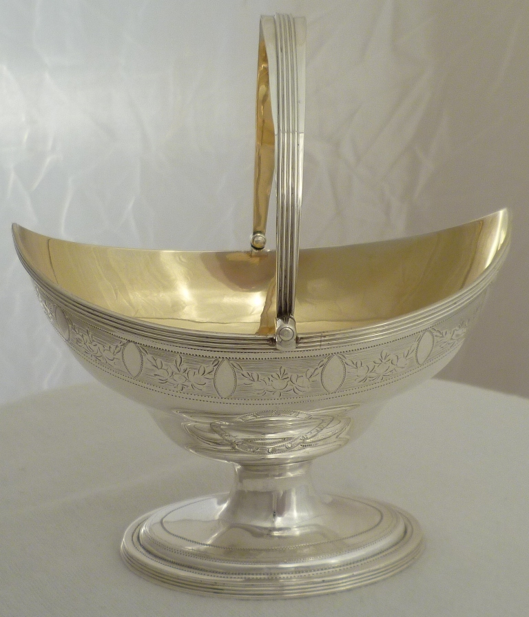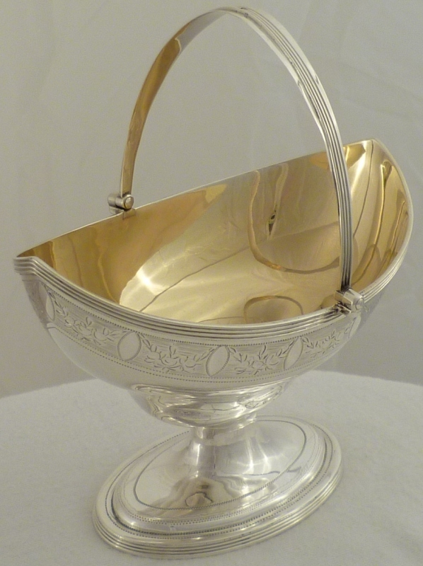 Georgian silver shaped navette form sugar basket with an oval pedestal foot, thread decorated swing handle and top rim above a bright cut band of fruiting festoons between blank oval cartouches on an engraved matt ground. Shaped cartouche to each side outlined with a matching band of decoration and a gilded interior. |