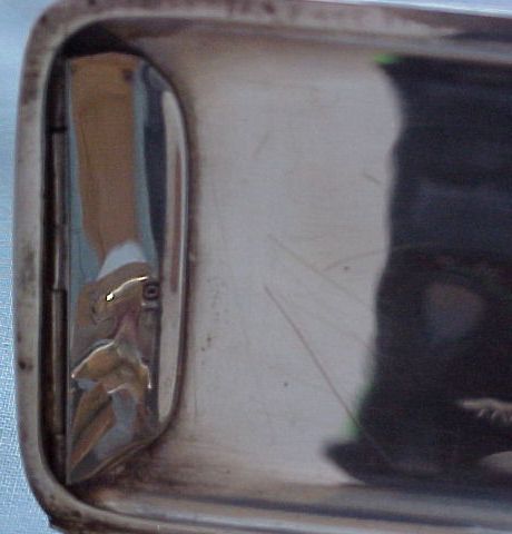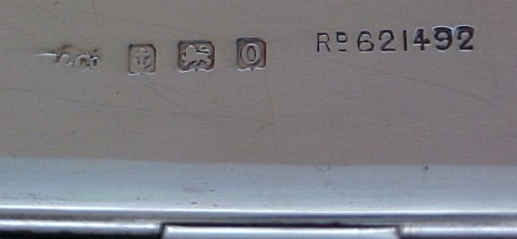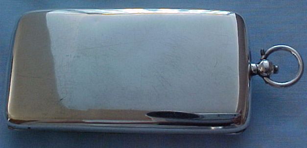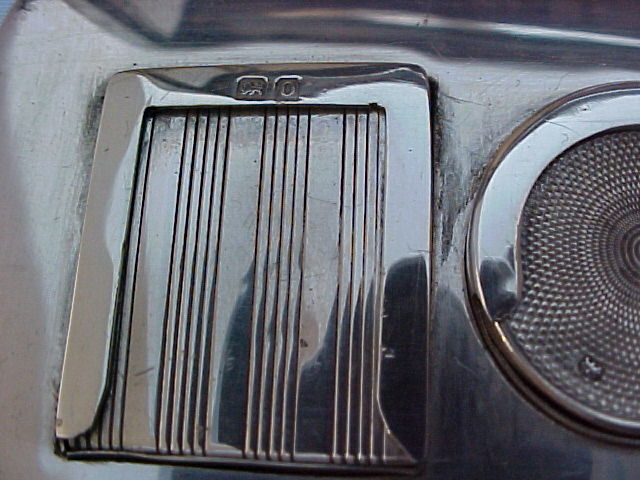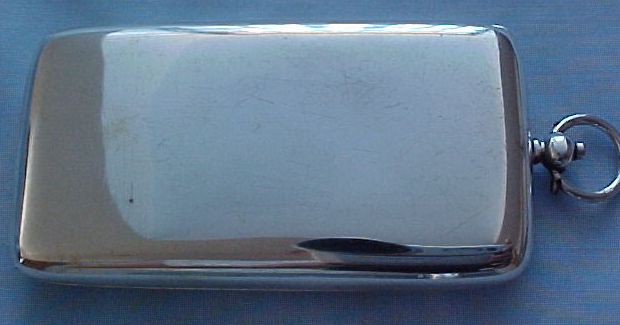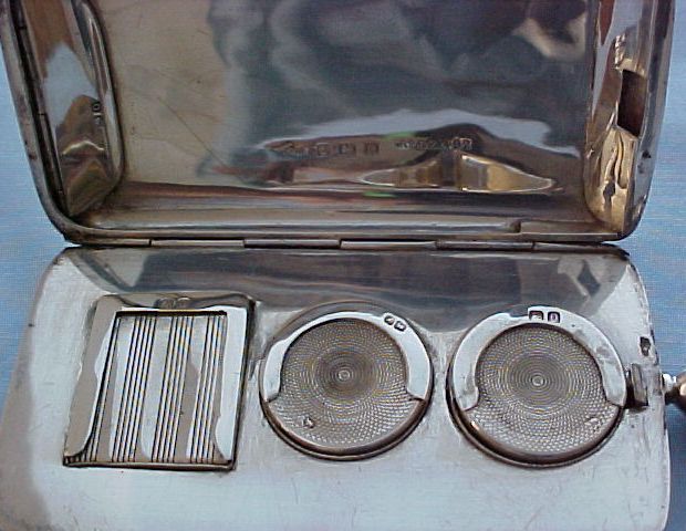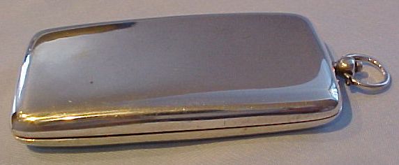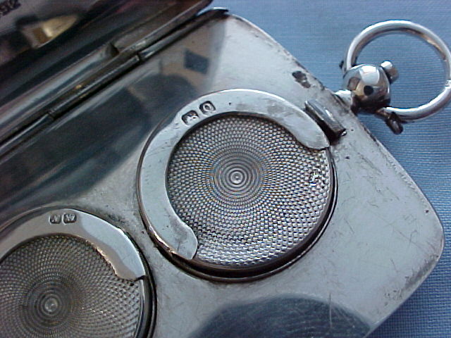 A silver double sovereign case also fitted as a stamp case and with the possibly unique feature of an extra clip in the lid. This extra and sprung clip would hold a folded bank note or perhaps the high value parcel post stamps of the day. The lid has a fiendishly clever one handed opening mechanism. The design registration number 621492 marked to the lid tallies with the date of manufacture and so this is an early example. | ||