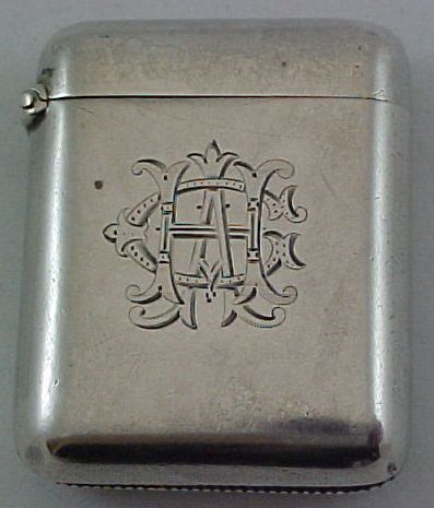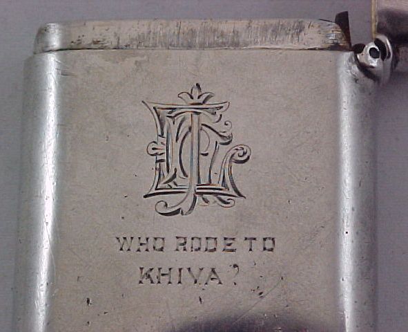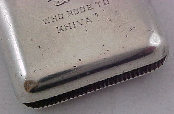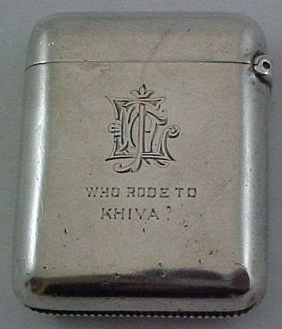 Victorian silver vesta case with internal gilding and, unusually, additionally hallmarked inside the lid. To the front is the first initial engraving 'CAH' and to the reverse is engraved a second set of initials and the inscription ' who rode to Khiva?' The question mark to the end is intriguing. Khiva is in Uzbekistan and so the riding was probably by horse but an early motorcycle is not out of the question. | ||
