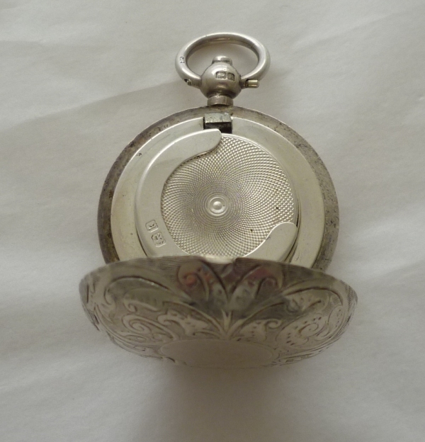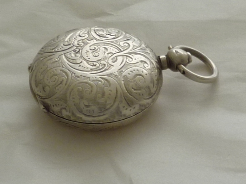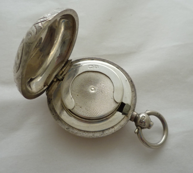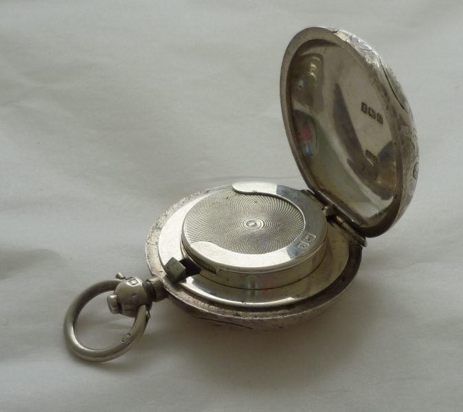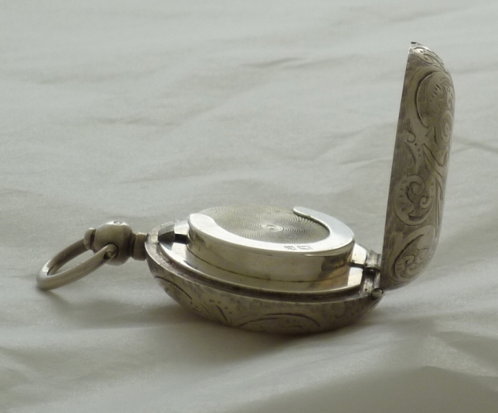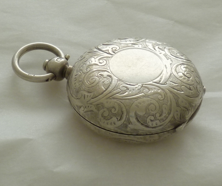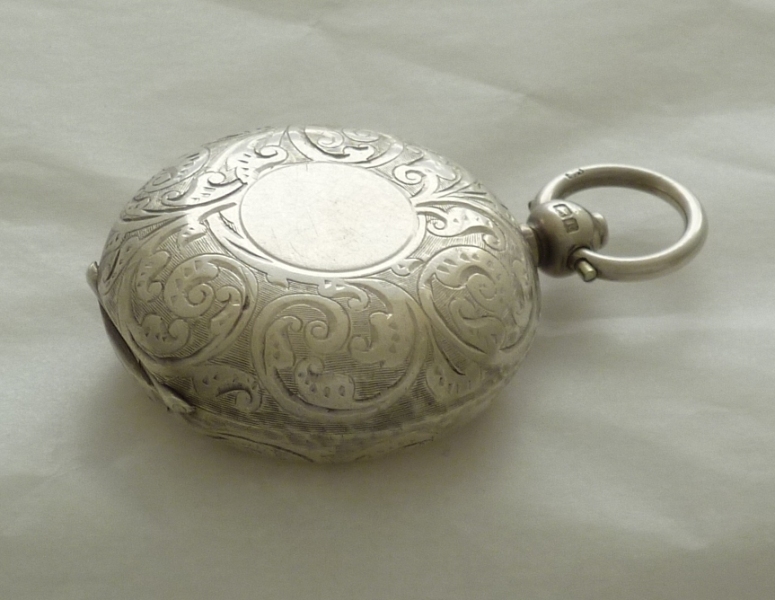 Perfect Edwardian silver sovereign case with foliate engraved decoration, suspension ring, blank circular cartouche and correctly hallmarked throughout. |
