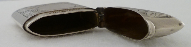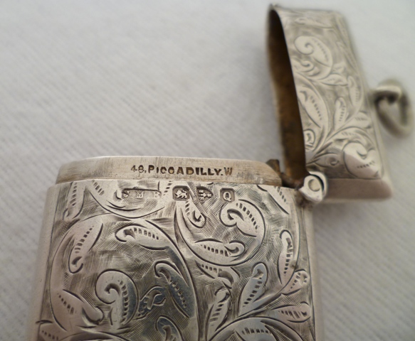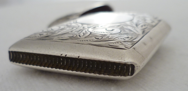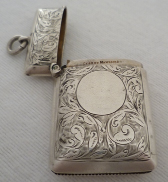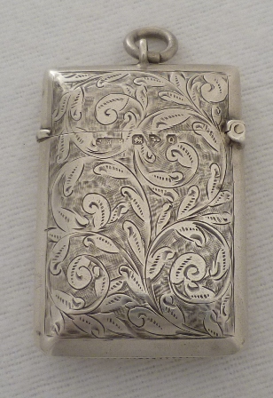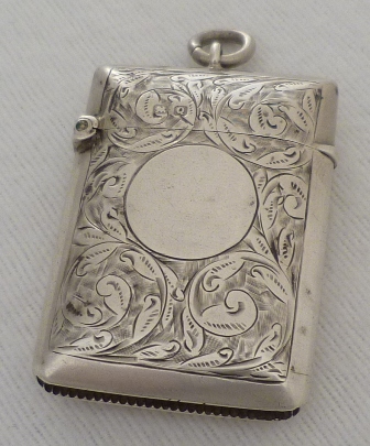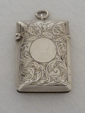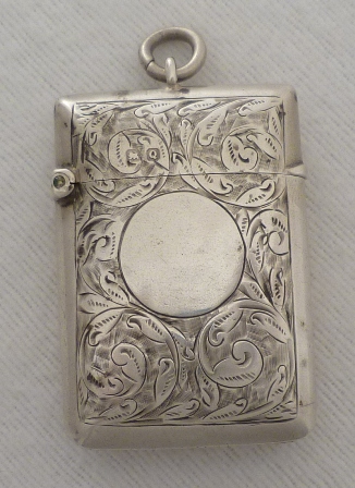 DESCRIPTION | Good quality Victorian silver vesta case with foliate engraved decoration, suspension loop and blank circular cartouche that has not been engraved or erased. |
