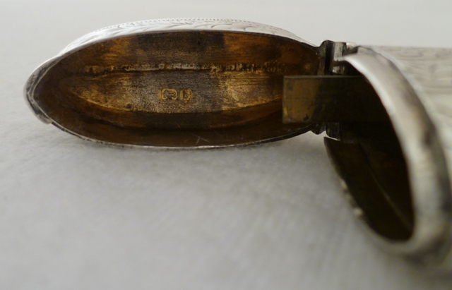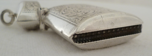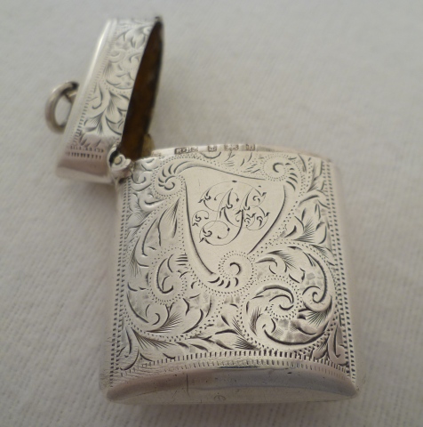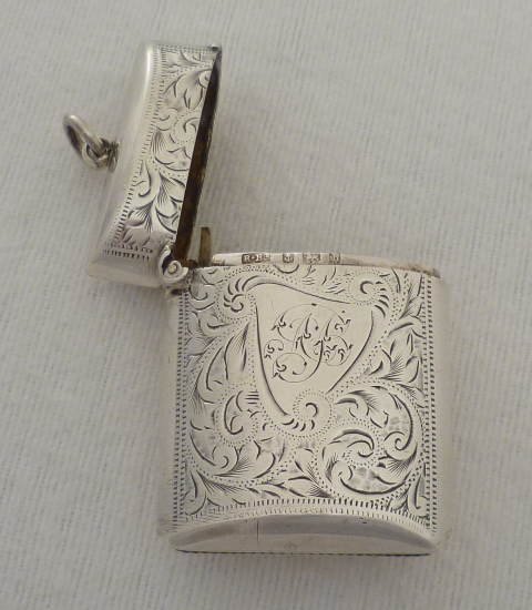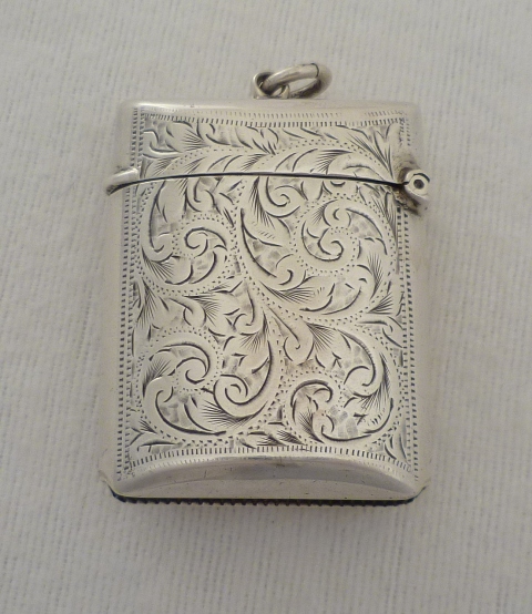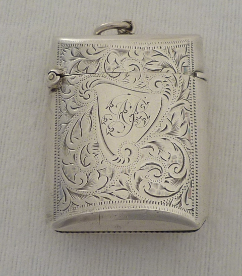 DESCRIPTION | Large Edwardian silver vesta case with engraved foliate decoration, monogram engraved cartouche and a silver strike. |