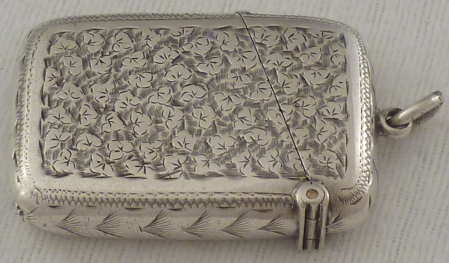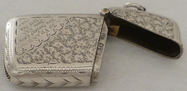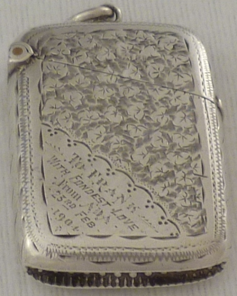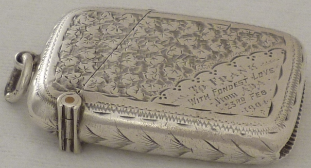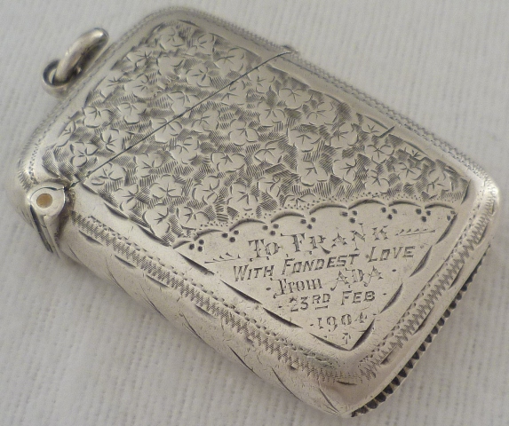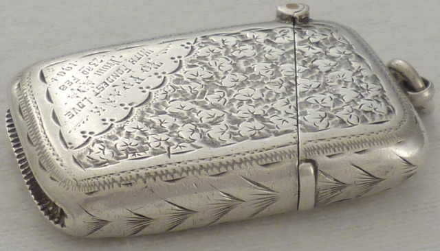 DESCRIPTION | Edwardian silver vesta case with a slant opening lid, foliate engraved decoration, presentation engraved corner cartouche, suspension loop and a silver strike. |