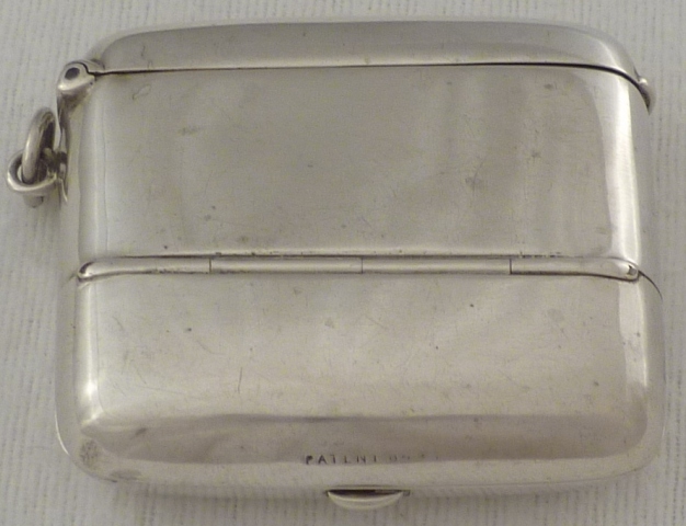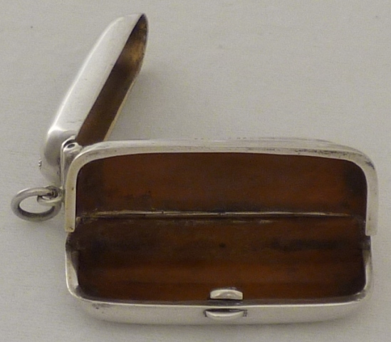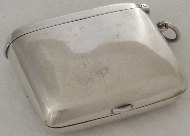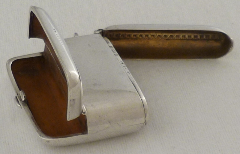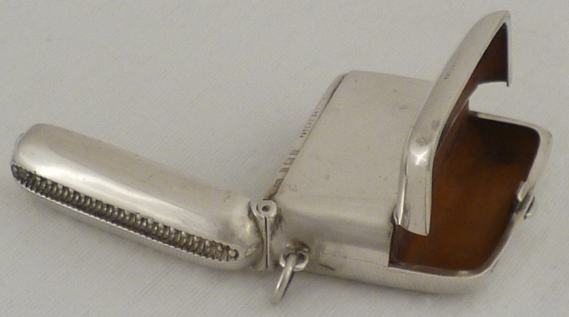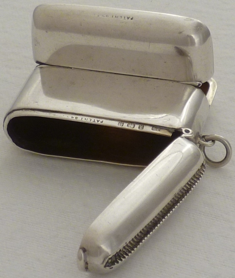 DESCRIPTION | Large Edwardian silver vesta case with a skin lined compartment for a cheroot holder, silver strike and suspension loop. |